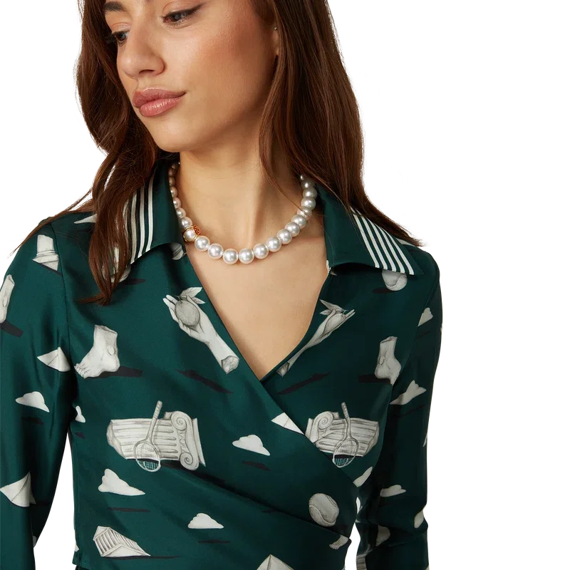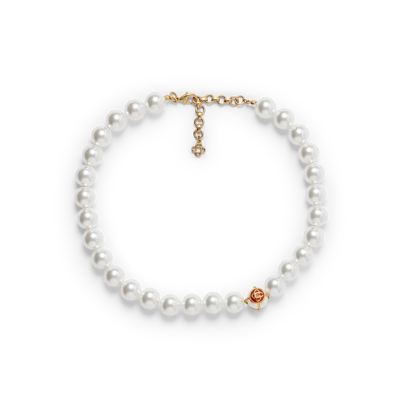 Colierul cu perle în cușcă este realizat din alamă placată cu aur și perle din sticlă artificială și prezintă logo-ul cu diamant caracteristic casei. Completat cu un lanț placat cu aur și închizătoare tip homar – această piesă vine cu o cutie cadou, o pungă de protecție cu sigla mărcii și o broșură cu detalii despre produs.