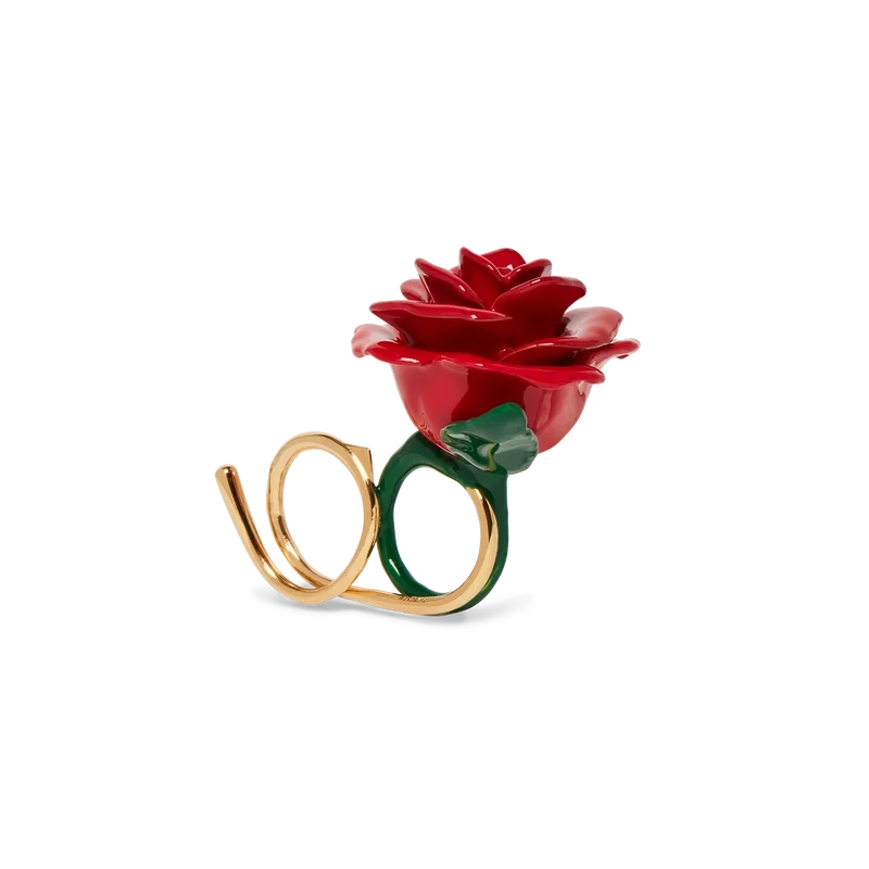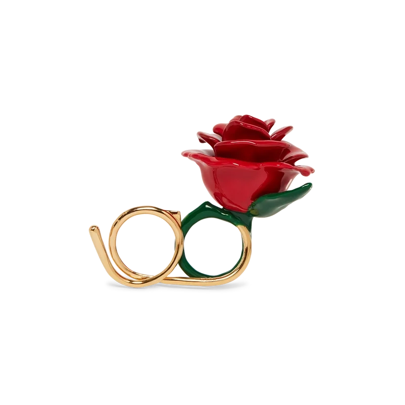 Inelul dublu Rose se inspiră din tatuajele subculturilor din Los Angeles. Realizat din email pictat manual și alamă placată cu aur. Trandafirul se transformă într-o verigă și se împletește în jurul degetelor pentru a forma un inel dublu.