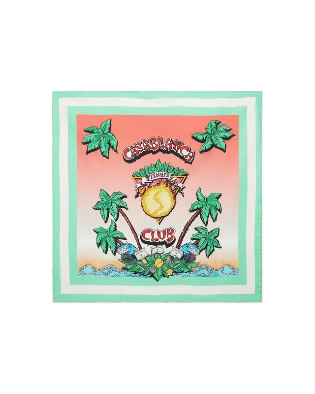 Eșarfa medie din mătase Tennis Club este un model imprimat, confecționat din țesătură de mătase twill, care prezintă grafica sezonieră a casei, reinterpretată într-o temă de surf, în stilul unui schiț grafic desenat cu markere. Completată cu o bordură cu dungi verzi și albe.