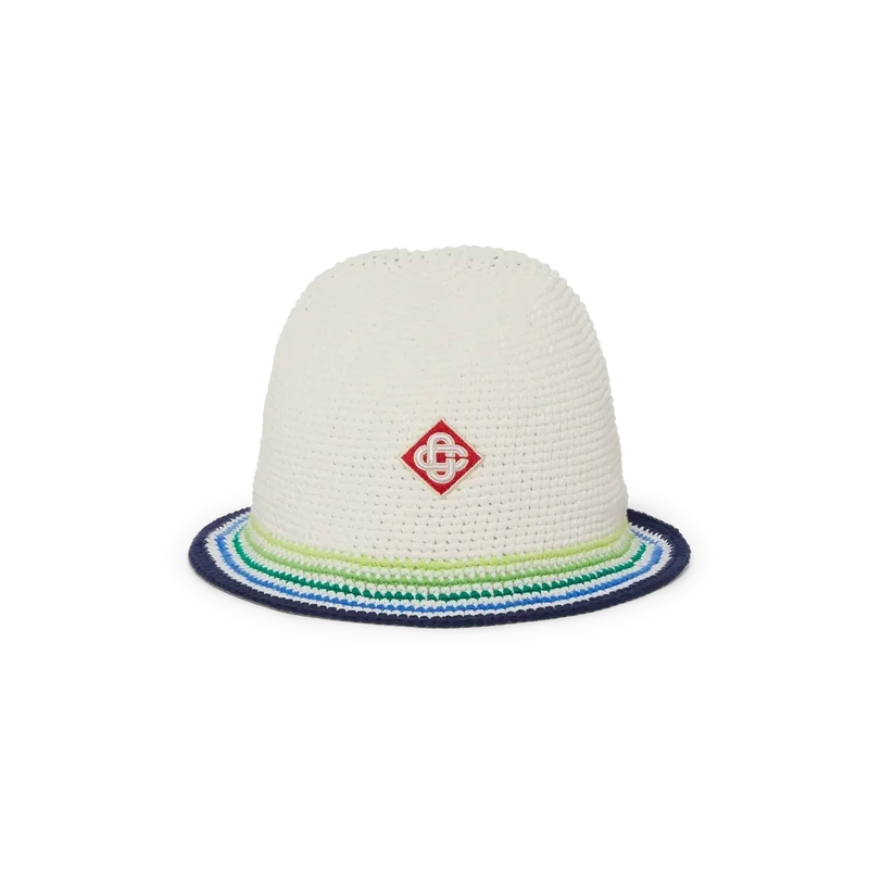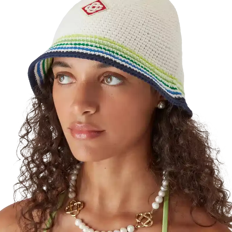 Șapca Beach Club este o șapcă rafinată în stil bucket, realizată din bumbac croșetat, cu logo-ul diamant caracteristic casei în centru. Completată cu o borură cu dungi albastre, verzi, galbene și albe.