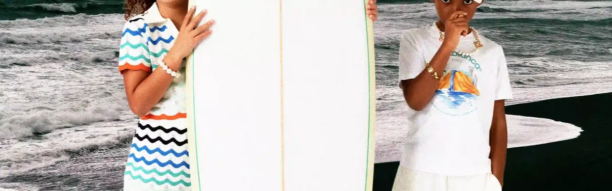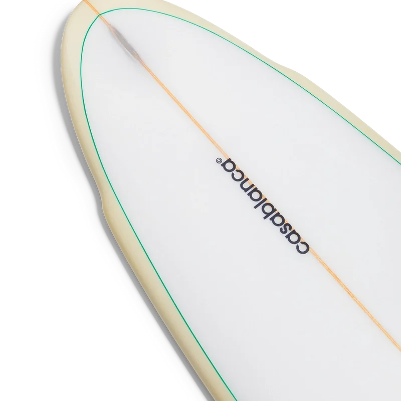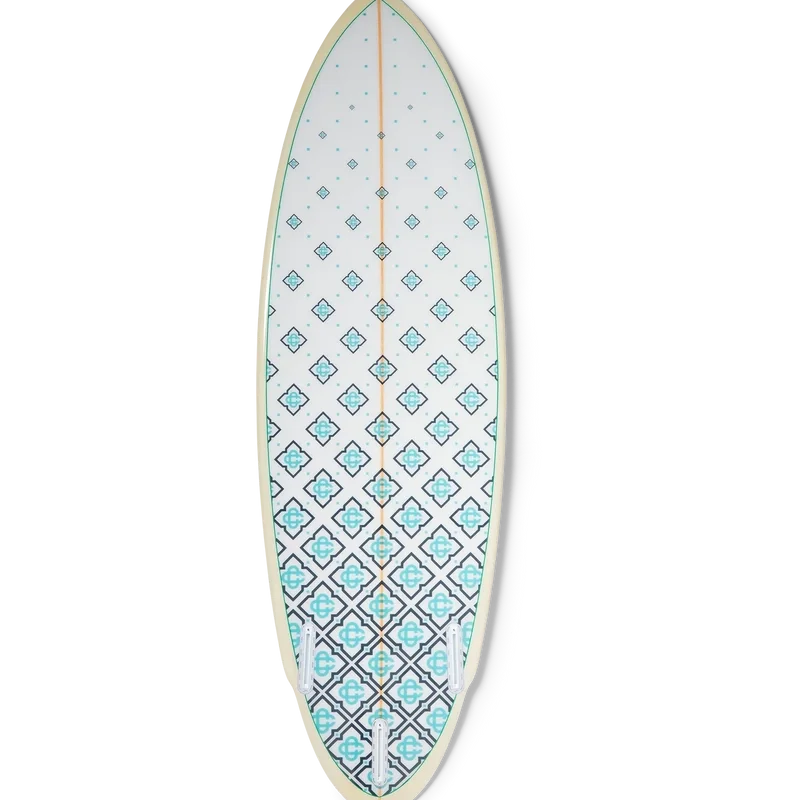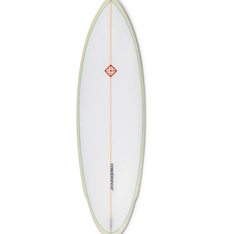 Placa de surf Casablanca este realizată din fibră de sticlă premium, spumă poliuretanică și rășină poliesterică și prezintă imprimeul monogramă degradată al casei pe partea inferioară și marca Casablanca cu logo-ul diamant caracteristic pe punte. Completată cu un stringer din lemn, o punte albă cu margine verde mentă și margini galben deschis. Placa de surf Casablanca măsoară 178,2 cm (de la vârf la coadă) x 53 cm (de la margine la margine în punctul cel mai lat). Acest articol nu este livrat cu aripioare sau leash.