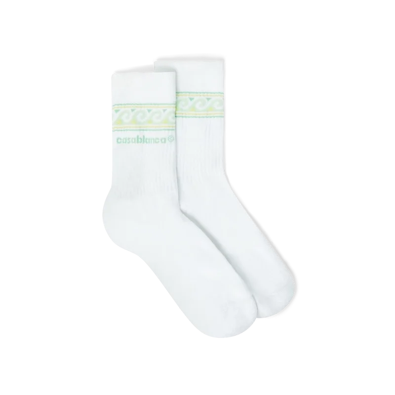 Șosetele sportive tricotate cu valuri au un design sportiv rafinat, cu o bordură în formă de valuri în culori verde și galben, inspirată de modelele ritmice ale valurilor oceanului care se întâlnesc cu țărmurile plajelor imaculate. Acest design întruchipează estetica Beach Club a casei de modă prin motive sofisticate de valuri redate pe o construcție tricotată de calitate superioară. Completate cu manșete cu nervuri și construcție întărită la călcâi și vârf.