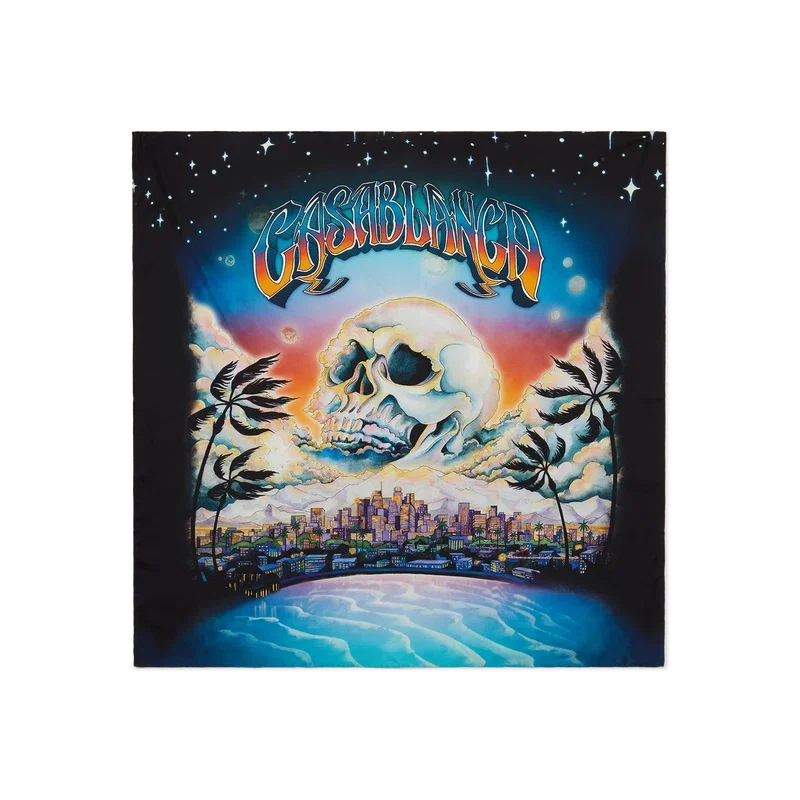 Eșarfa mare din mătase La Pramonition are un design imprimat, fiind confecționată din țesătură de mătase twill. Prezintă ilustrația sezonieră a casei, o viziune misterioasă a orizontului orașului La pe timp de noapte, cu elemente OZN care fac referire la inspirația sci-fi vintage. Eșarfa este completată de o bordură neagră.