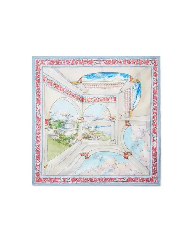 Eșarfa mare din mătase Le Passage are un design imprimat multicolor, realizat din țesătură de mătase twill, cu opera de artă sezonieră a casei. Completată cu o bordură cu dungi.