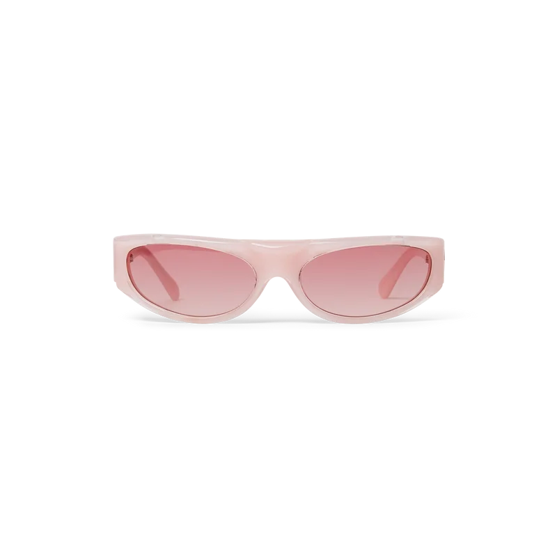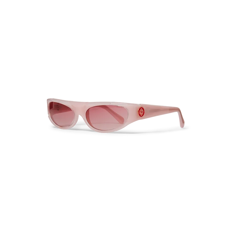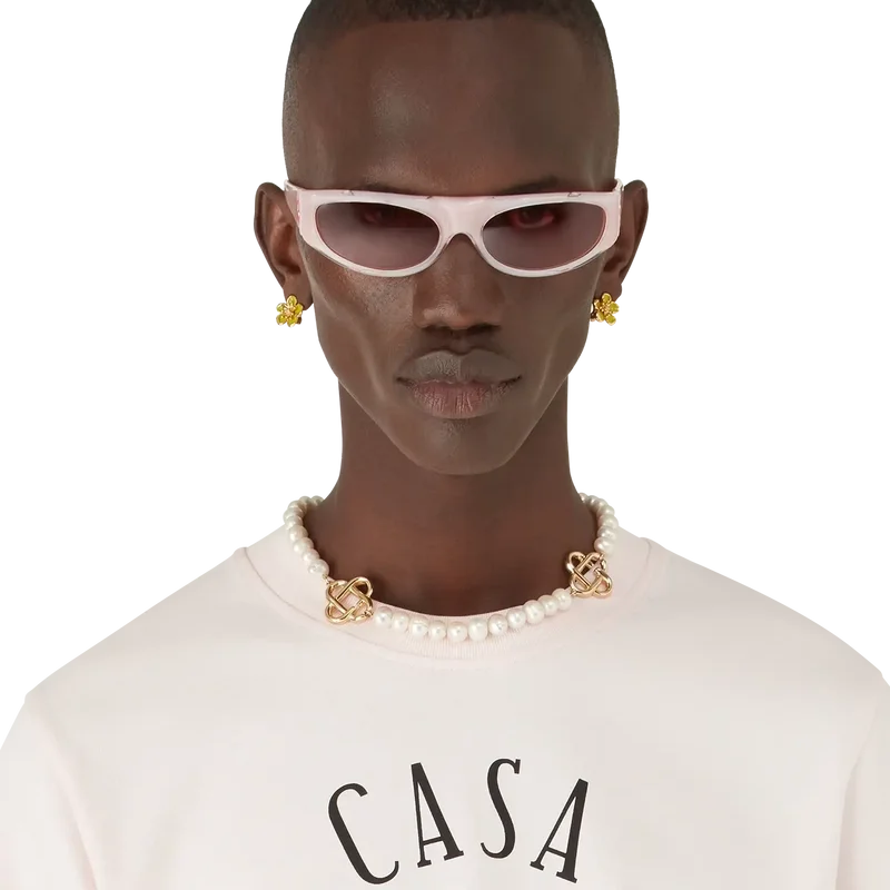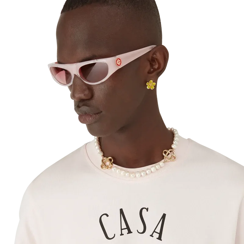Ochelarii de soare sport roz au o ramă de formă dreptunghiulară realizată din acetat. Modelul prezintă logo-ul CC interconectat al casei pe brațe. Lentilele de culoare roz sunt protectoare, iar modelul este completat de o cutie Casablanca, o cârpă de curățare și un carnet de garanție.