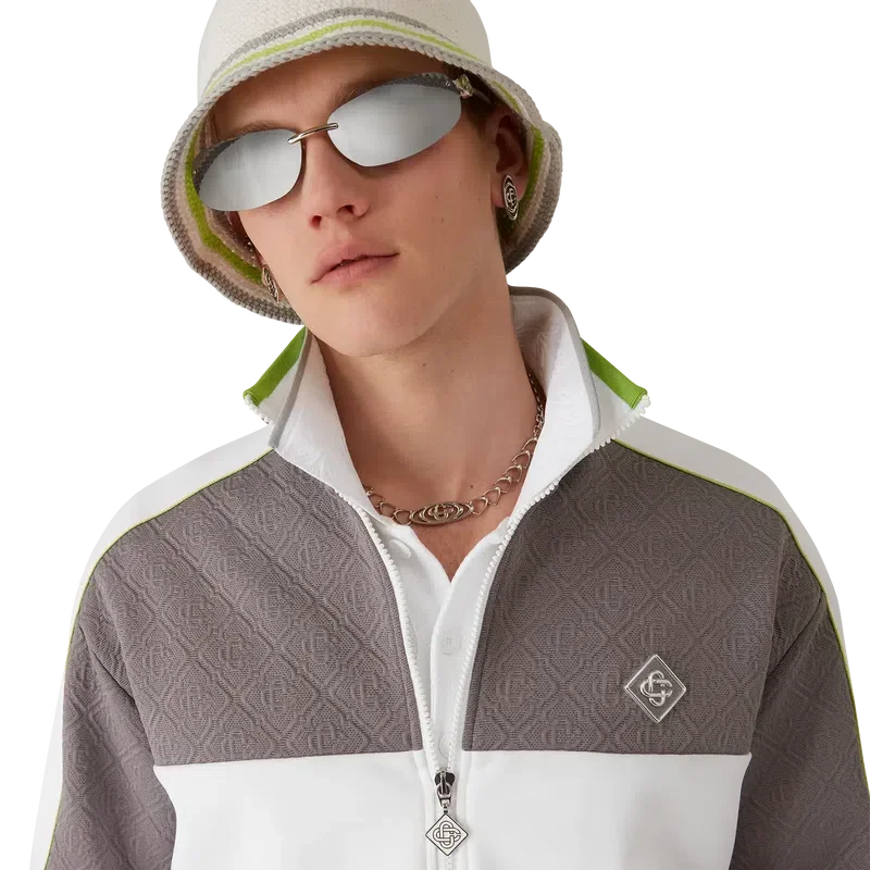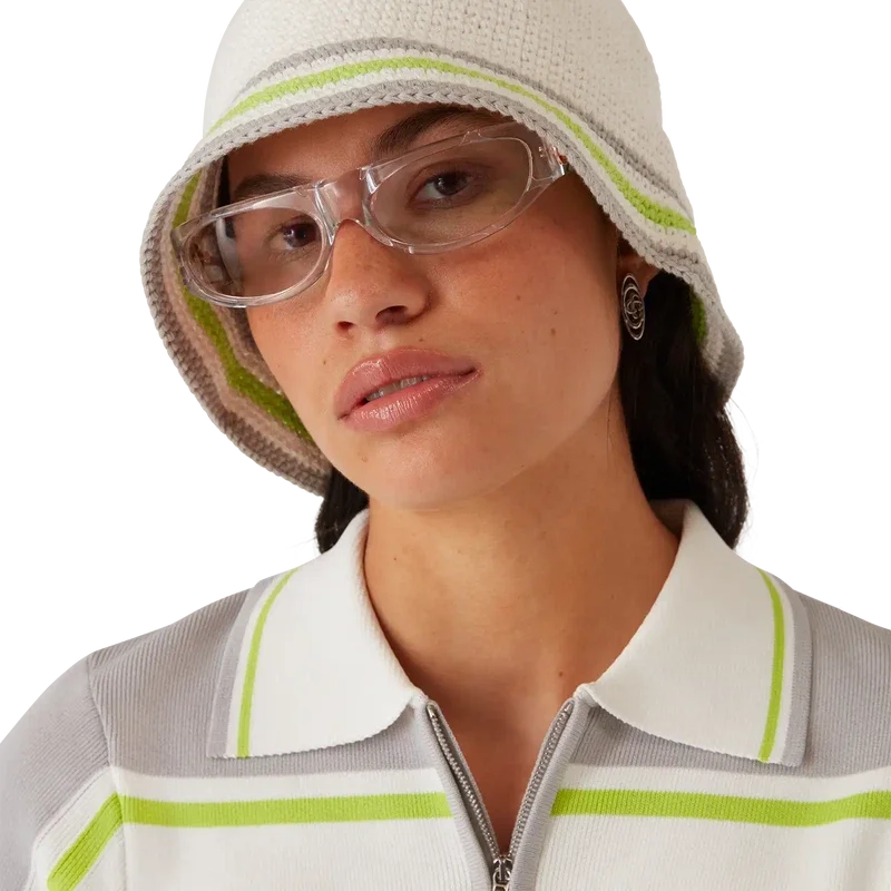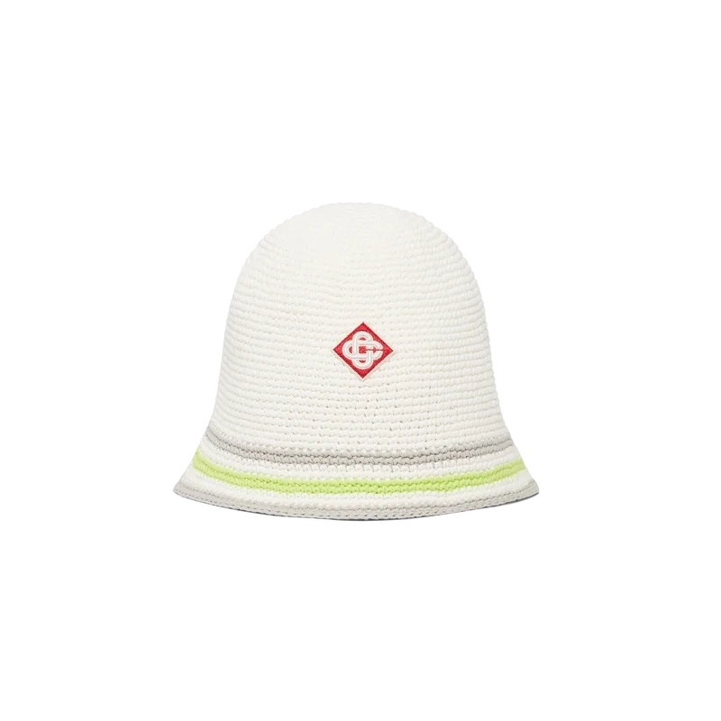 Pălăria croșetată cu dungi are o siluetă clasică de tip bucket, fiind confecționată dintr-o țesătură de bumbac croșetată cu textură moale și țesătură deschisă – un articol indispensabil pentru vară. Este completată de o borură cu dungi verzi, gri și albe și de o aplicație cu logo-ul Casablanca Glass în centru.