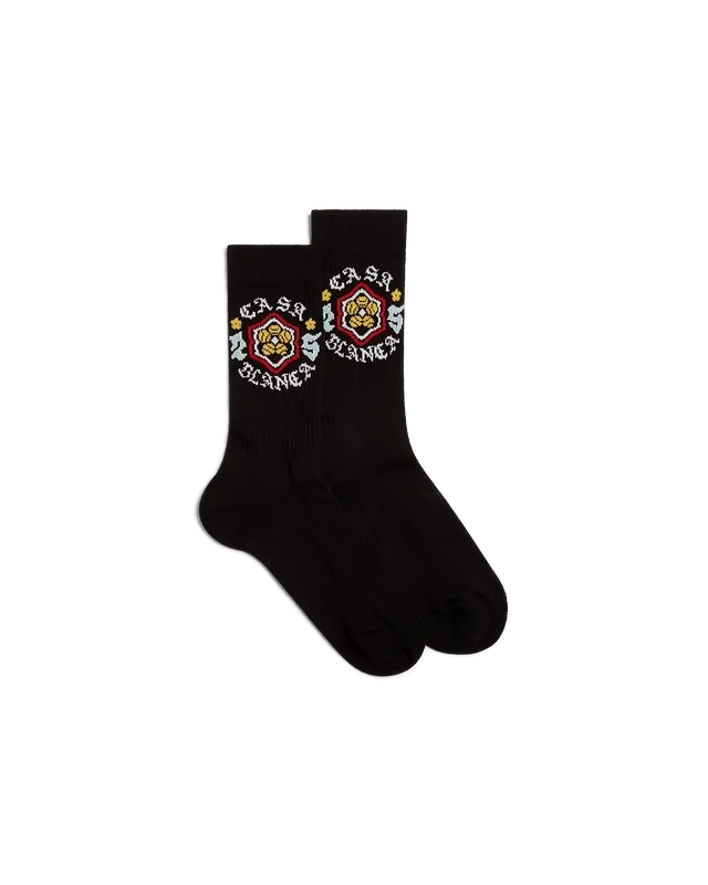 Șosetele Emblem au un design sportiv, sunt confecționate dintr-un material din amestec de bumbac și prezintă un motiv sezonier cu logo-ul Casablanca – ne-am inspirat din subcultura japoneză pentru una dintre temele noastre principale. Au manșete și margini cu nervuri.