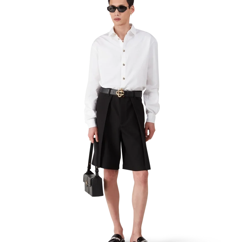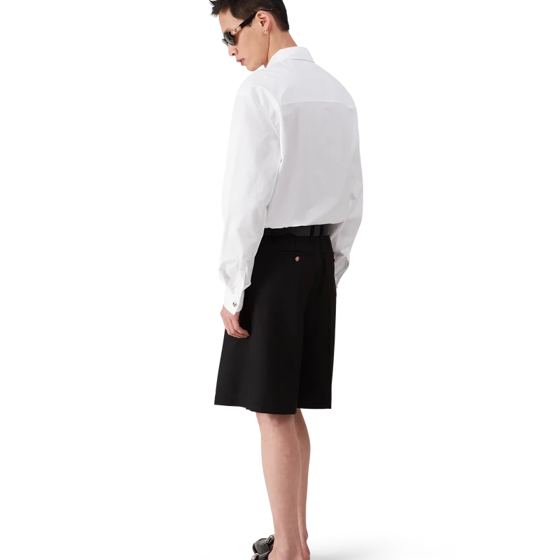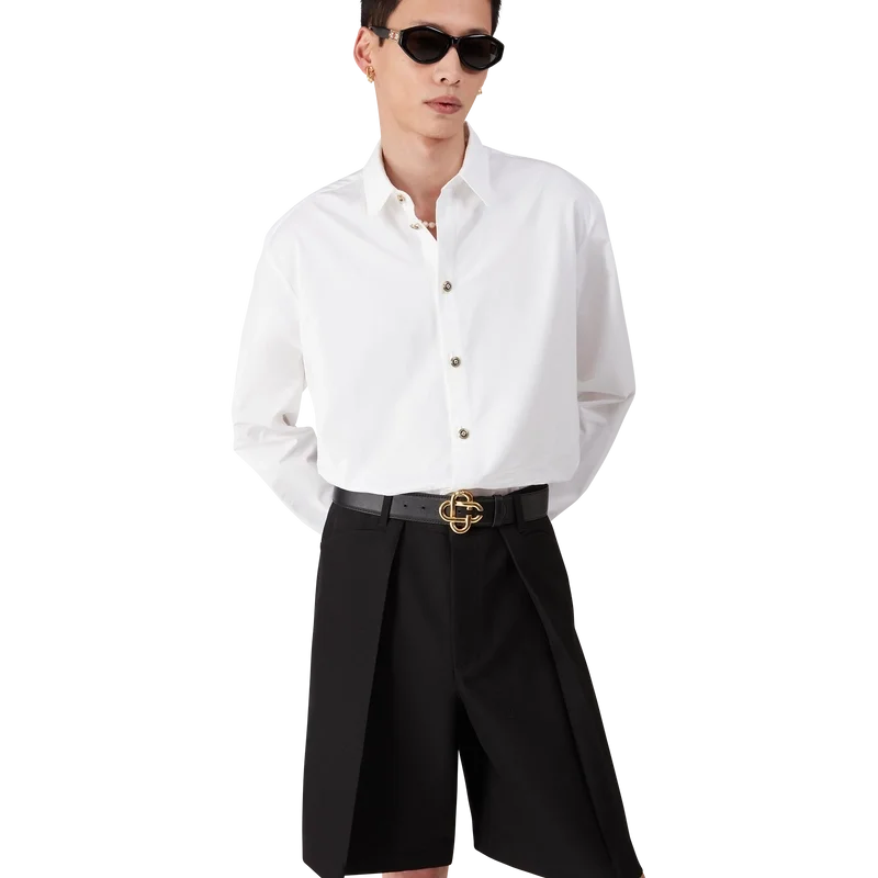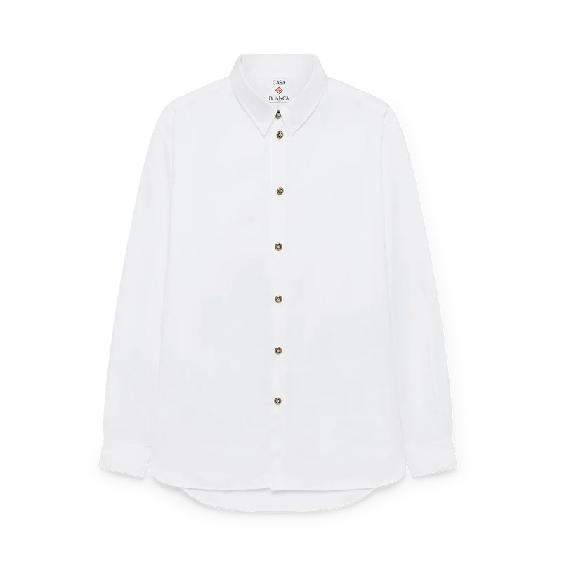 Cămașa albă din bumbac este un model cu mâneci lungi, confecționată din țesătură de bumbac pentru cămăși. Prezintă guler în V, închidere cu nasturi, nasturi din email cu tijă plată și tiv curbat.