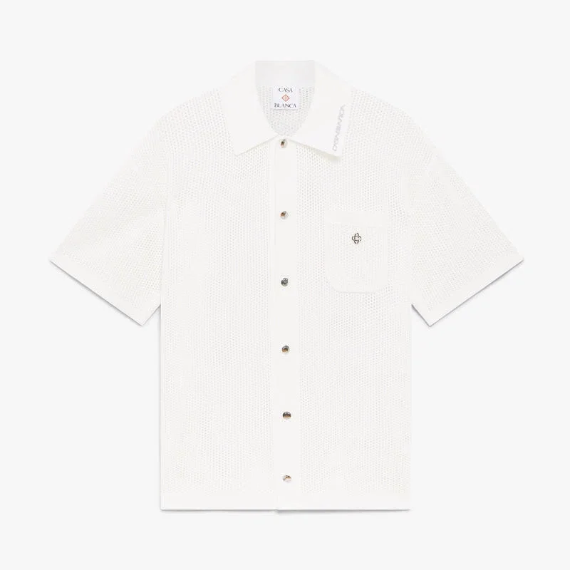 Cămășa albă din plasă cu mâneci scurte are un design rafinat, întruchipând abordarea sofisticată a casei de modă în materie de îmbrăcăminte casual. Este prevăzută cu guler, închidere cu nasturi, nasturi cu margine aurie și perle, caracteristici ale casei de modă, și un buzunar la piept cu logo-ul casei de modă.