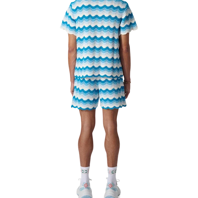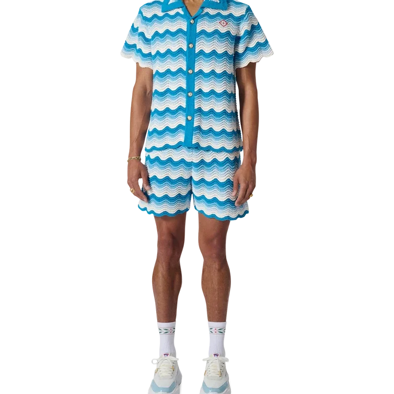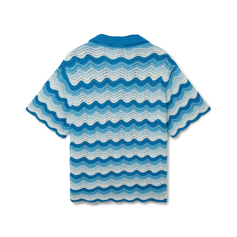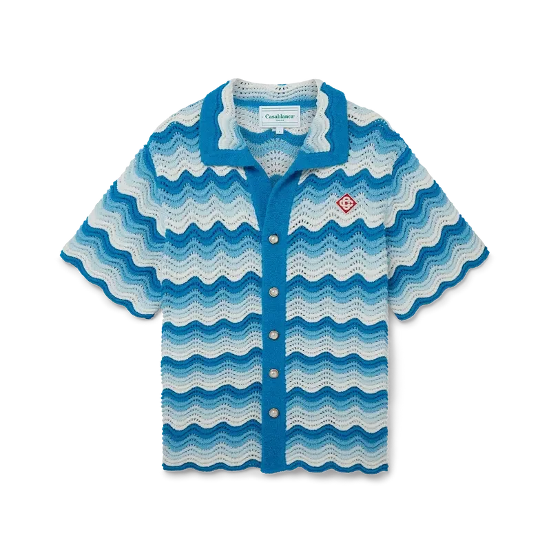 Cămășa cu gradient ondulat este un model emblematic Casablanca, confecționată dintr-un material croșetat cu textură moale și țesătură deschisă, în nuanțe de albastru – piesa esențială a verii. Finisată cu închiderea noastră emblematică cu nasturi aurii perlați, guler deschis, mâneci scurte și etichetă cu marca Casablanca Paris – concepută pentru a fi purtată cu o croială clasică.