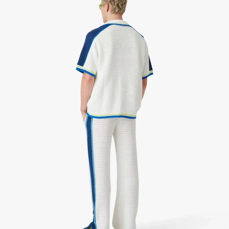 Cămașa croșetată cu pantaloni scurți, albă și albastră, are un design rafinat, realizată dintr-o țesătură cu ochiuri largi, cu detalii în dungi pe umeri și mâneci. Este completată de un guler în stil cubanez, închidere cu nasturi, nasturii cu margine aurie și perle, semnătura casei, manșete, tiv și guler cu nervuri, cu detalii în dungi la margini, și un buzunar la piept.