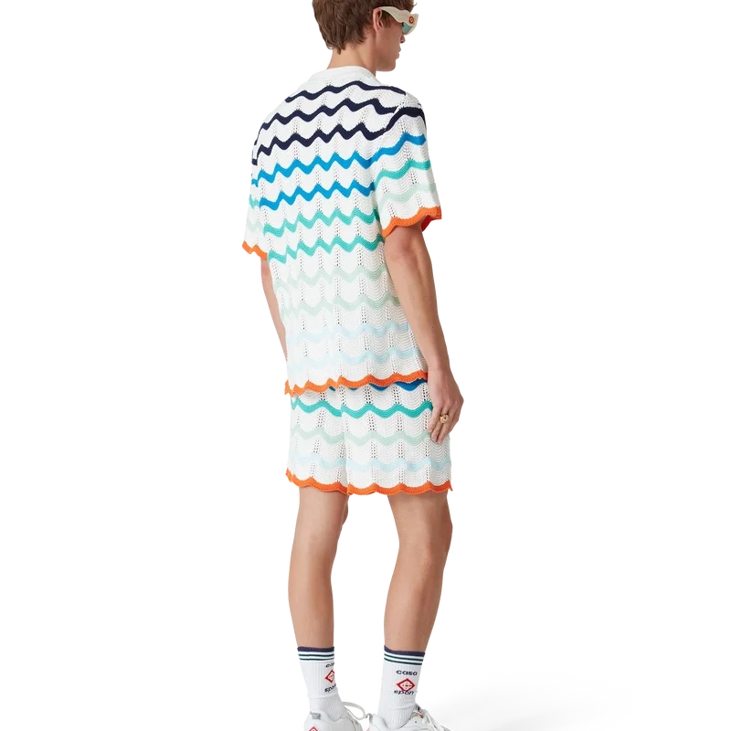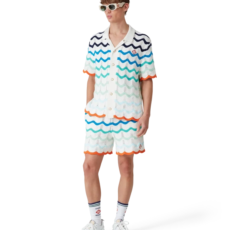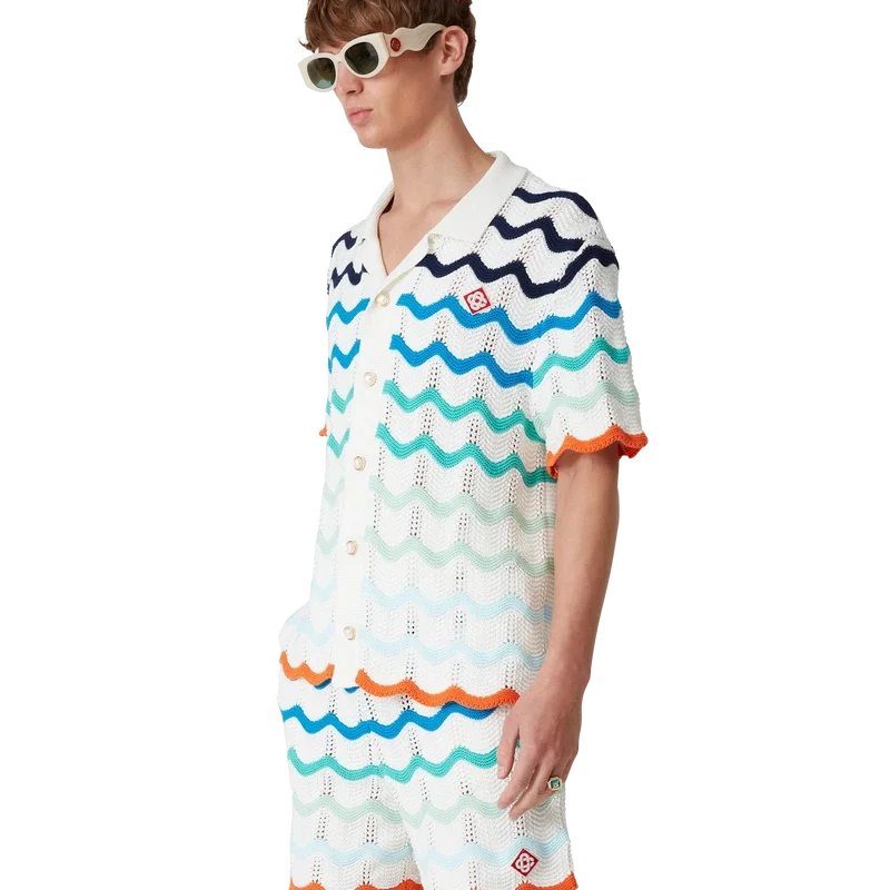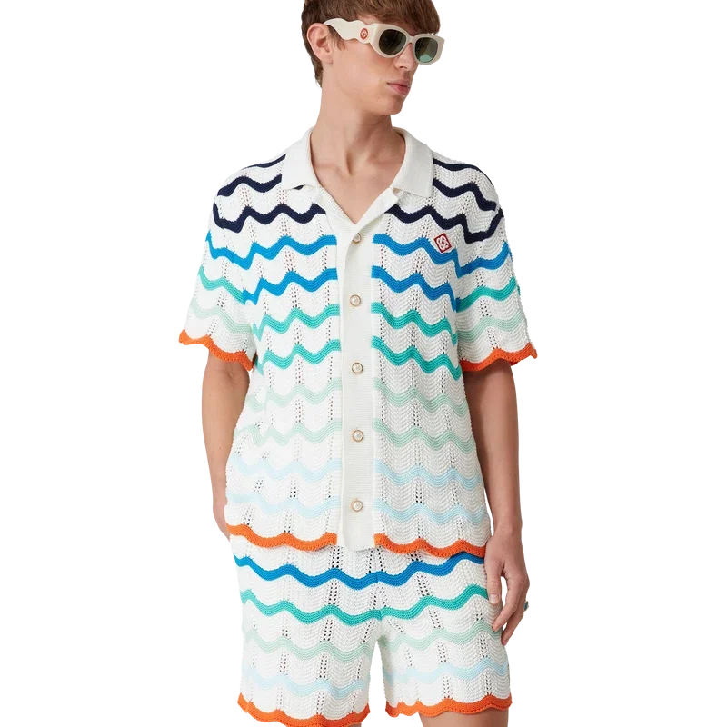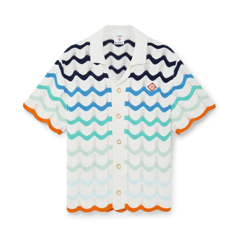 Cămășa cu croșetat în valuri degradate este un model cu mâneci scurte, confecționat din țesătură de bumbac cu croșetat în valuri degradate, prezentând elementul de design al casei inspirat de valurile din Memphis, în culori degradate, care se leagă de tema de călătorie și vacanță a colecției capsulă. Completată cu închidere cu nasturi în față, nasturi cu margine aurie și perle, guler și placket din tricot rib, precum și detalii contrastante la manșete și tiv.