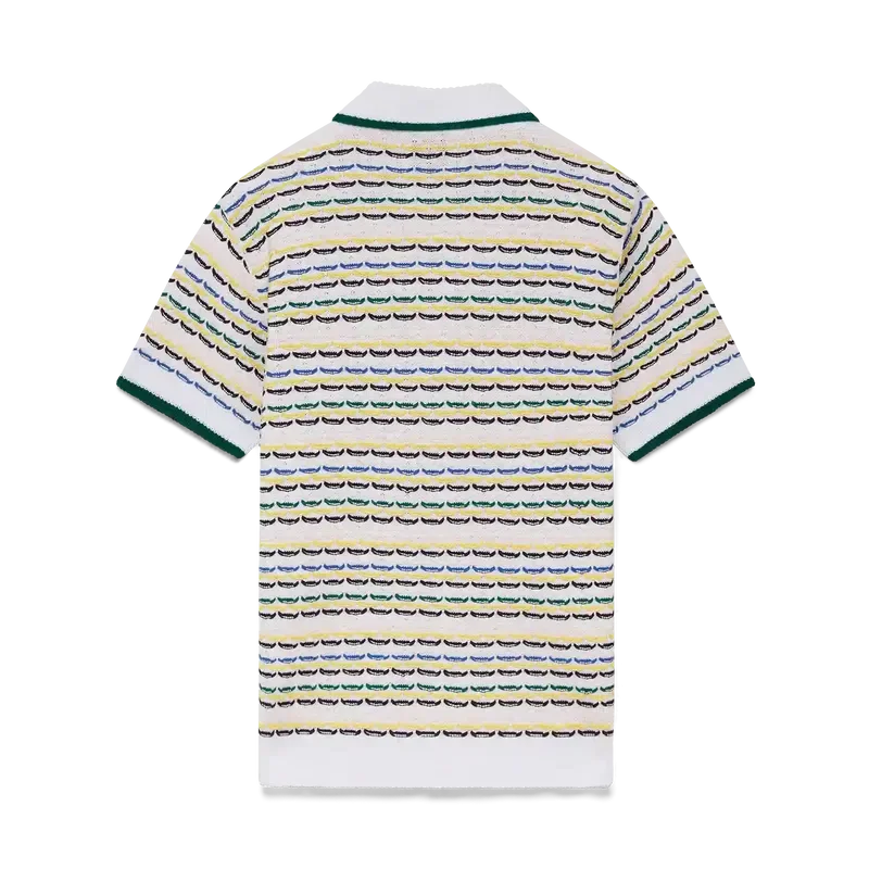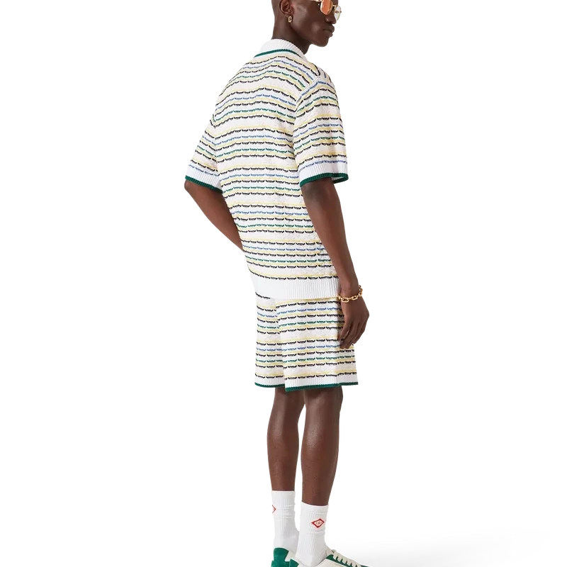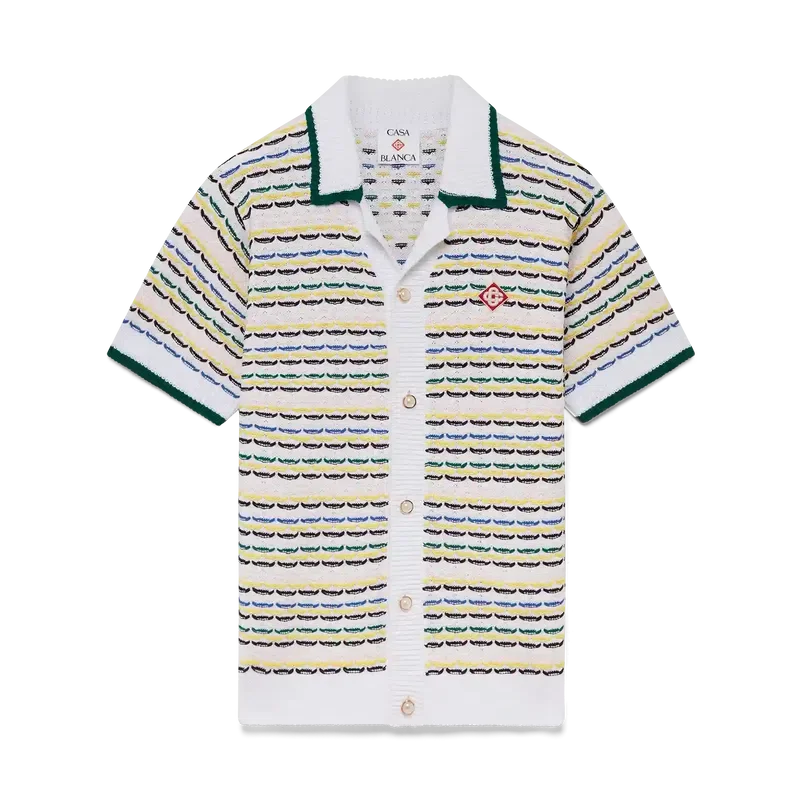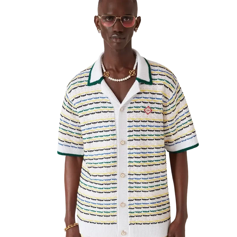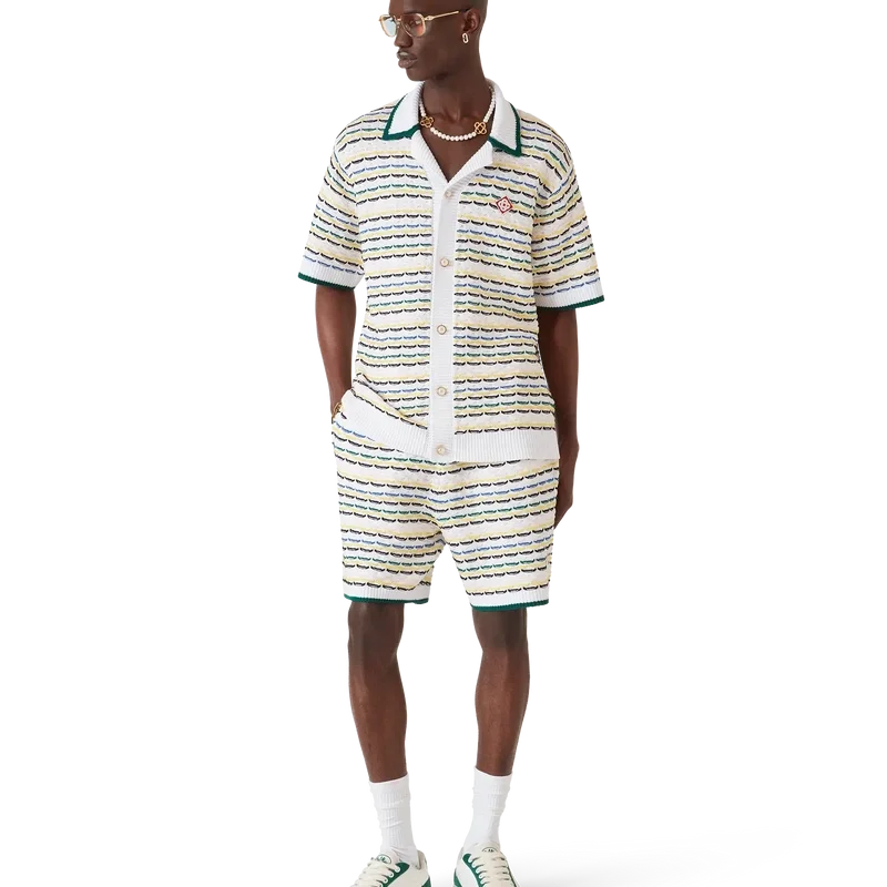 Cămașa Tuck Stitch este un model tricotat cu mâneci scurte, care prezintă logo-ul diamant caracteristic al casei. Completată cu guler în stil cubanez, închidere cu nasturi, nasturi cu margini aurii și perle, precum și detalii cu nervuri la guler, manșete, tiv și placket. Concepută pentru a fi purtată cu pantalonii scurți Tuck Stitch asortați.