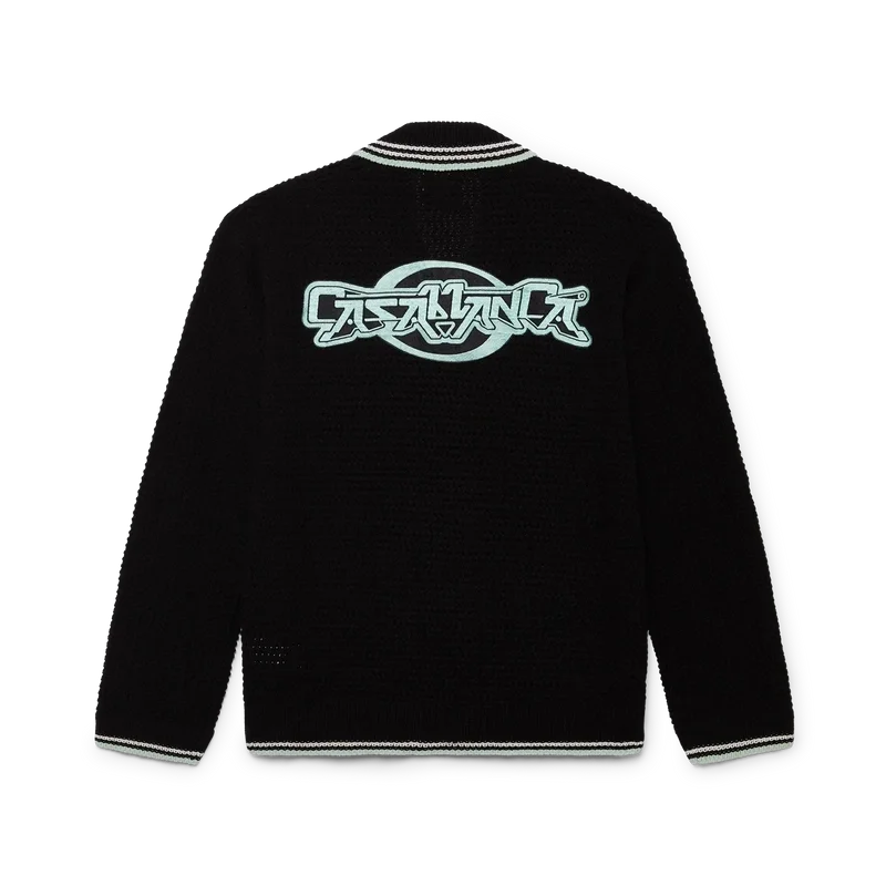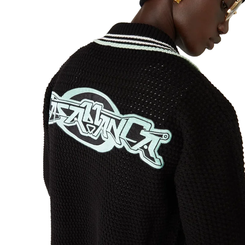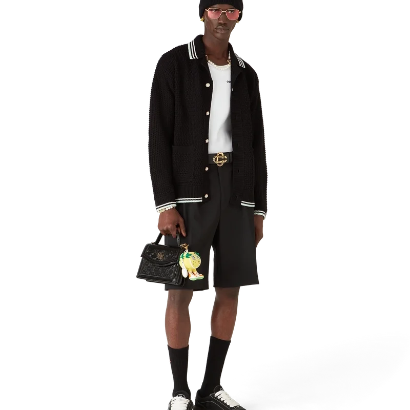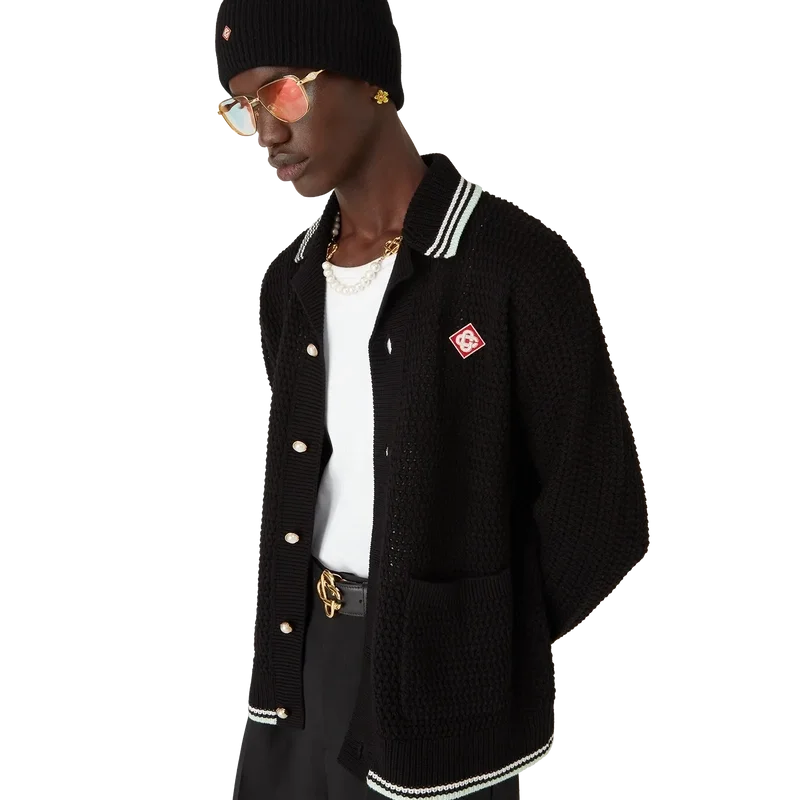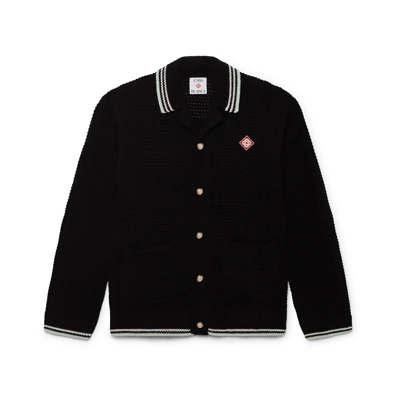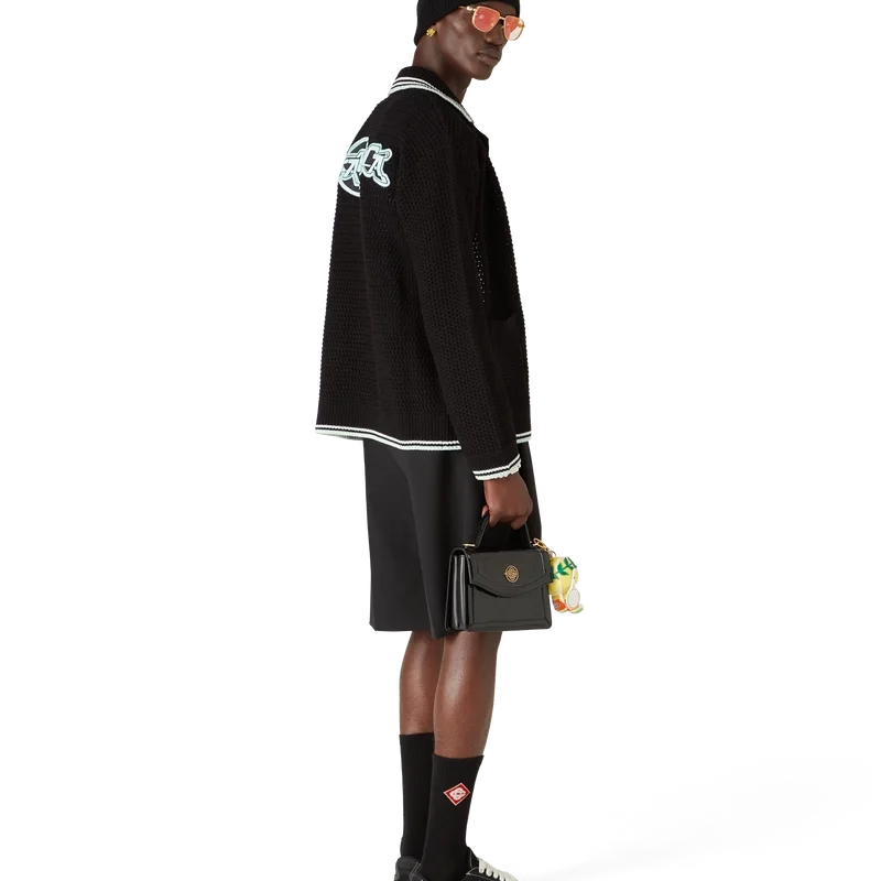 Cămașa cu mâneci lungi din bumbac croșetat brodat are un design clasic, cu logo-ul în formă de romb caracteristic casei, care face legătura cu tema de călătorie și vacanță a colecției capsule. Completată cu guler, manșete, tiv și placket din tricot cu nervuri, buzunare aplicate în față, închidere cu nasturi, nasturi cu margine aurie și perle, caracteristice mărcii, și detalii cu dungi negre, mentă și albe pe manșete, tiv și guler.