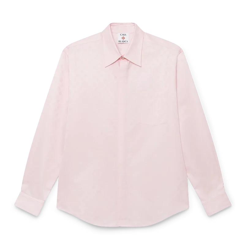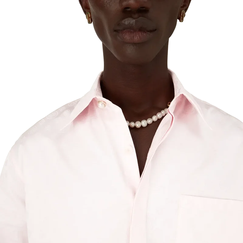 Cămașa cu mâneci lungi din bumbac cu monogramă are un design clasic, cu repetarea logo-ului Honeydew al casei. Acest model se deosebește de celelalte monograme ale noastre, deoarece combină forme unice pentru a forma un model coerent. Completată cu guler în V, închidere cu nasturi, nasturi din corozo cu logo-ul CC intercalat, un buzunar la piept și nasturi cu margini aurii și perle la guler și manșete.