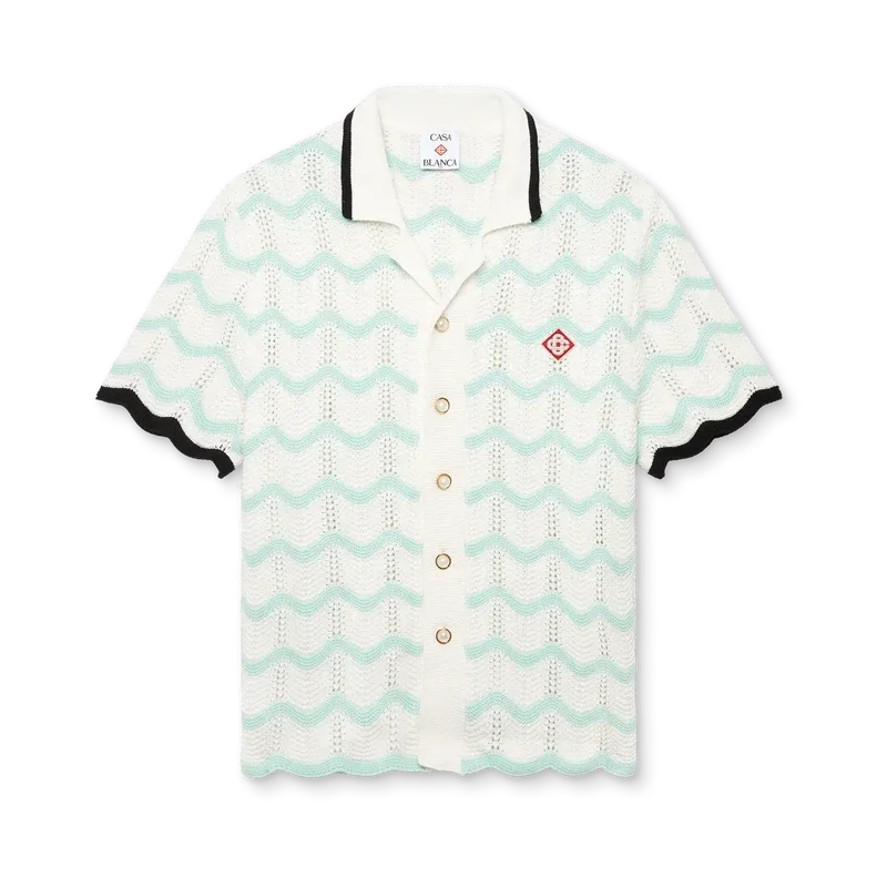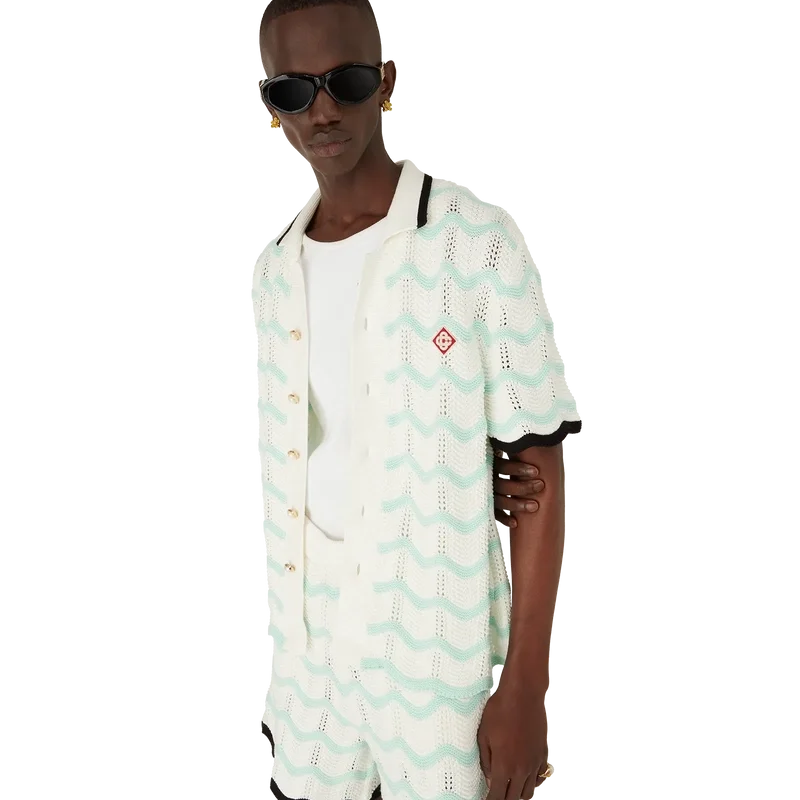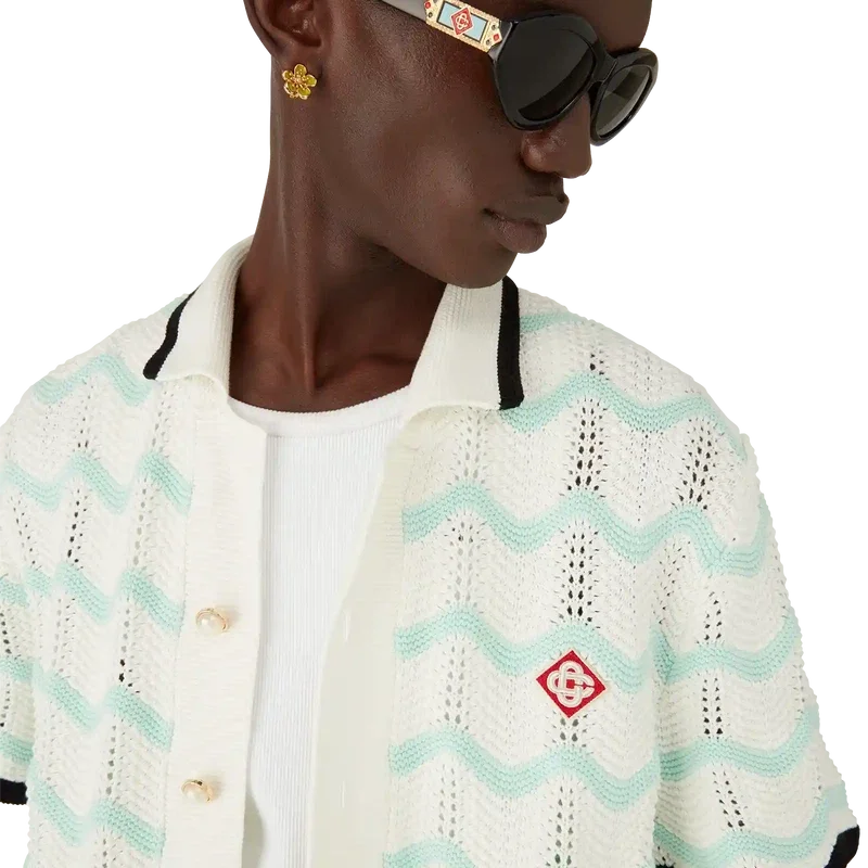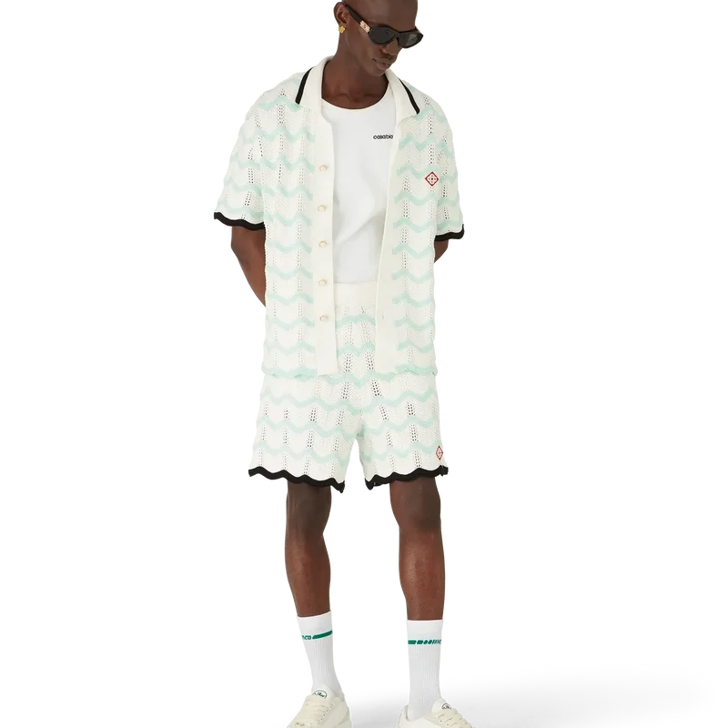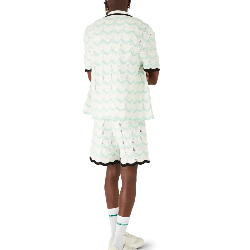 Cămașa cu pantaloni scurți din bumbac croșetat cu model ondulat în degrade este un model tricotat care prezintă logo-ul diamant caracteristic al casei. Este completată de guler, manșete și placket din tricot cu nervuri negru contrastant, închidere cu nasturi, nasturi cu margine aurie și perle caracteristice și detalii cu margini ondulate la manșete și tiv.