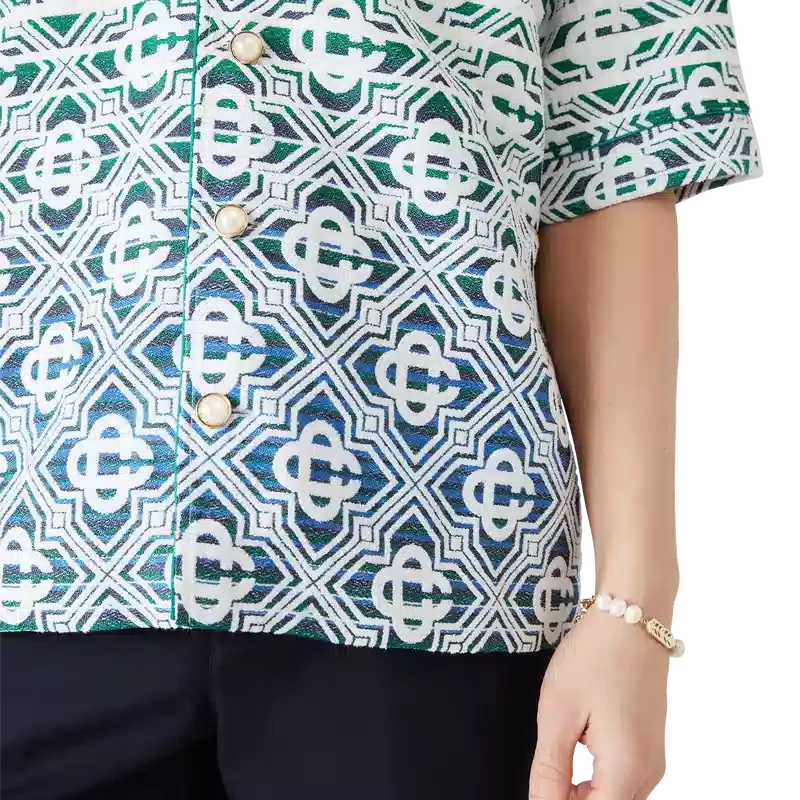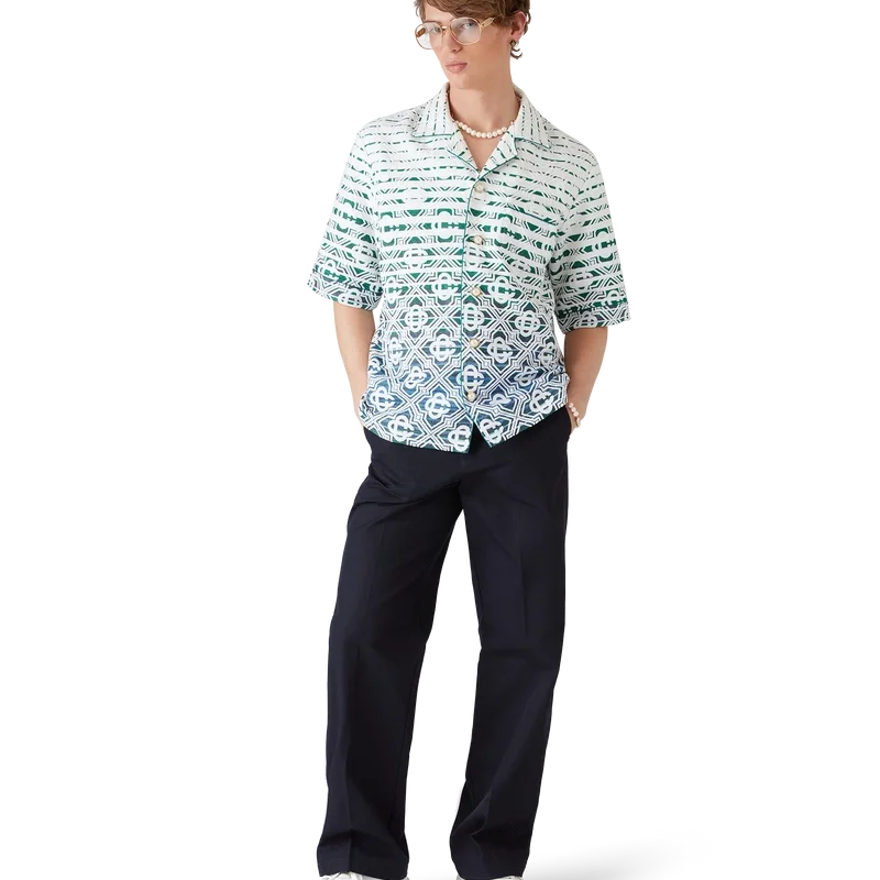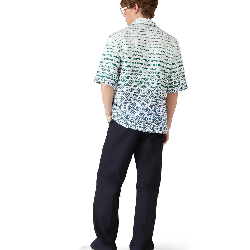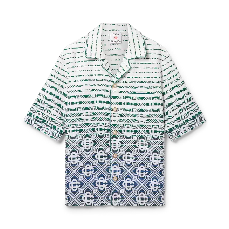 Cămașa din material de prosop cu gradient Monogram este un model cu mâneci scurte, textură moale și imprimeu, cu o siluetă clasică, confecționată dintr-un material de prosop cu gradient, care prezintă Diamond Monogram, semnătura casei. Completată cu închidere cu nasturi, buzunar la piept și guler cubanez.