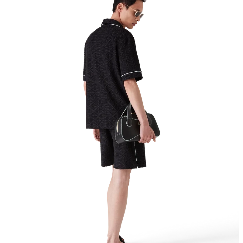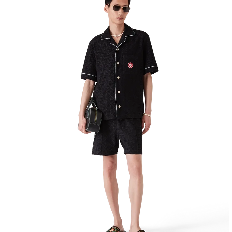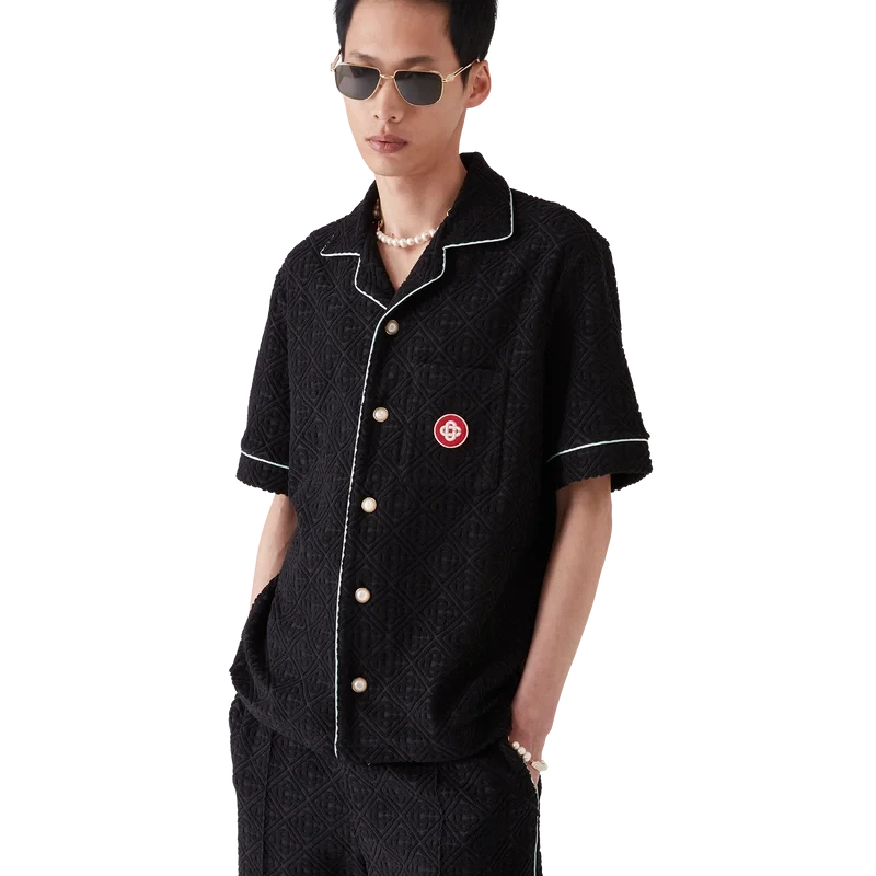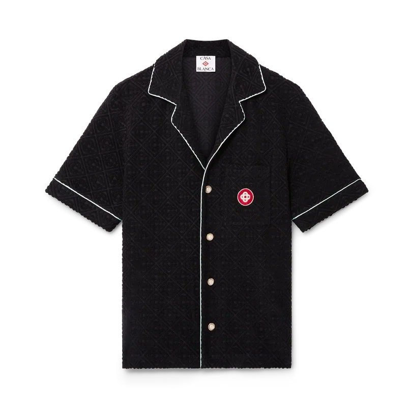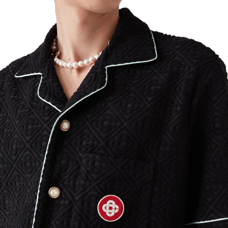 Cămașa cu mâneci scurte din material de prosop cu monogramă are un design clasic și este confecționată dintr-un material de prosop cu monogramă. Este prevăzută cu închidere cu nasturi, nasturi cu margine aurie și perle, un buzunar la piept și detalii cu bordură pe guler, placket, manșete și buzunarul de la piept.