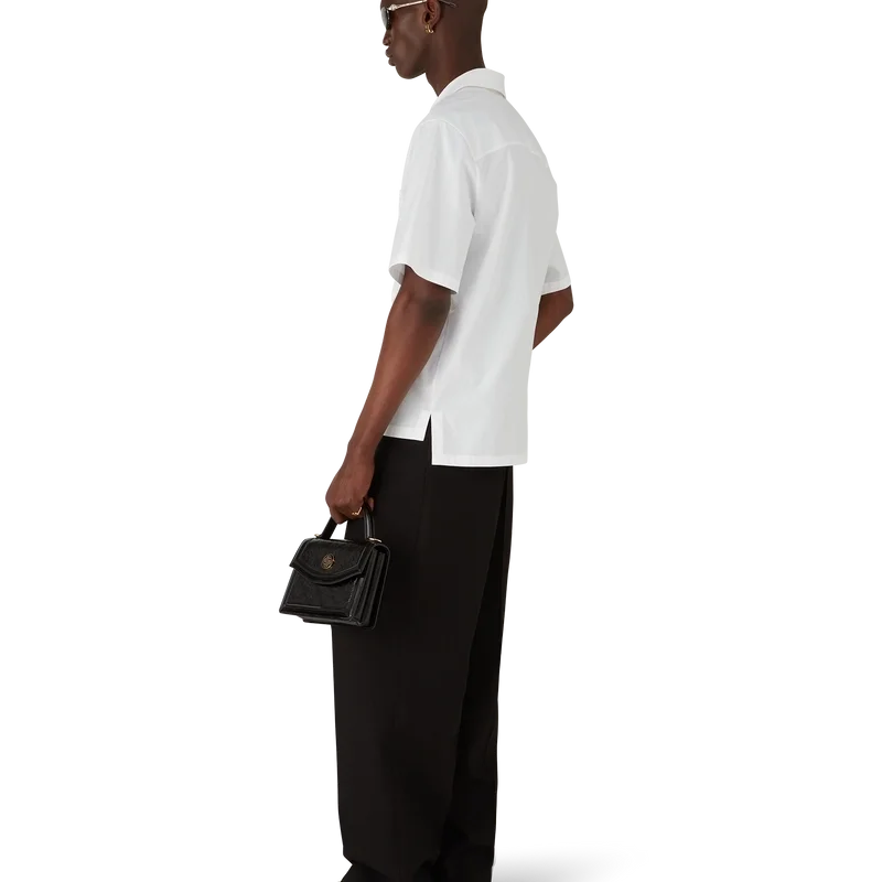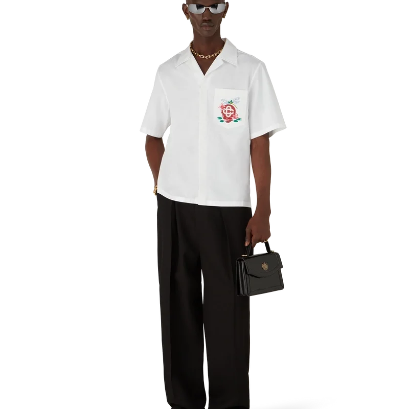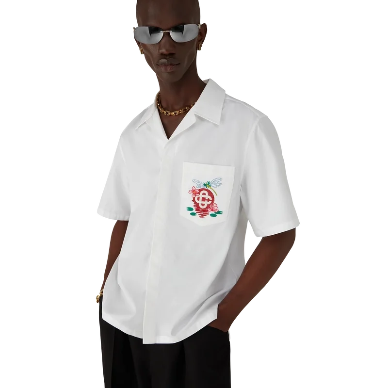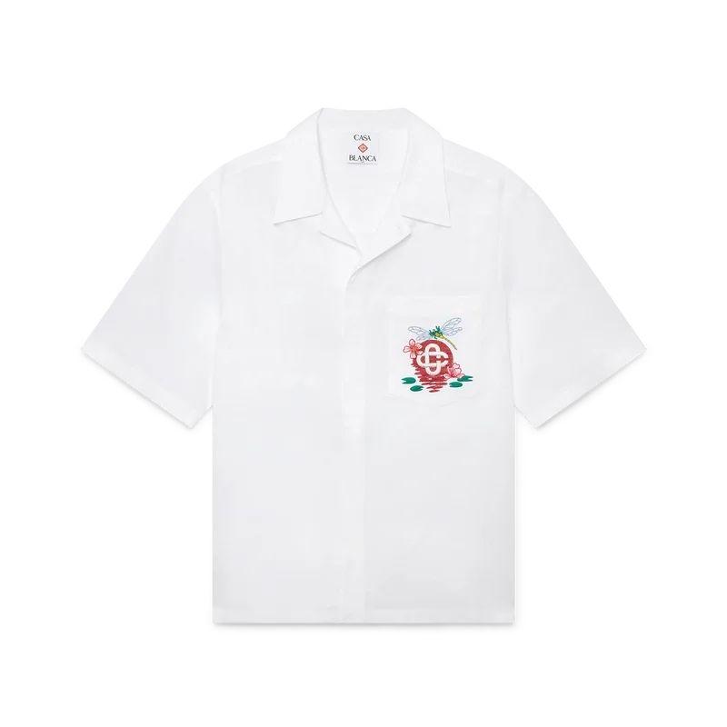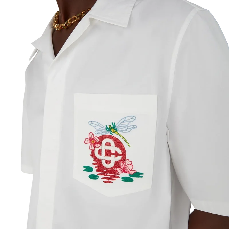 Cămașa cu mâneci scurte din poplin de bumbac brodată are un design clasic, realizată dintr-o țesătură de bumbac cu un motiv sezonier în care libelula ocupă locul central ca simbol cheie, oferind un contrast mai moale și mai dulce, în timp ce florile de lotus și reflexia soarelui pe apă se inspiră din simbolistica Casablanca cu natura. Completată cu guler cubanez, închidere cu nasturi, buzunar la piept, nasturi din corozo cu logo-ul Cc interconectat și tiv asimetric.