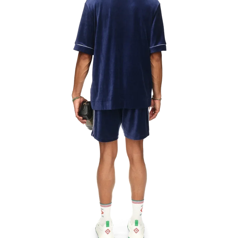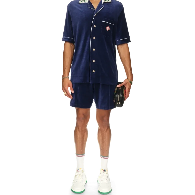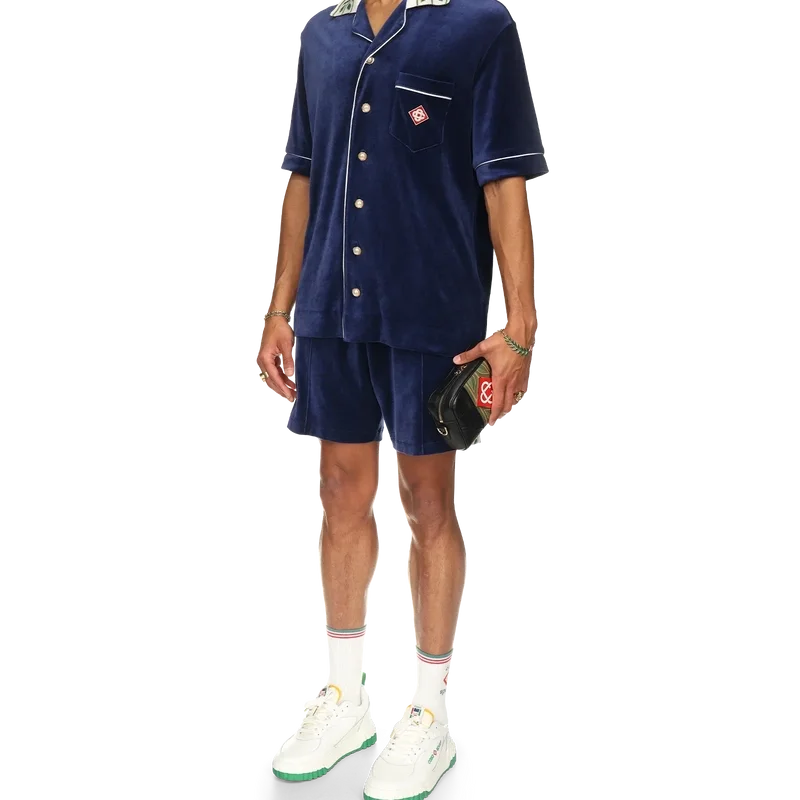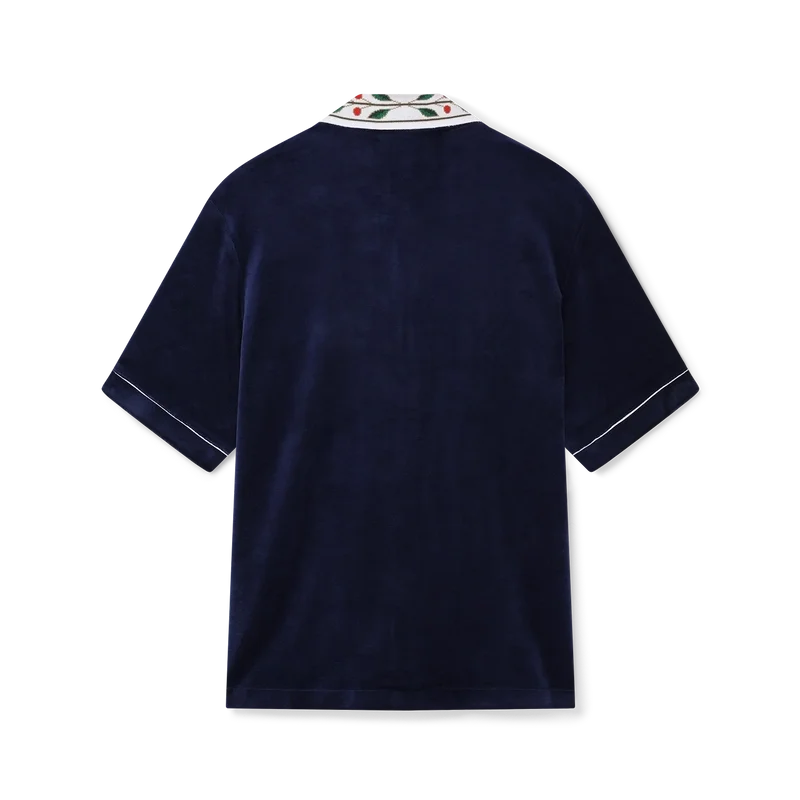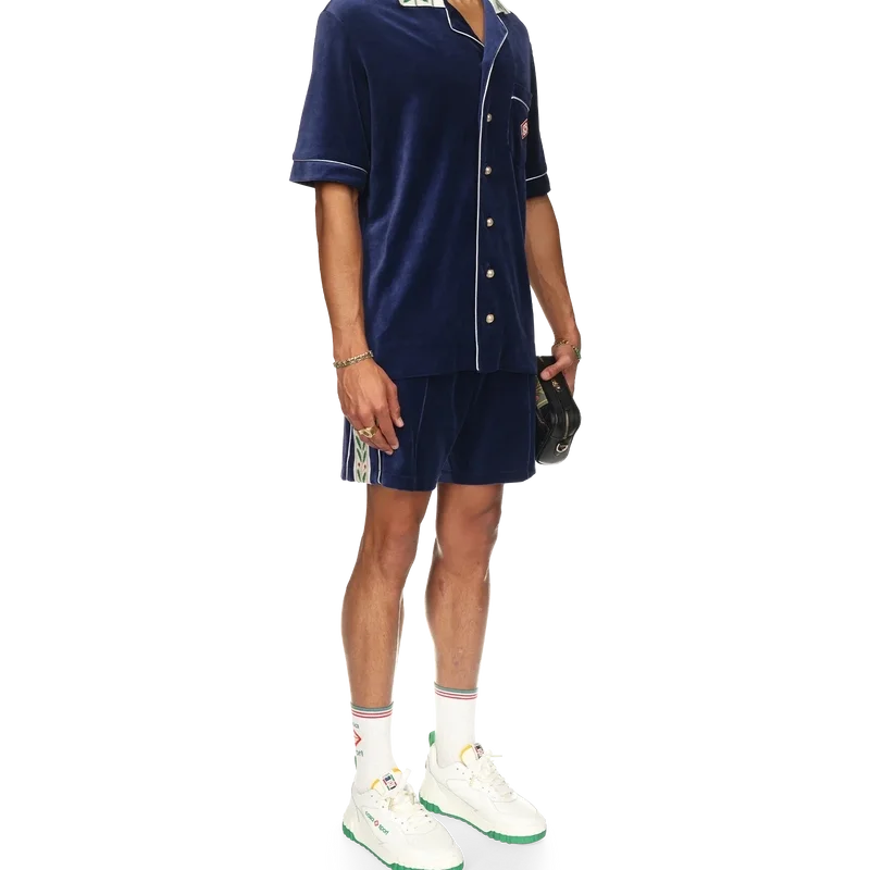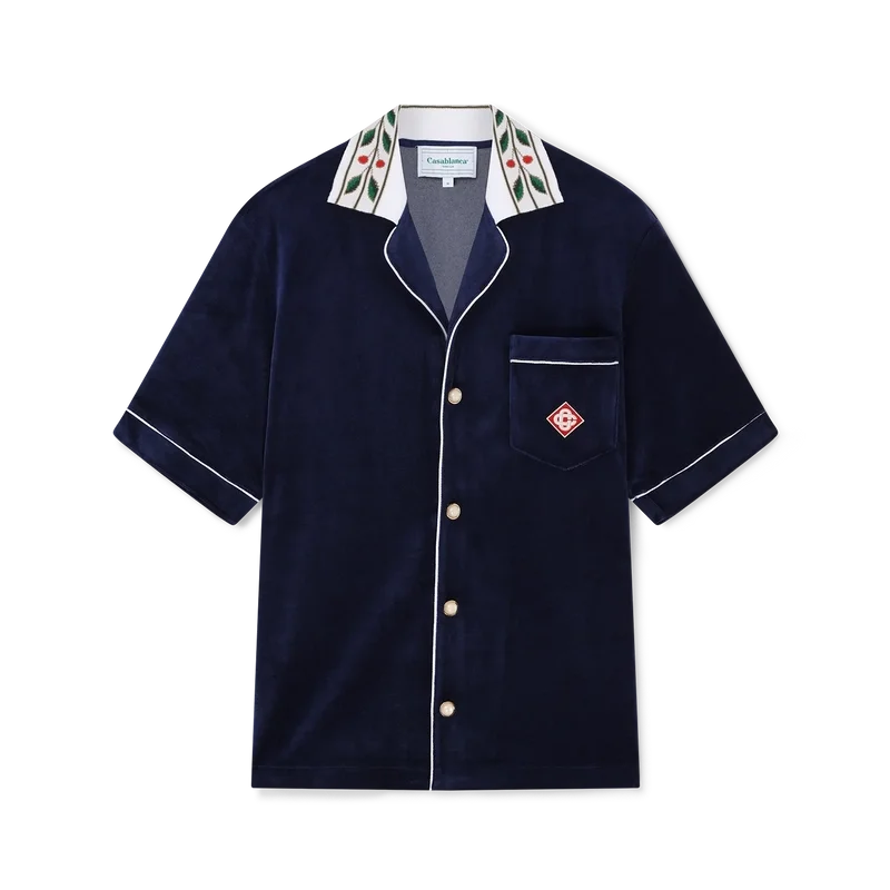 Cămașa din velur Laurel are mâneci scurte și logo-ul Casablanca pe buzunarul de la piept. Este prevăzută cu buzunar la piept, închidere cu nasturi în față, nasturi cu margini aurii caracteristice, detalii cu bordură albă pe placket, manșete și buzunar, precum și guler tricotat cu motivul Laurel caracteristic casei.
