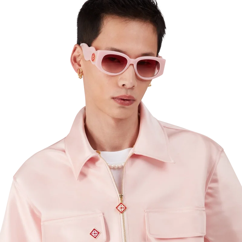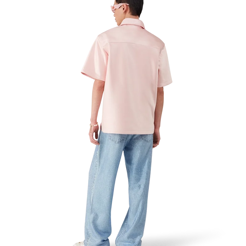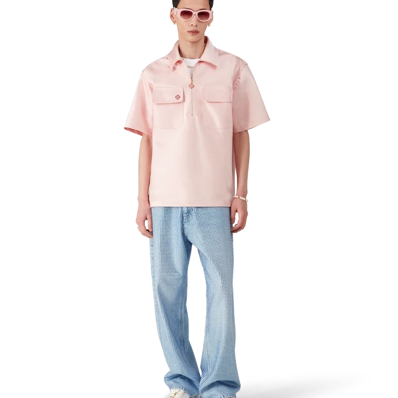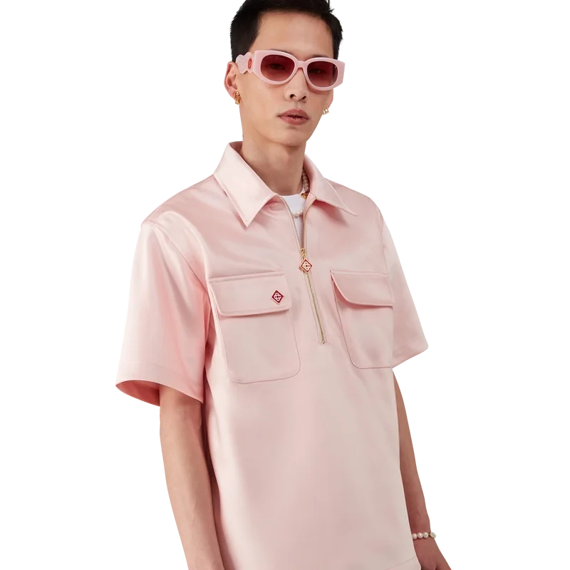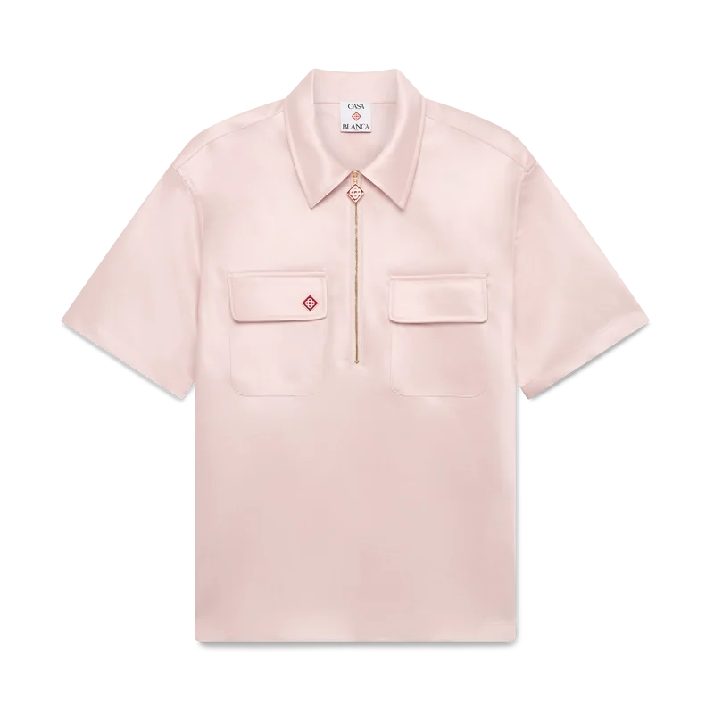 Cămașa din satin cu fermoar pe un sfert este un model cu mâneci scurte, confecționat din țesătură de satin. Prezintă închidere cu fermoar cu logo-ul diamant caracteristic casei, guler și buzunare aplicate cu clapă.