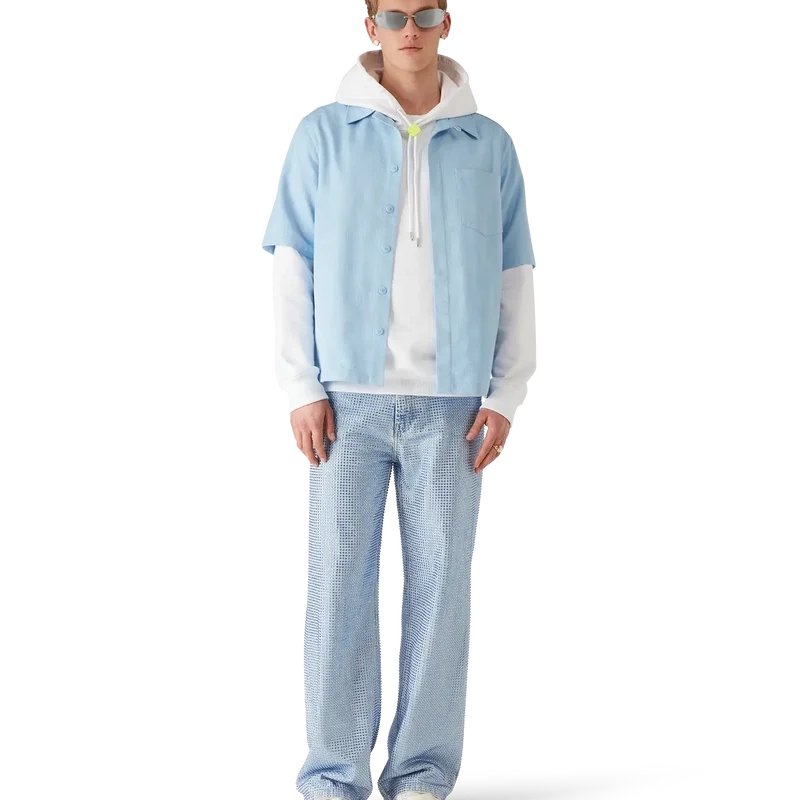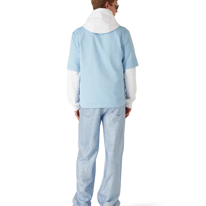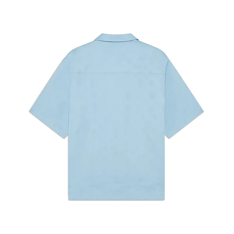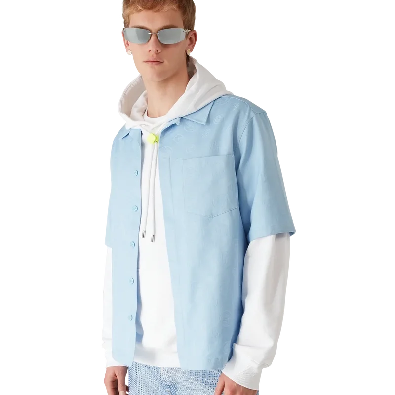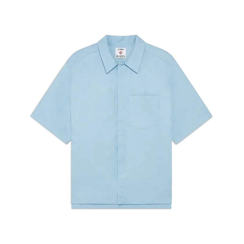 Cămașa cu mâneci scurte albastru deschis cu monogramă are un design rafinat, cu modelul iconic al casei. Prezintă guler ascuțit, buzunar aplicat în față, închidere cu nasturi, nasturi din corozo cu logo CC întrețesut și tiv asimetric.