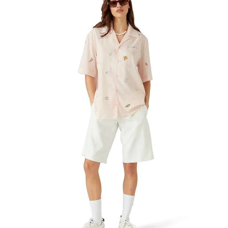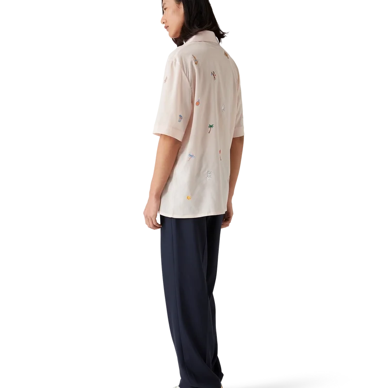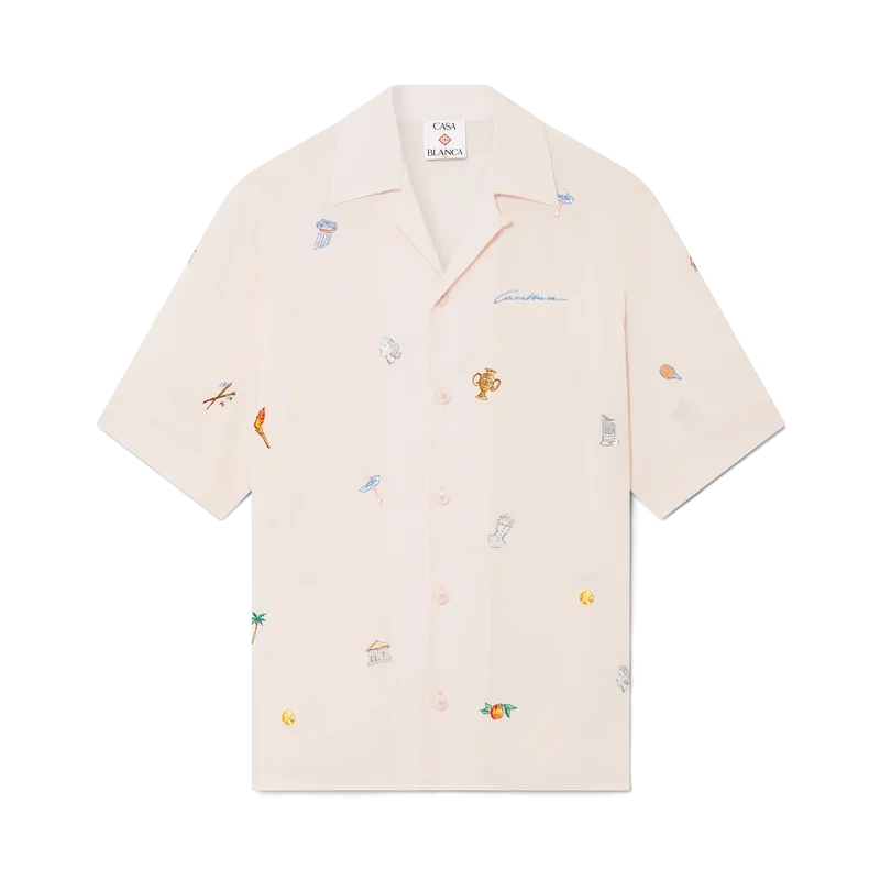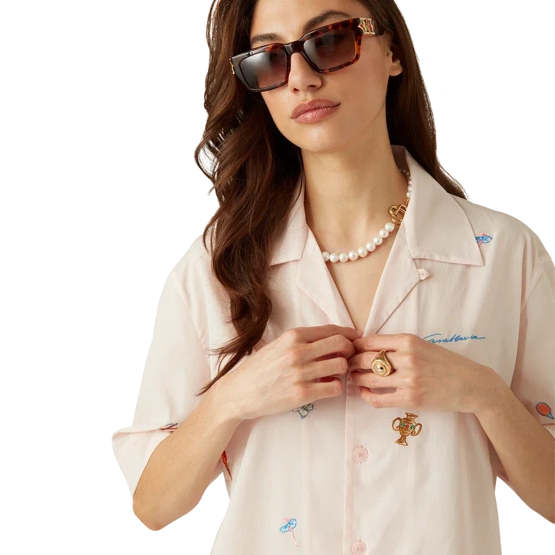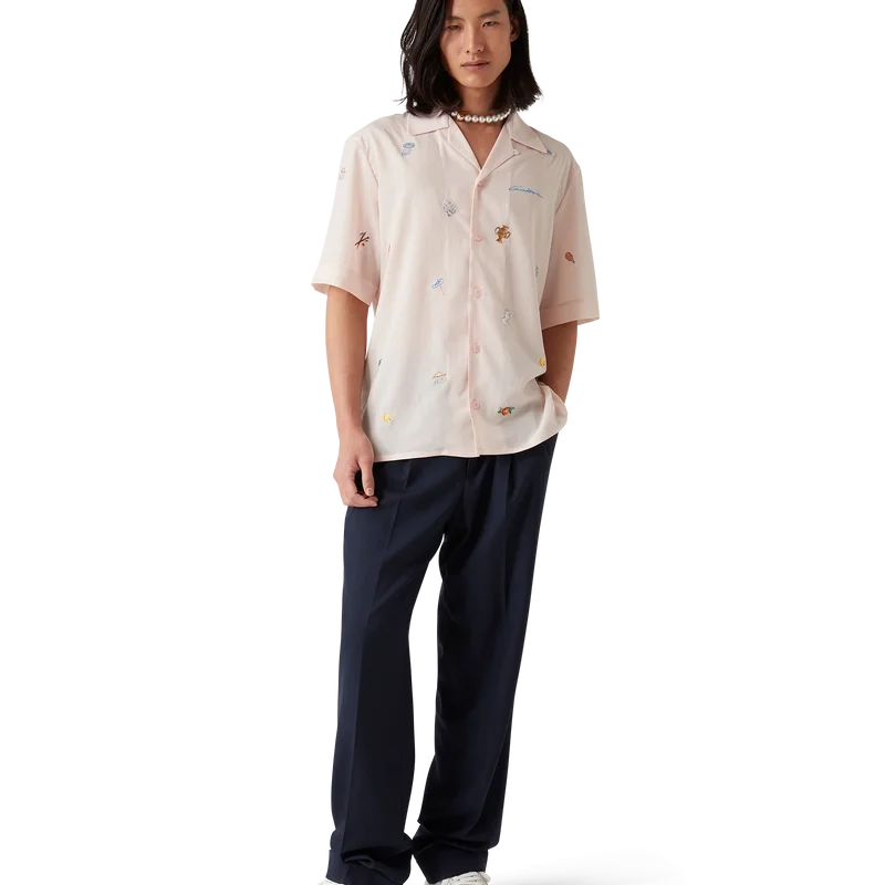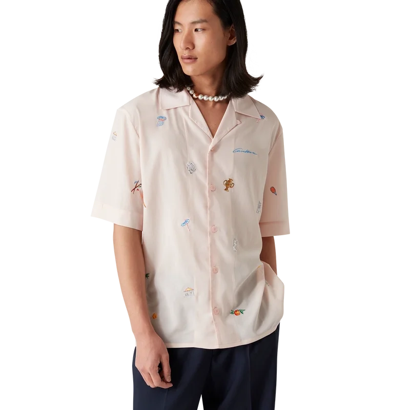 Cămașa cu motiv brodat este un model cu mâneci scurte, confecționată dintr-o țesătură brodată, cu motive brodate care reprezintă simbolistica casei de modă, inspirată de natură, tenis și arhitectură. Este prevăzută cu închidere cu nasturi, nasturi din corozo cu logo CC intercalat și guler cubanez.