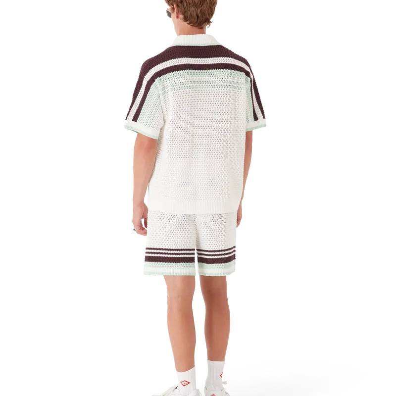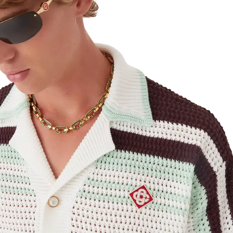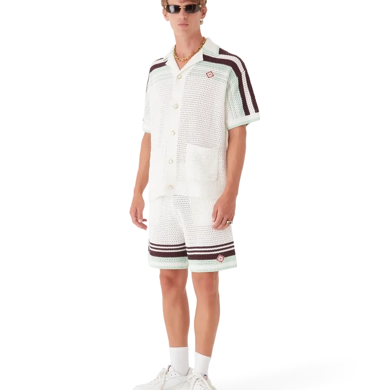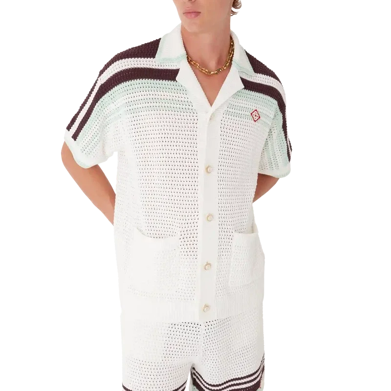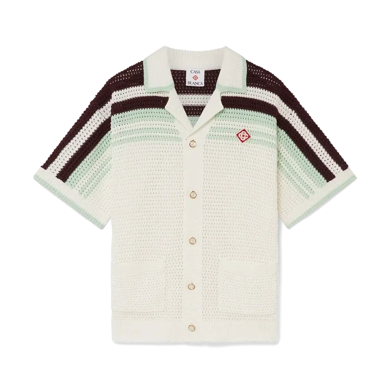 Cămașa croșetată Tennis este un model tricotat cu mâneci scurte, confecționat din țesătură de bumbac croșetată în culori naturale delicate și prezintă logo-ul diamant caracteristic al casei. Este completată cu nasturi cu margini aurii și perle, detalii cu dungi pe umeri și pe mâneci, buzunare aplicate în față și detalii cu margini dungate la guler și manșete.