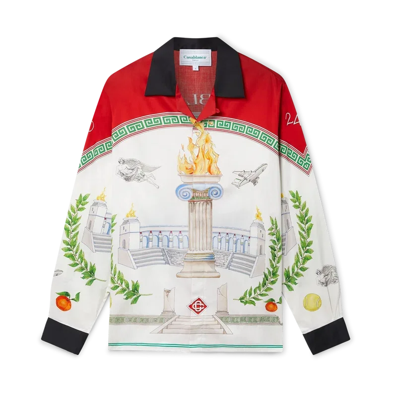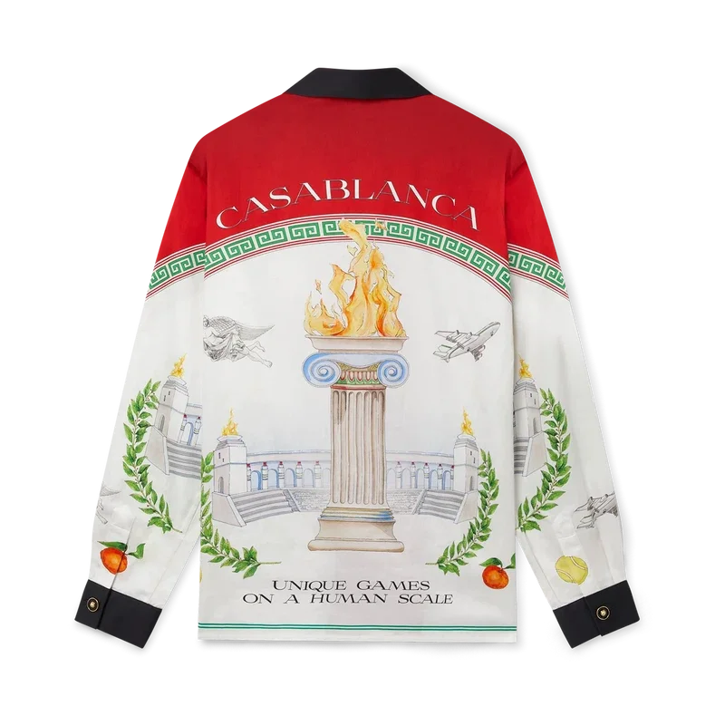 Cămașa din bumbac Unique Games este un model cu mâneci lungi și imprimeu integral, confecționată dintr-o țesătură de bumbac, prezentând grafica sezonieră a casei de modă, inspirată de Grecia Antică. Completată cu nasturi smălțiți cu margine aurie, semnătura casei de modă, închidere cu nasturi, guler cubanez, guler și manșete în contrast și detaliu cu dungi la tiv, cu detaliu în stil valuri grecești pe piept și spate.