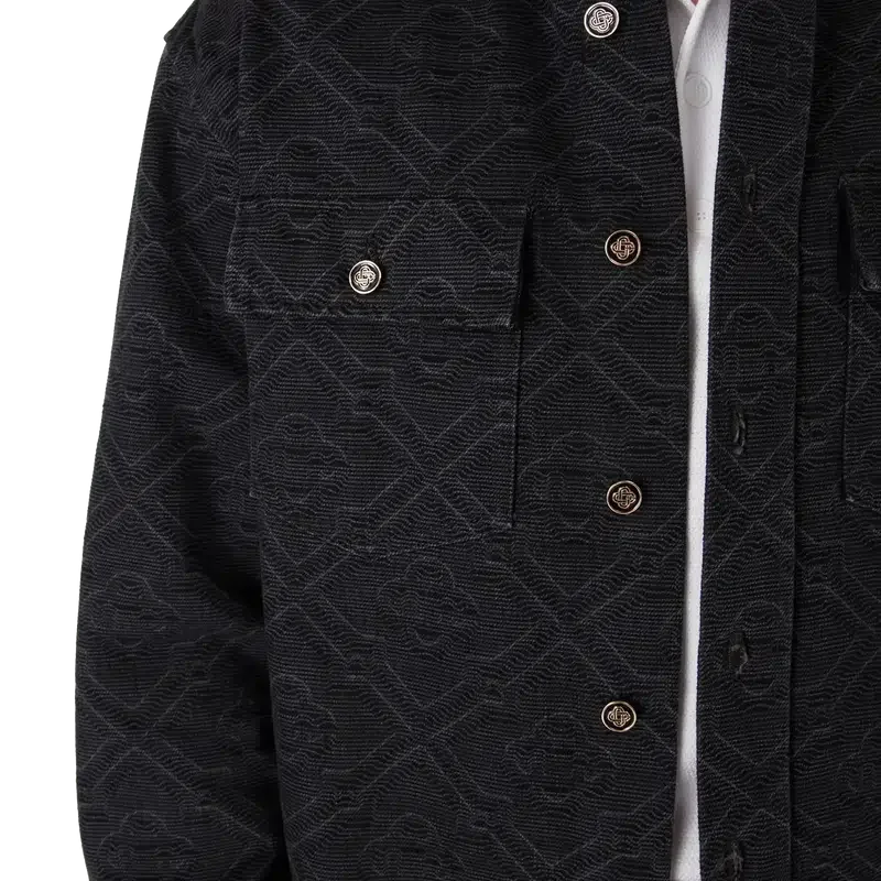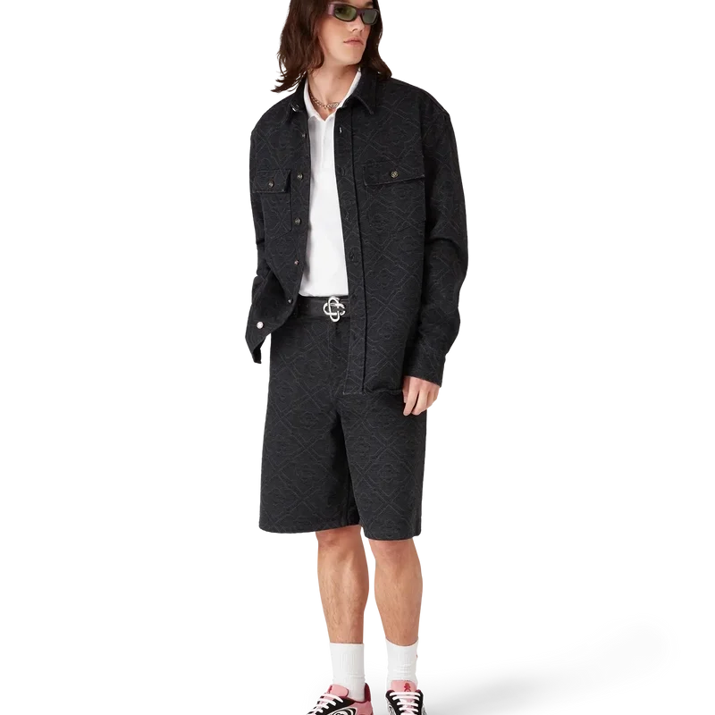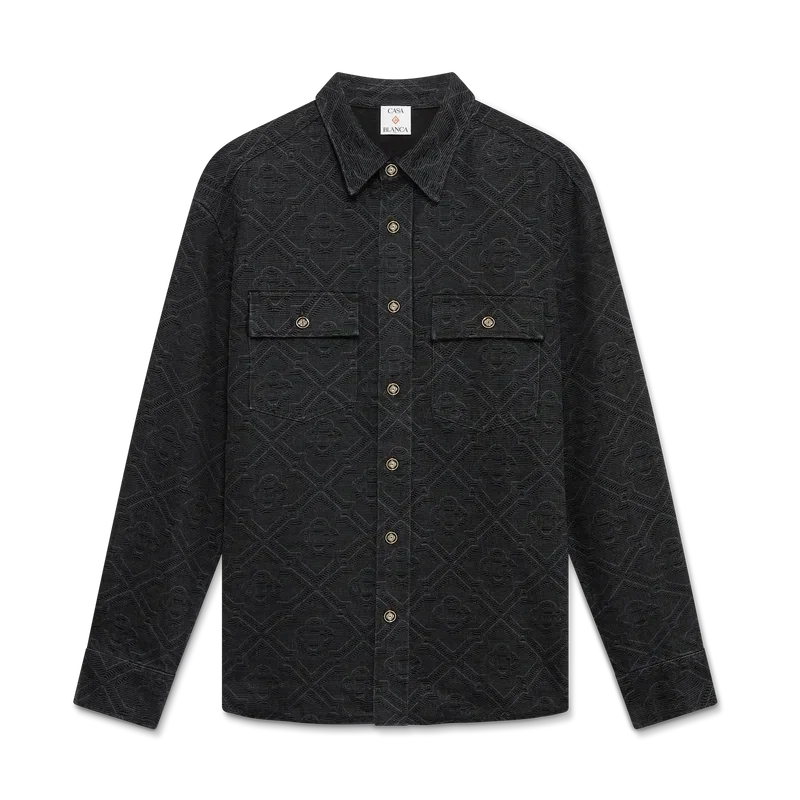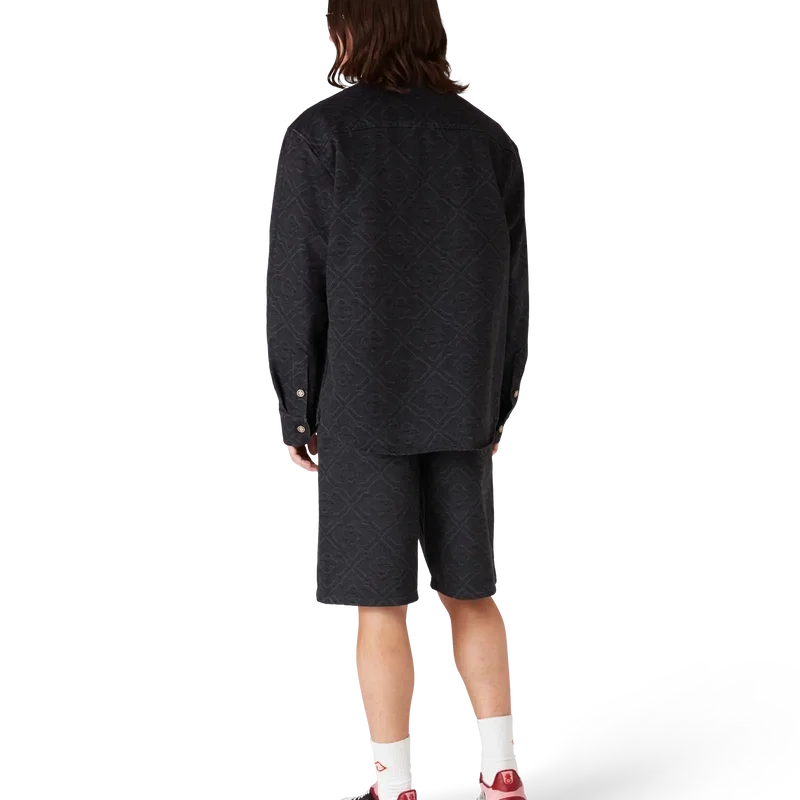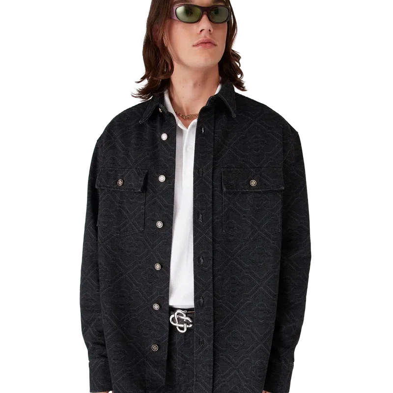Cămășa din denim cu mâneci lungi „Black Laser” are un design rafinat, caracterizat de modelul Monogram al casei, realizat prin tehnici laser. Prezintă guler ascuțit, închidere cu nasturi, nasturi placati cu aur cu sigla mărcii și buzunare la piept.<!–