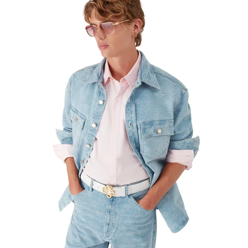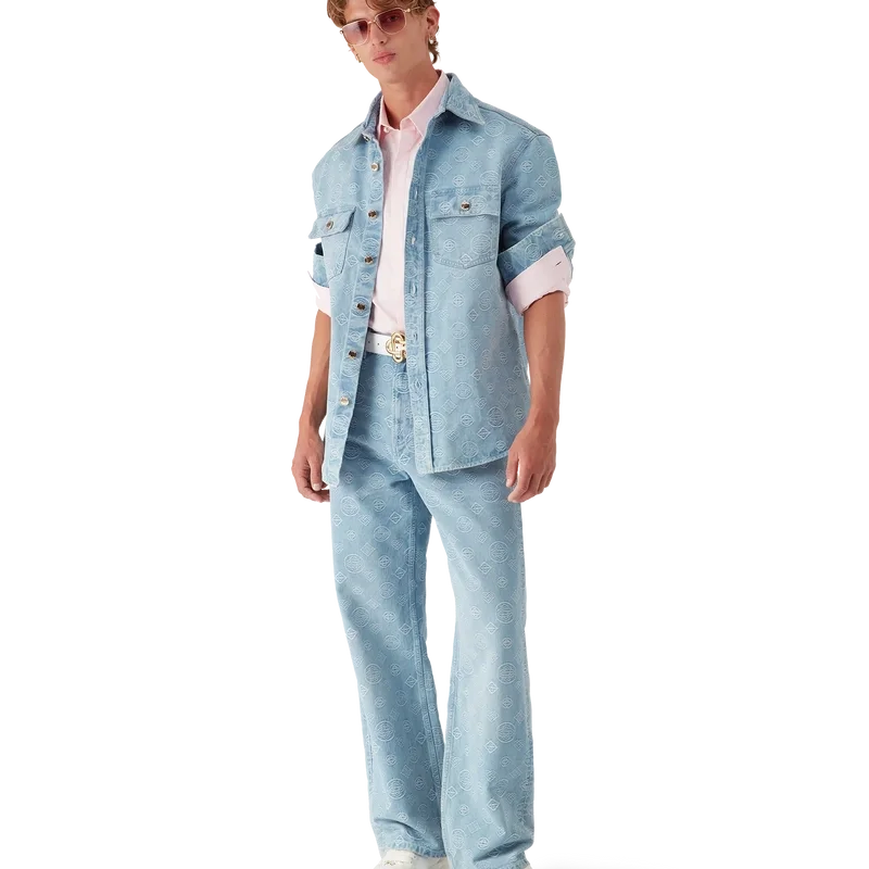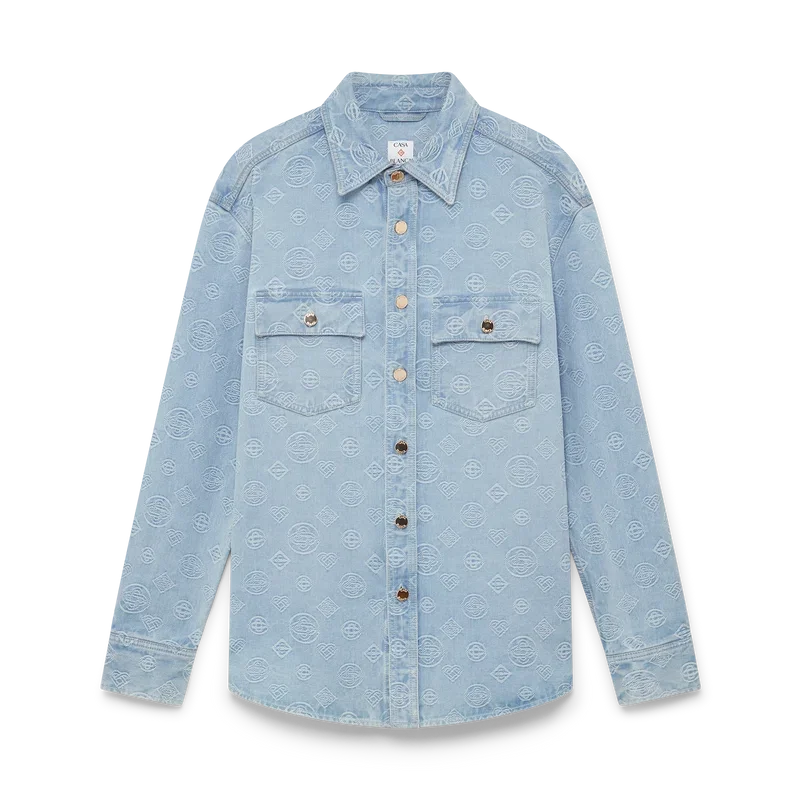 Cămașa din denim cu monogramă este un model cu mâneci lungi, care prezintă logo-ul Honeydew al casei repetat. Acest model diferă de celelalte monograme ale noastre, deoarece combină forme unice pentru a forma un model coerent. Completată cu guler în vârf, închidere cu nasturi, buzunare la piept și nasturi cu capse placate cu aur cu marca Casablanca.