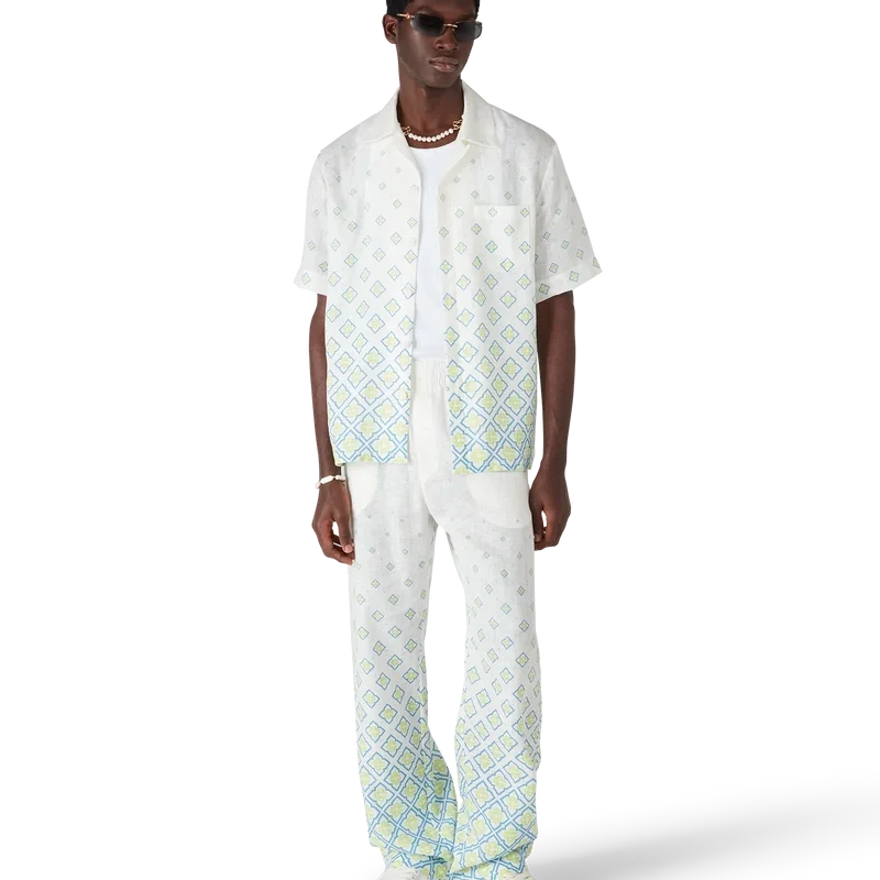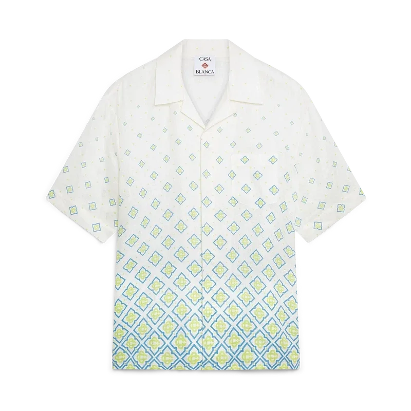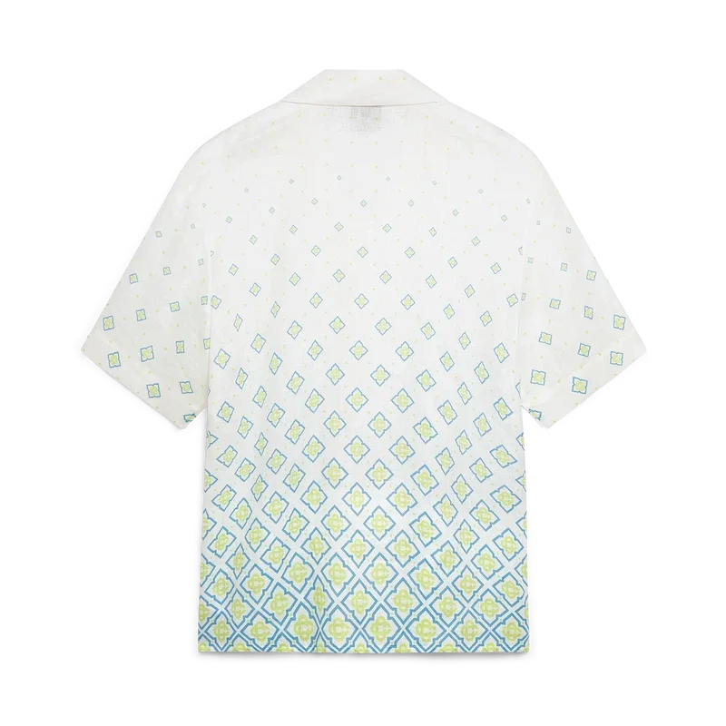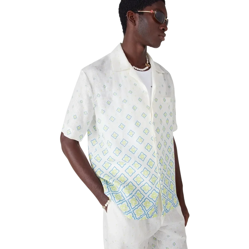 Cămășa din in cu mânecă scurtă și monogramă degradată are un design rafinat, cu guler. Este prevăzută cu guler în stil cubanez, închidere cu nasturi din corozo cu logo CC intercalat și buzunar la piept.<!–