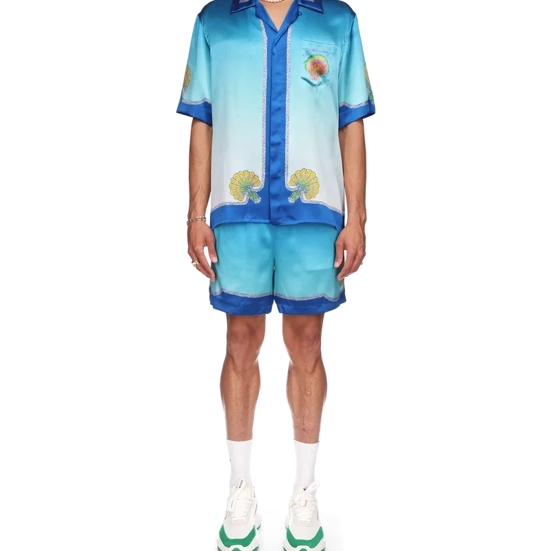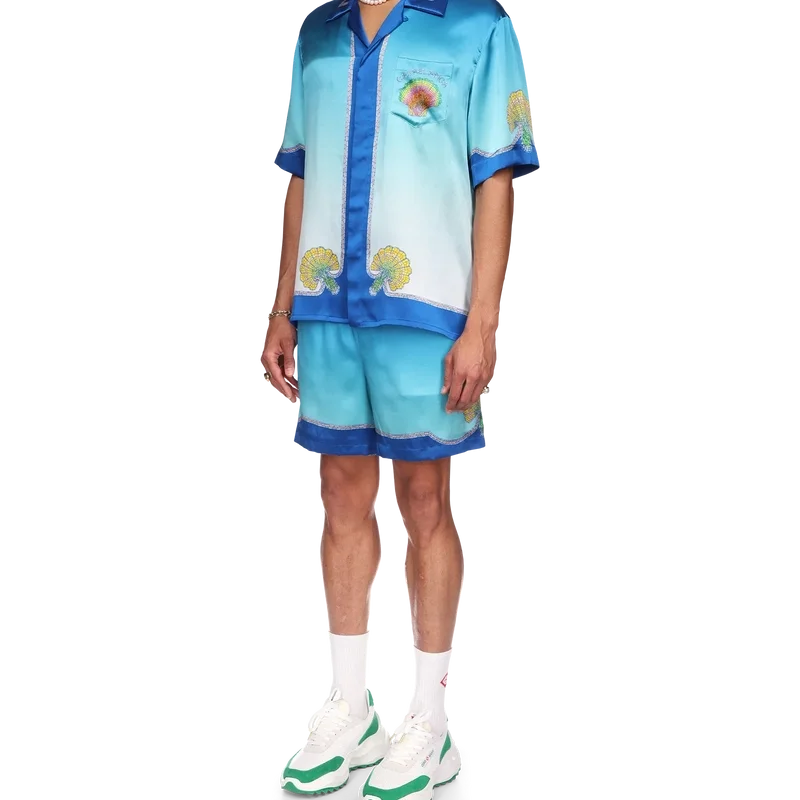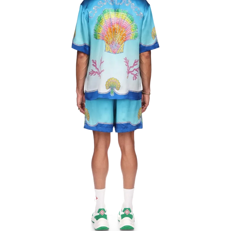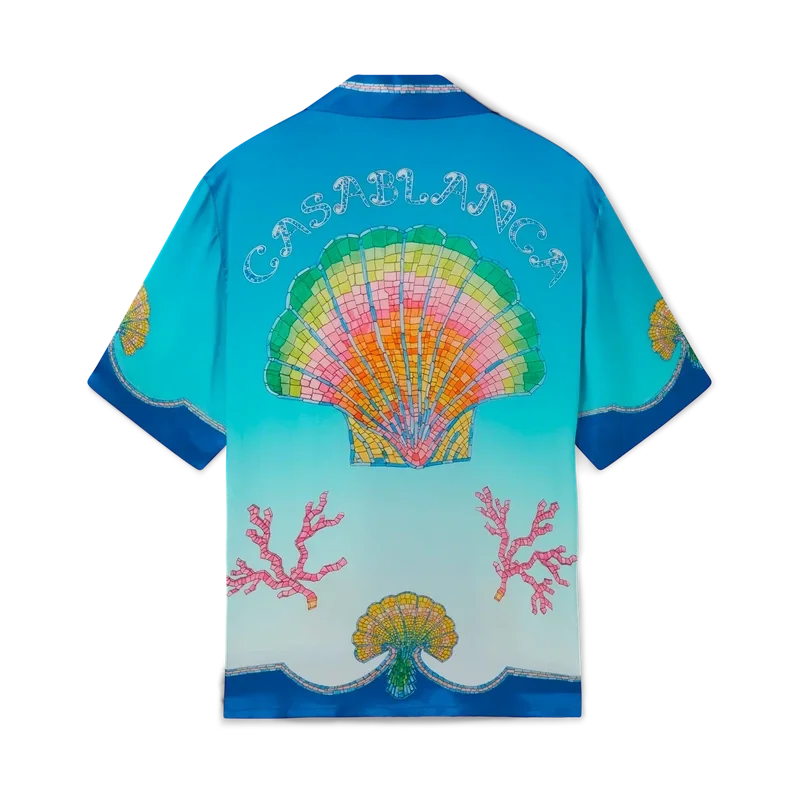 Cămașa din mătase Coquillage Colora este un model cu mâneci scurte și imprimeu integral, prezentând un model de scoici în culorile curcubeului pe un material familiar de sârgă de mătase albastră în degrade. Completată cu închidere cu nasturi în față, guler cubanez deschis, buzunar la piept și detalii contrastante la guler, manșete și tiv.