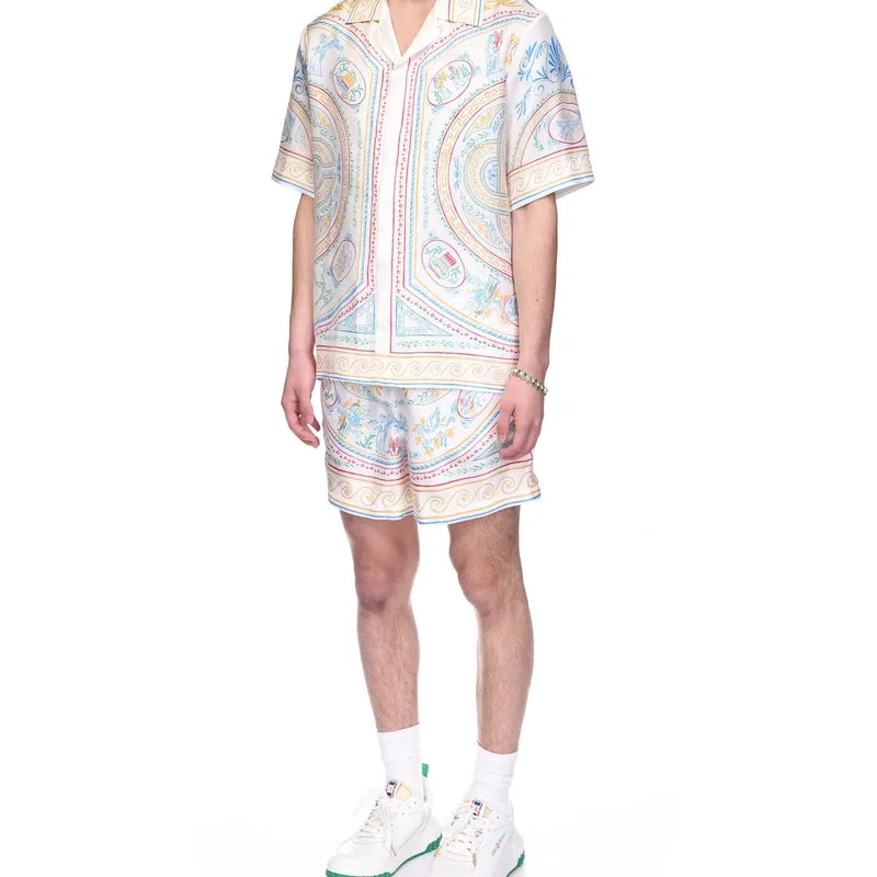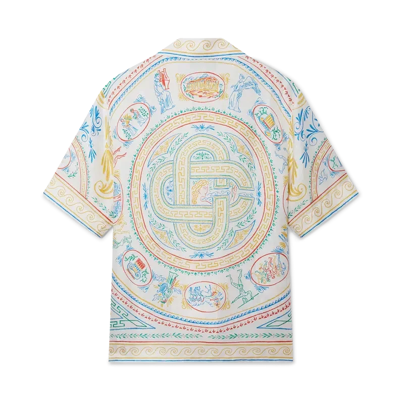 Cămașa din mătase Crayon Vase are un imprimeu multicolor realizat dintr-o țesătură din mătase twill, prezentând un motiv sezonier inspirat de un model clasic de farfurie grecească, cu elementele de design caracteristice casei. Este completată de un guler cubanez, închidere cu nasturi, nasturi din corozo cu logo-ul Cc, valul grecesc al sezonului și detalii cu dungi pe guler, manșete și tiv.