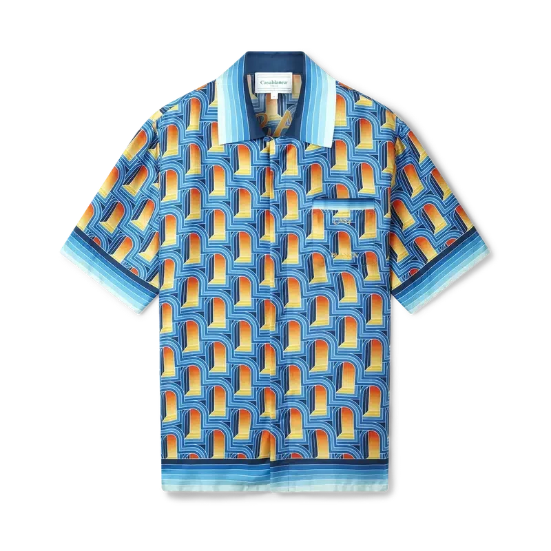 Cămașa din mătase cu mâneci scurte pentru bărbați L’arche De Nuit prezintă imprimeul cu arcuri repetate al sezonului într-o paletă de culori nocturne de albastru intens. Finisată cu guler deschis cu dungi albastre tonale și închidere cu nasturi.
