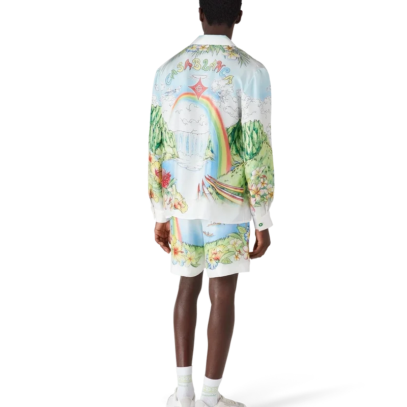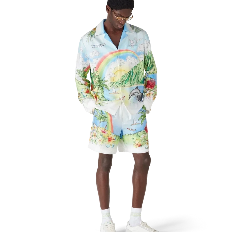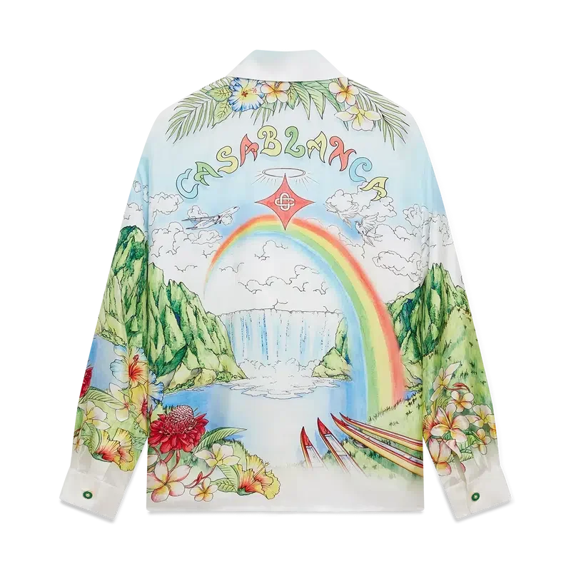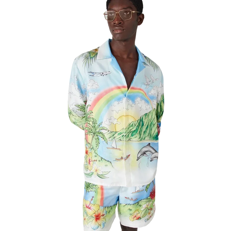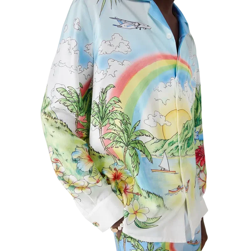 Cămășa cu mâneci lungi Aloha prezintă o reprezentare vibrantă, pictată, a insulei Kauai, Hawaii, prezentând paradisul său montan, cascadele, delfinii jucăuși, canoele și un curcubeu, cu o viziune exagerată asupra frumuseții peisajului. Completată cu o siluetă cu guler, închidere cu nasturi, nasturi cu logo Cc interconectați și nasturi cu margine aurie și perle la manșete, precum și detalii rafinate care surprind codurile de lux sport-leisure ale mărcii.