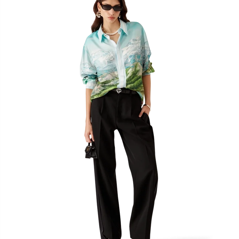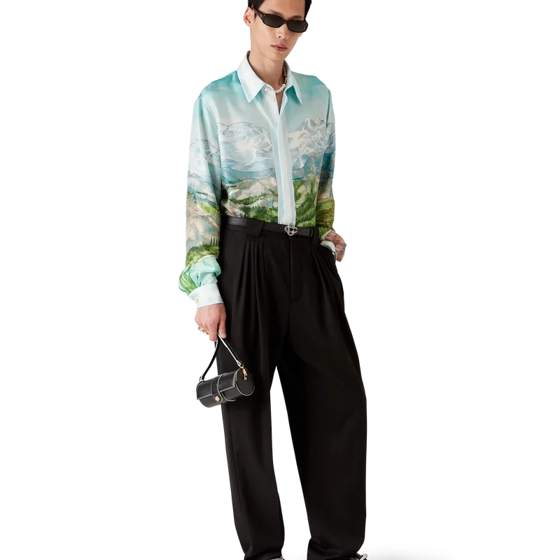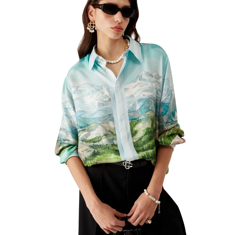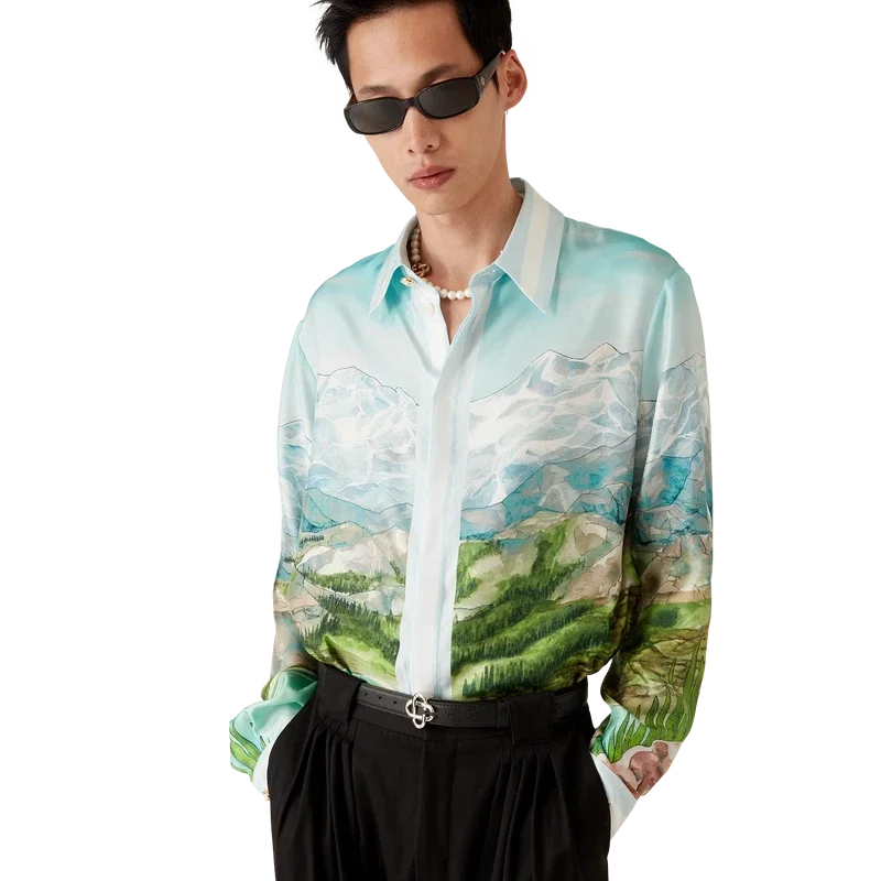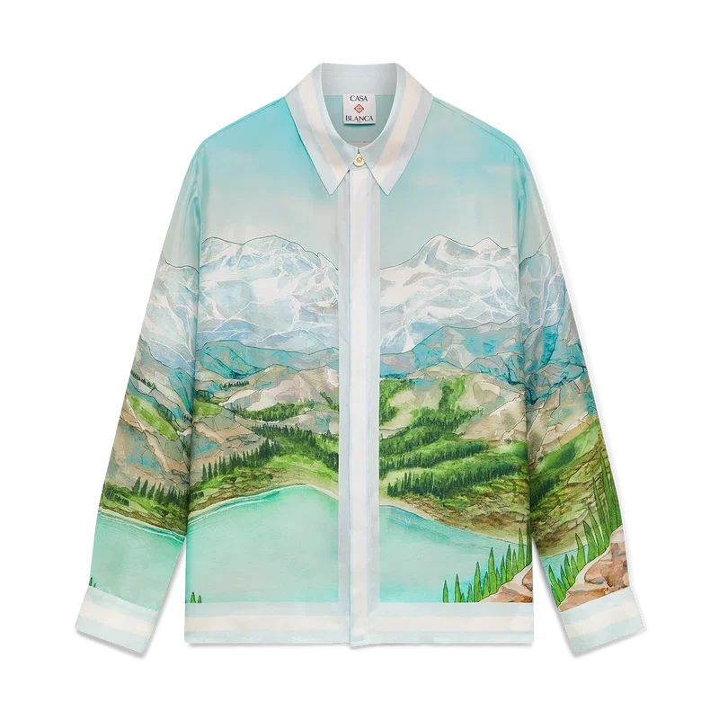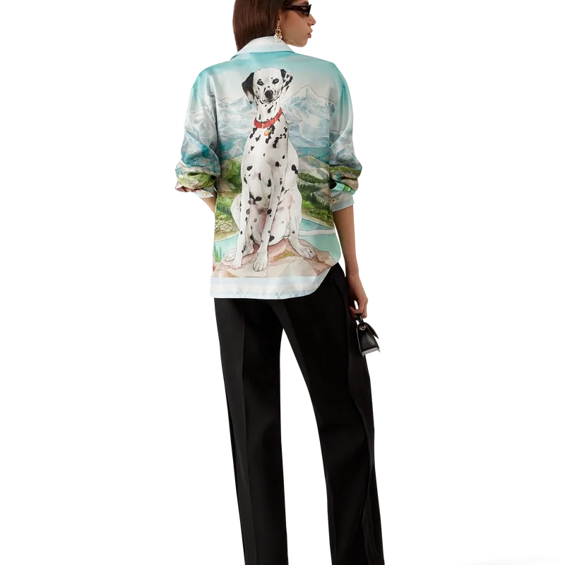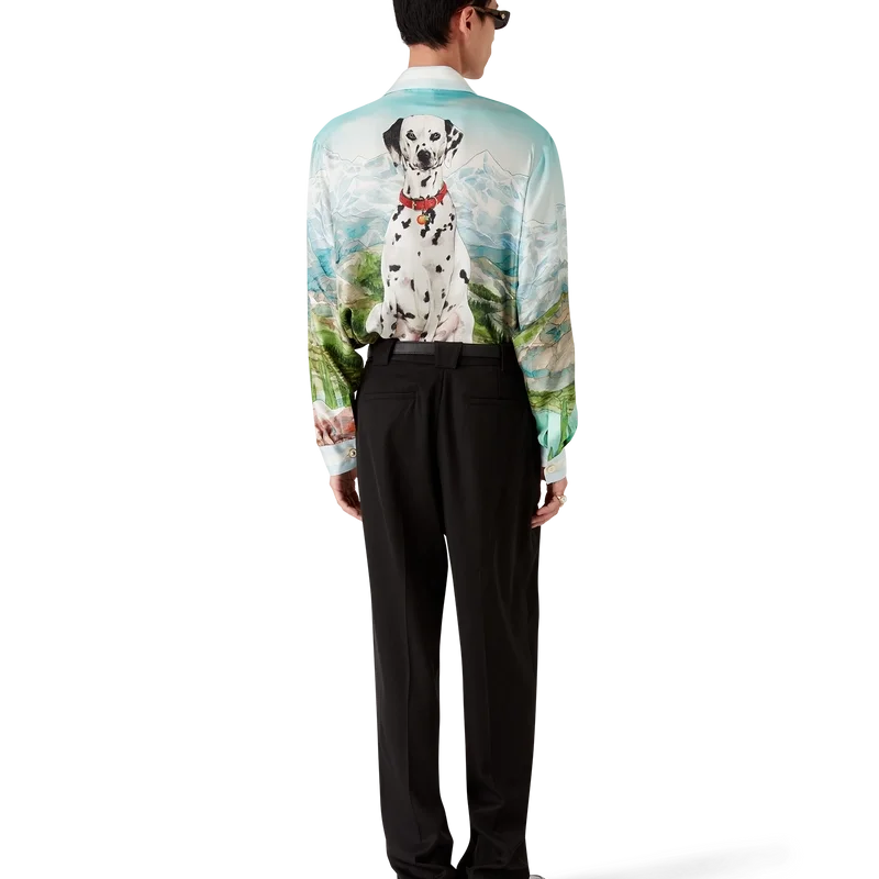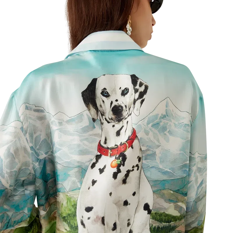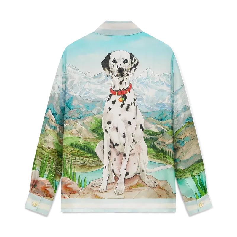 Cămășa din mătase cu mâneci lungi Dalmatian a La Montagne are un design imprimat pe toată suprafața, fiind confecționată din țesătură de mătase twill și prezentând opera de artă semnată de casă, care descrie un peisaj cu munți acoperiți de zăpadă, lacuri și un dalmațian.