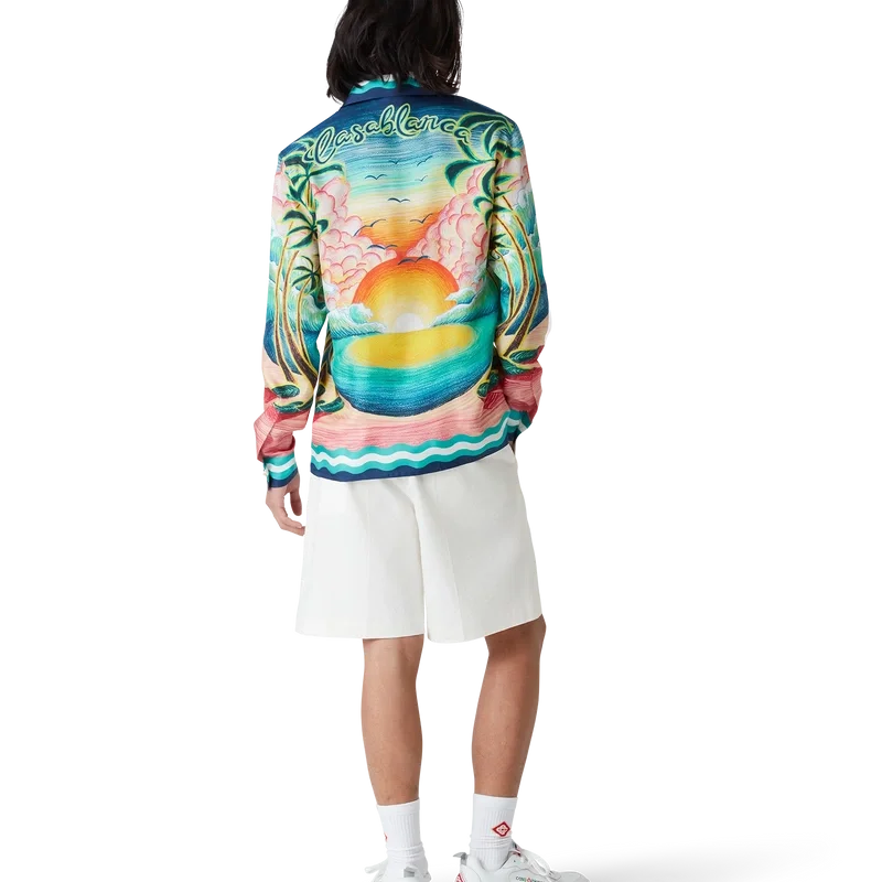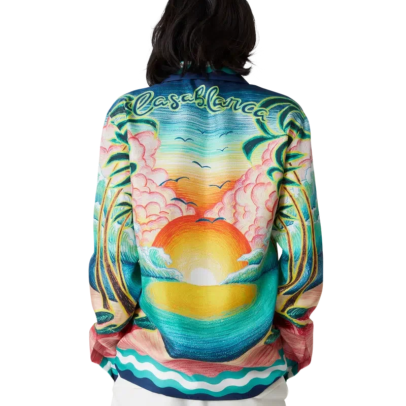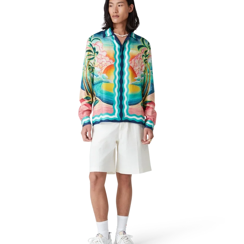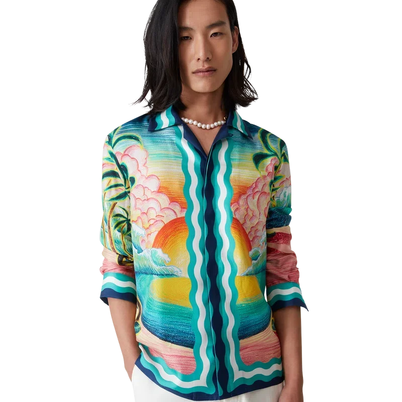 Cămașa din mătase Danse De La Mer este un model cu mâneci lungi și imprimeu integral, prezentând scene pictate manual create special pentru colecție și confecționată din țesătură de mătase. Completată cu închidere cu nasturi, nasturi Corozo cu logo Cc interconectat, nasturi smălțuiți cu margine aurie caracteristică și detalii cu dungi inspirate de valurile Memphis pe tiv, manșete, guler și placket.