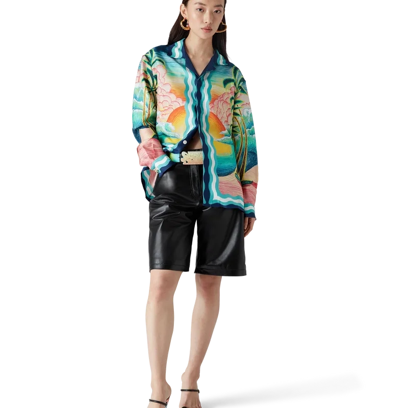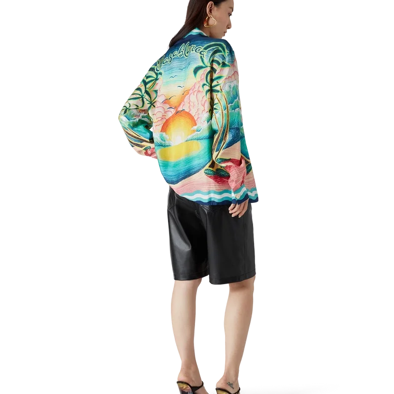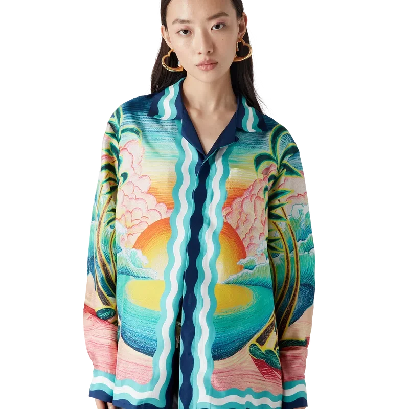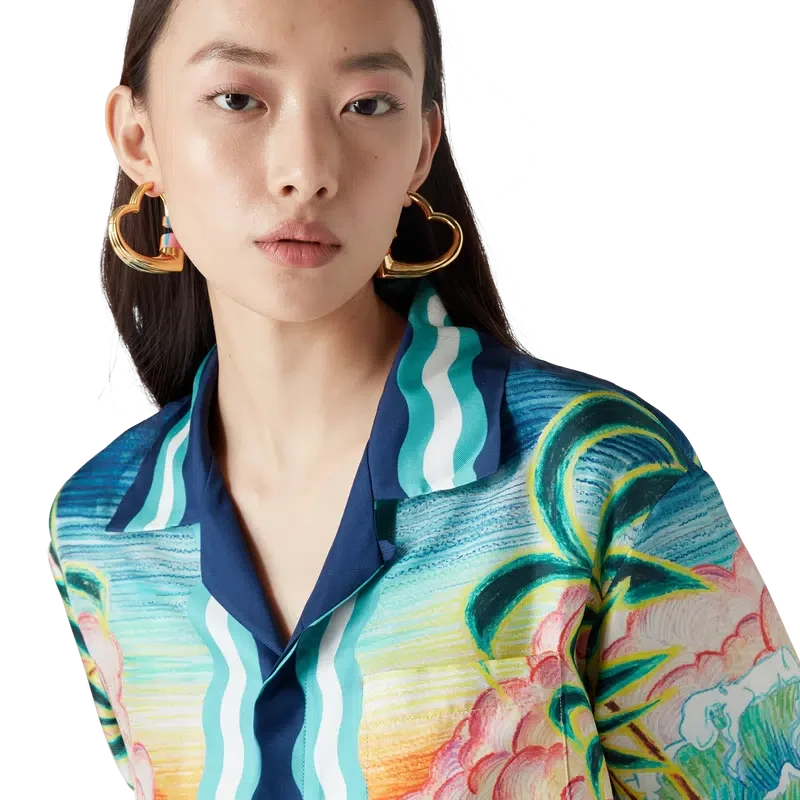 Cămașa din mătase Danse De La Mer este un model cu mâneci lungi și imprimeu integral, prezentând scene pictate manual create special pentru colecție și confecționată din țesătură de mătase. Completată cu închidere cu nasturi, nasturi din corozo cu logo Cc interconectat, nasturi semnătura din email cu margine aurie și detalii cu dungi inspirate de valurile Memphis pe tiv, manșete, guler și placket.