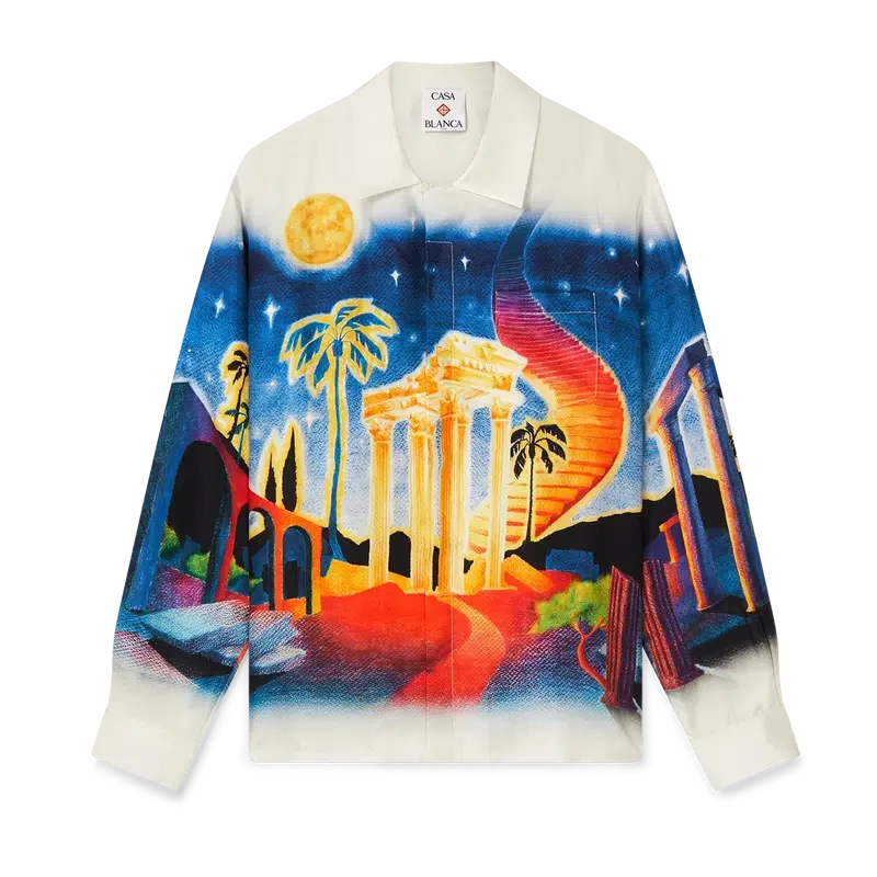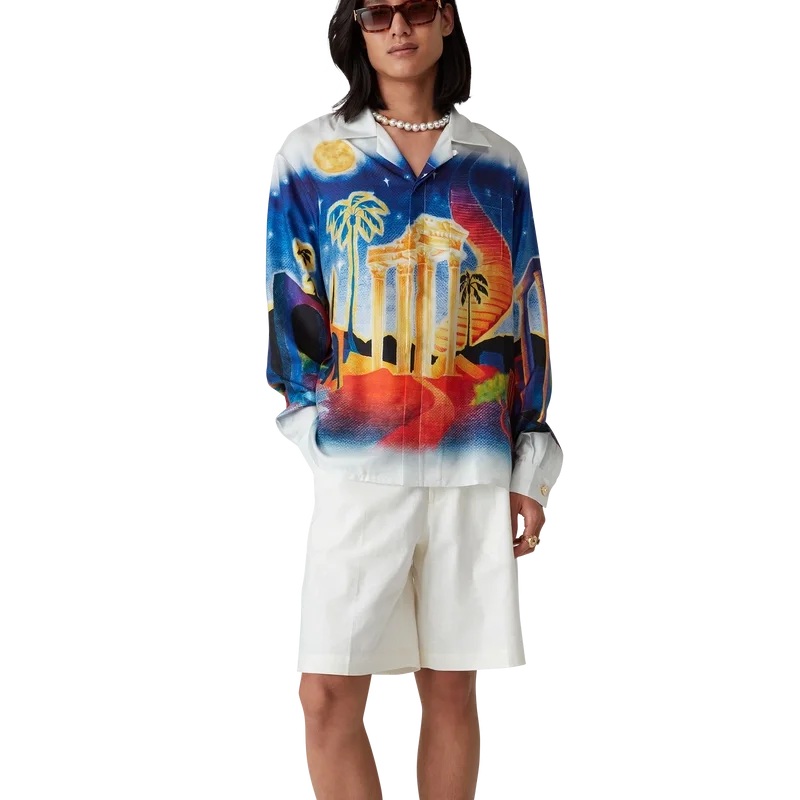 Cămașa din mătase Midnight Acropolis este un model cu mâneci lungi și imprimeu pe toată suprafața, confecționată din țesătură de mătase twill, care aduce un omagiu frumoasei nopți din Grecia Antică, cu lumina superbă a templului și a cerului. Completată cu guler cubanez, nasturi emailati cu margine aurie pe mâneci și închidere cu nasturi în față, cu nasturi din corozo cu logo-ul Cc intercalat.