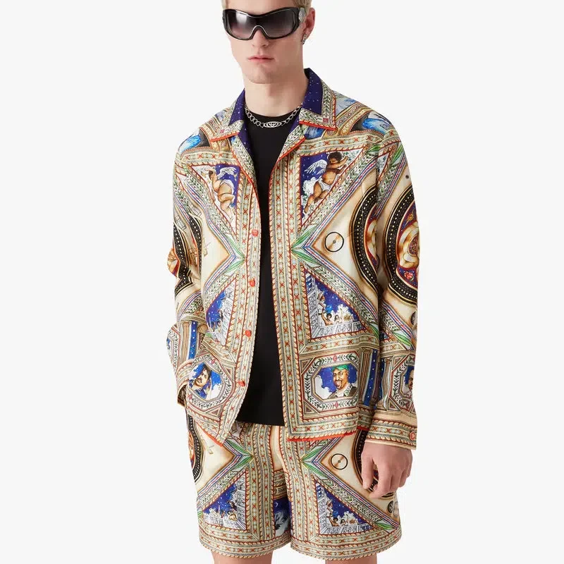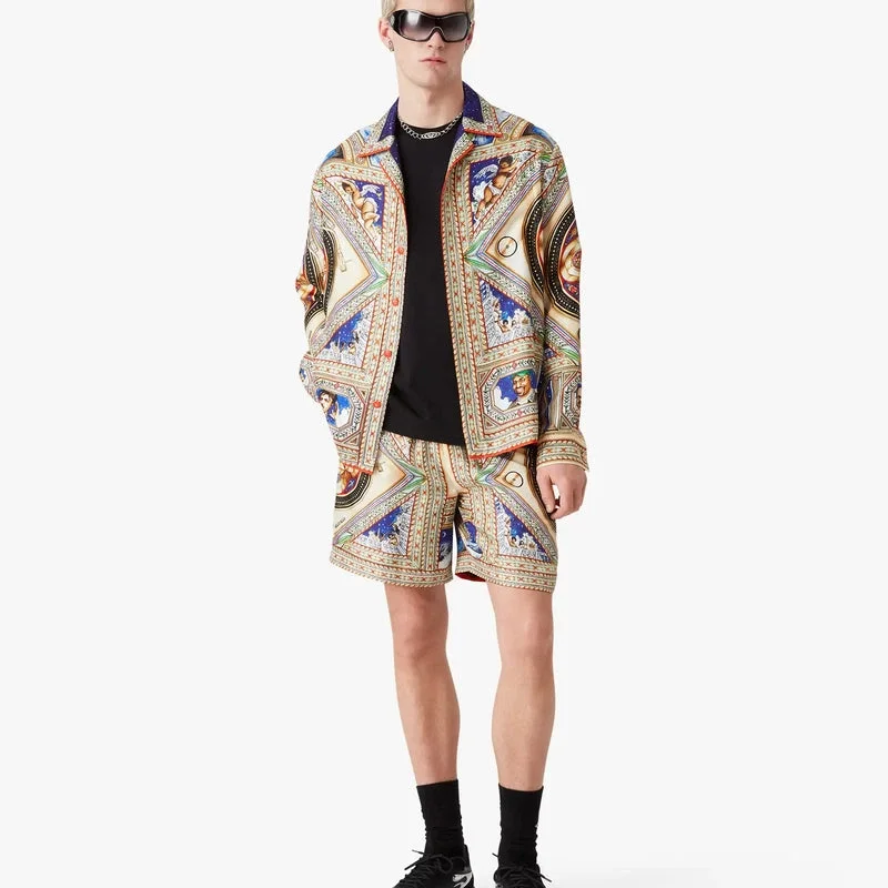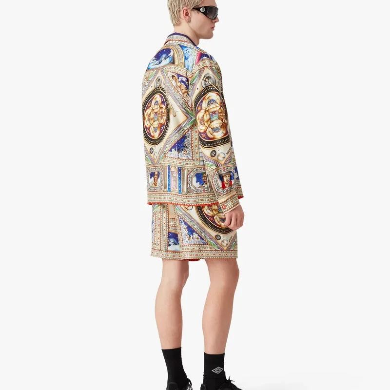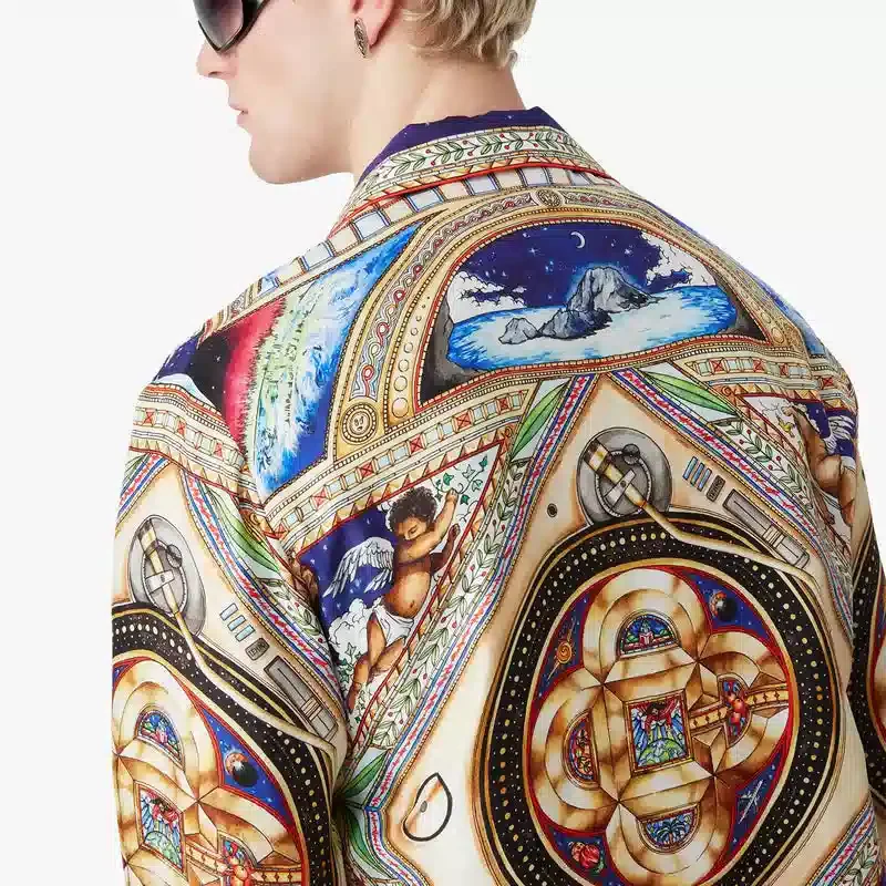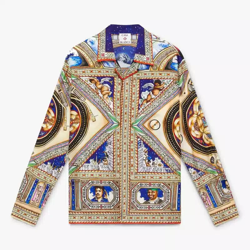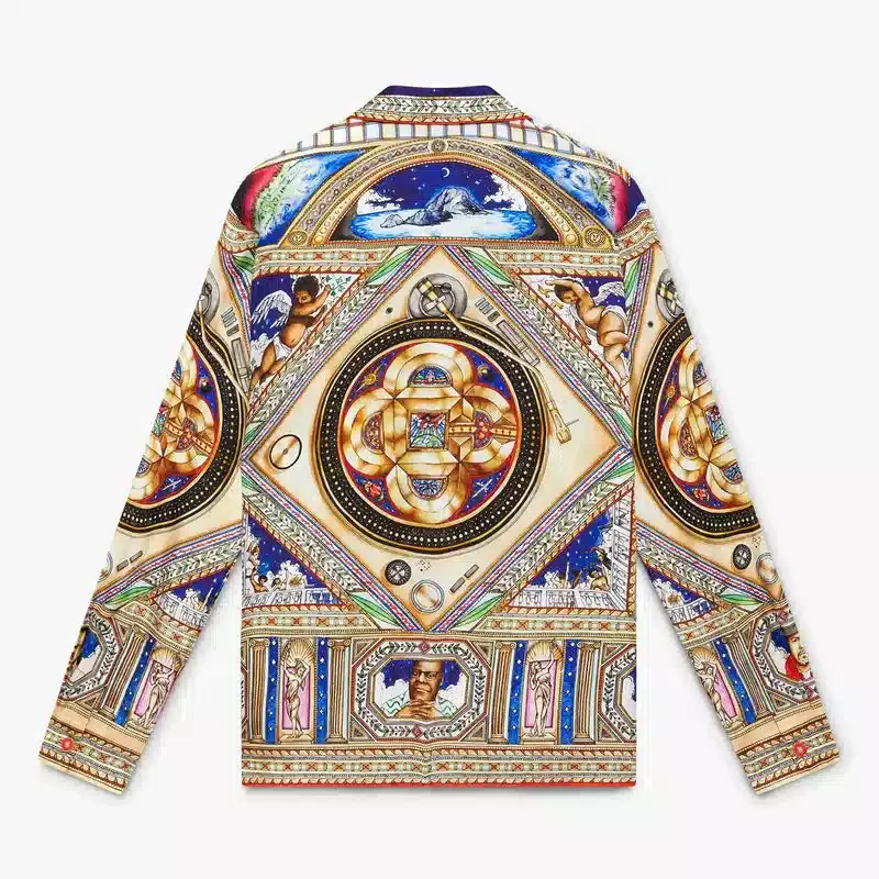 Cămașa din mătase cu mâneci lungi Plafond Orne De Musique are un imprimeu pe toată suprafața, cu motive inspirate de tavanele renascentiste pictate în mod elaborat și complex, care ilustrează temele atemporale ale muzicii și dansului. Completată cu guler în stil cubanez, închidere cu nasturi, nasturi din corozo cu logo-ul Cc intercalat, un buzunar la piept, nasturi emailate cu margine aurie ale casei de modă pe manșete, precum și detalii la guler, placket și tiv.