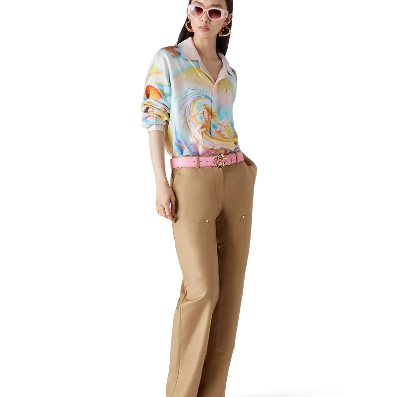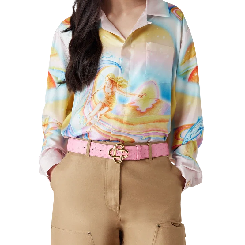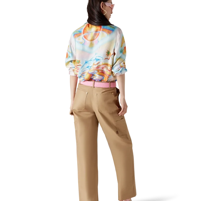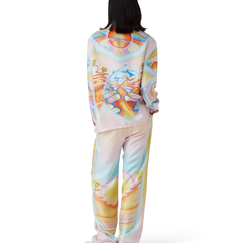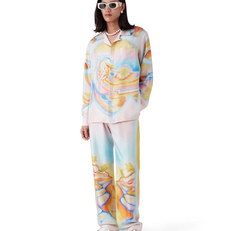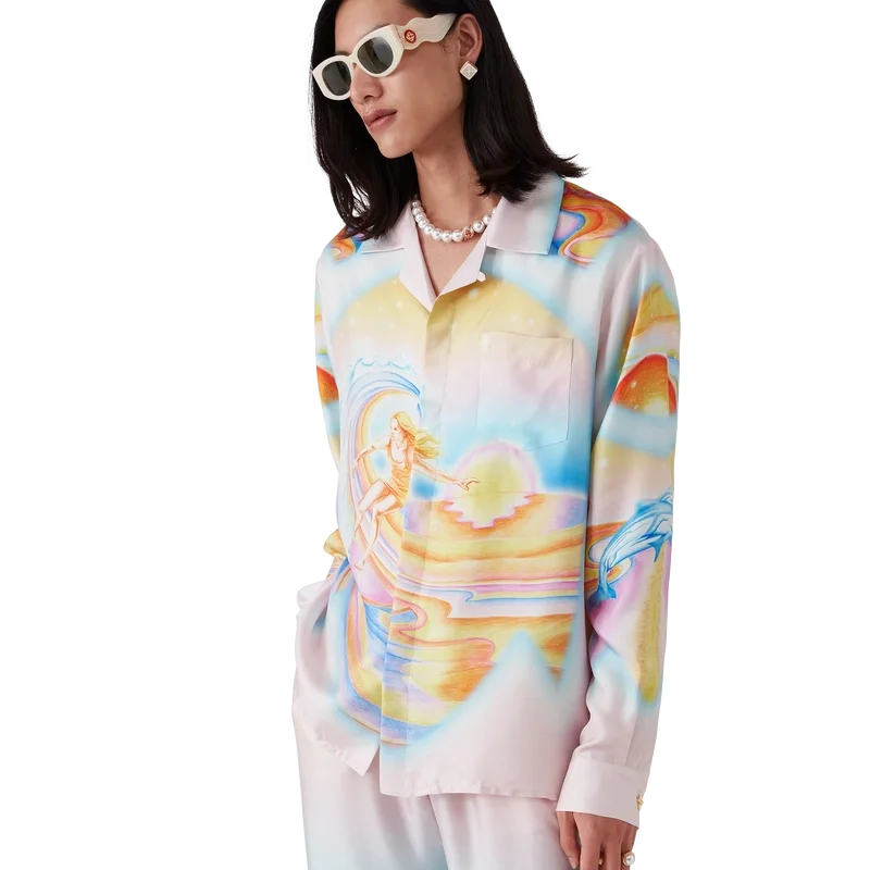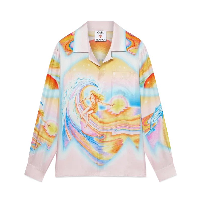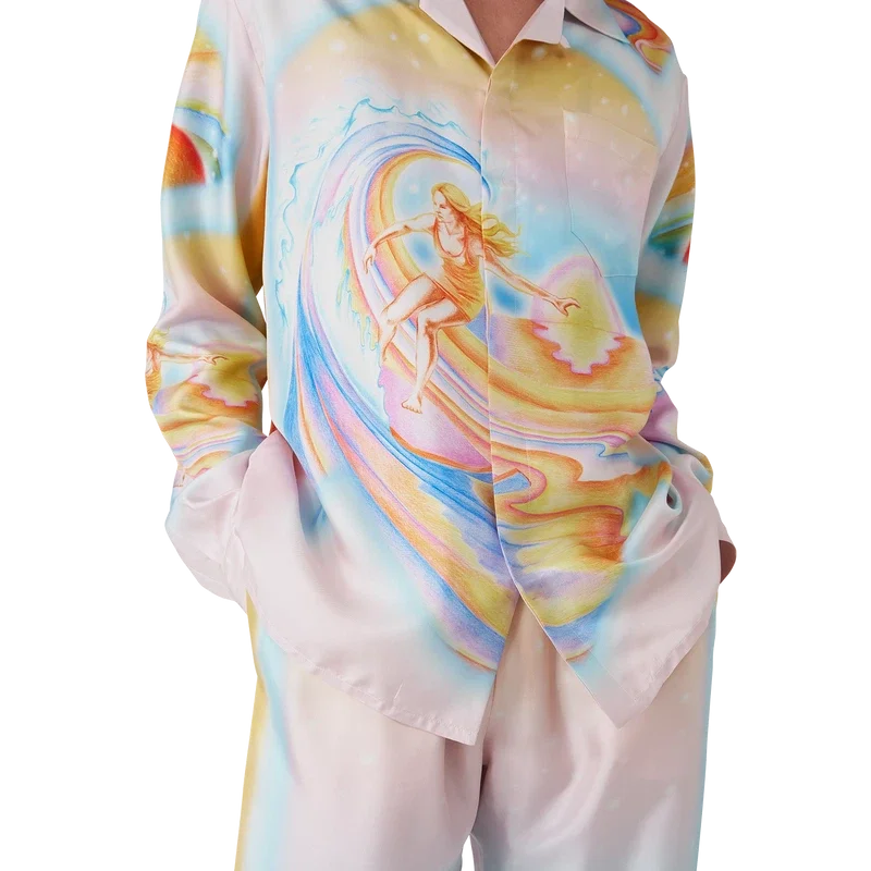 Cămașa din mătase Psychedelic Nirvana are un design imprimat pe toată suprafața, fiind confecționată din țesătură de mătase twill, cu un imprimeu inspirat de plăcile de surf din California anilor ’70, realizate cu aerograful, folosind culori pastelate care conferă imprimeului o senzație aproape onirică, idealistă. Finisată cu guler cubanez, buzunar la piept, închidere cu nasturi ascunși din corozo și nasturi emailati cu margine aurie la fiecare manșetă.