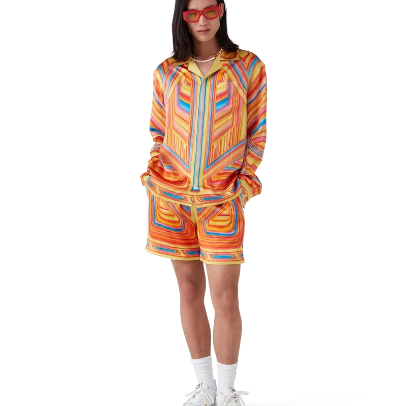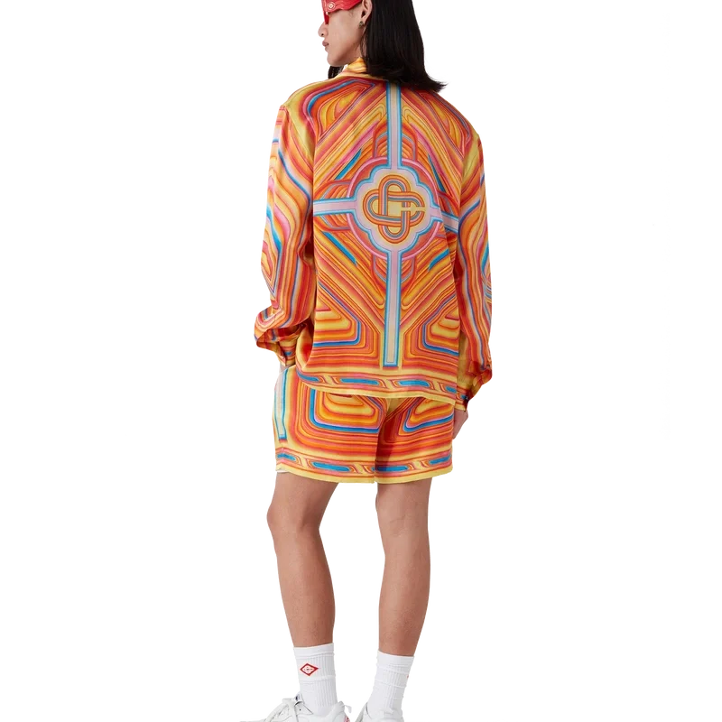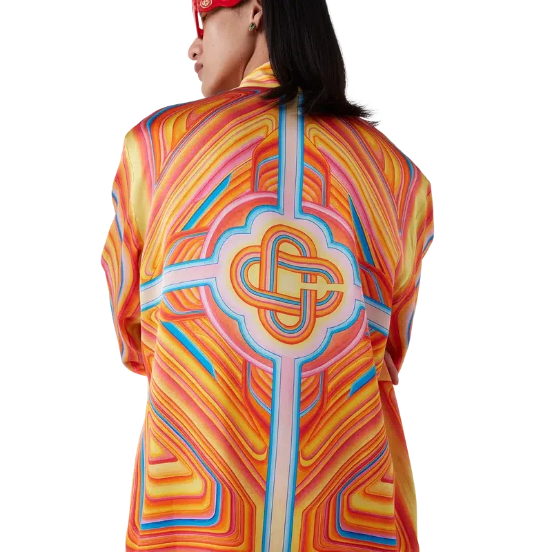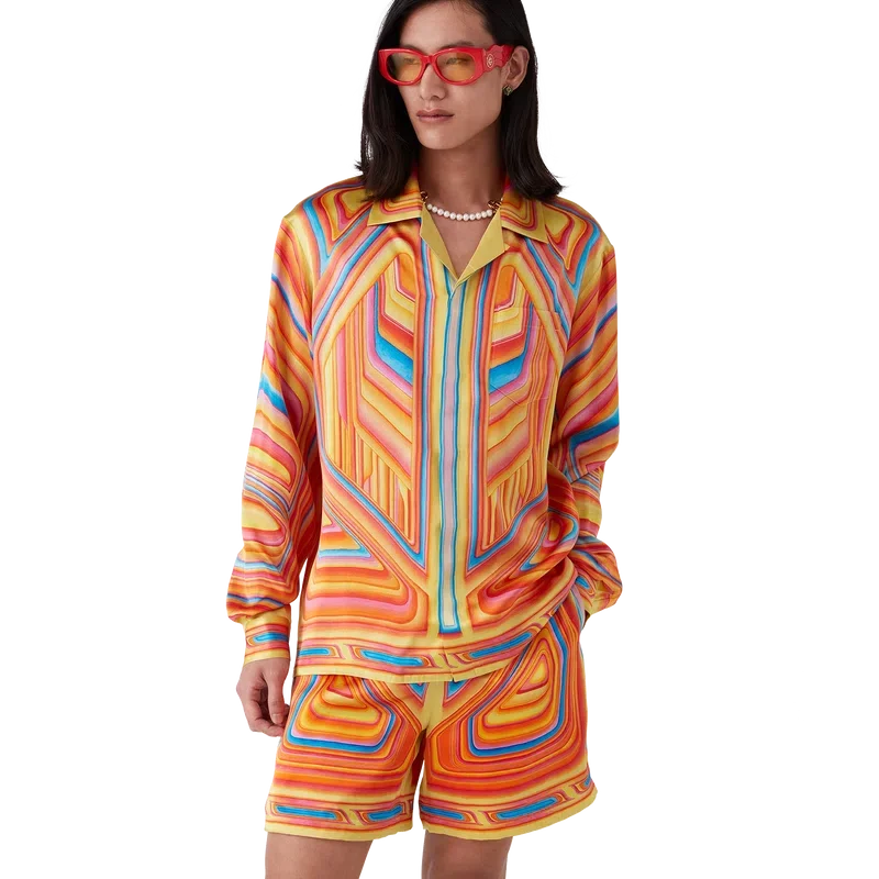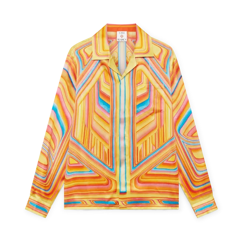 Cămașa din mătase Low Rider prezintă un imprimeu integral, fiind confecționată din satin de mătase și decorată cu un motiv artistic care face referire la culorile pop și la tehnicile de pictură cu aerograf utilizate la mașinile Low Rider, alături de logo-ul Casablanca. Are guler cubanez, buzunar la piept, închidere cu nasturi ascunși din corozo cu inițialele „Cc” întrețesute și un nasture emailat cu margine aurie la fiecare manșetă.