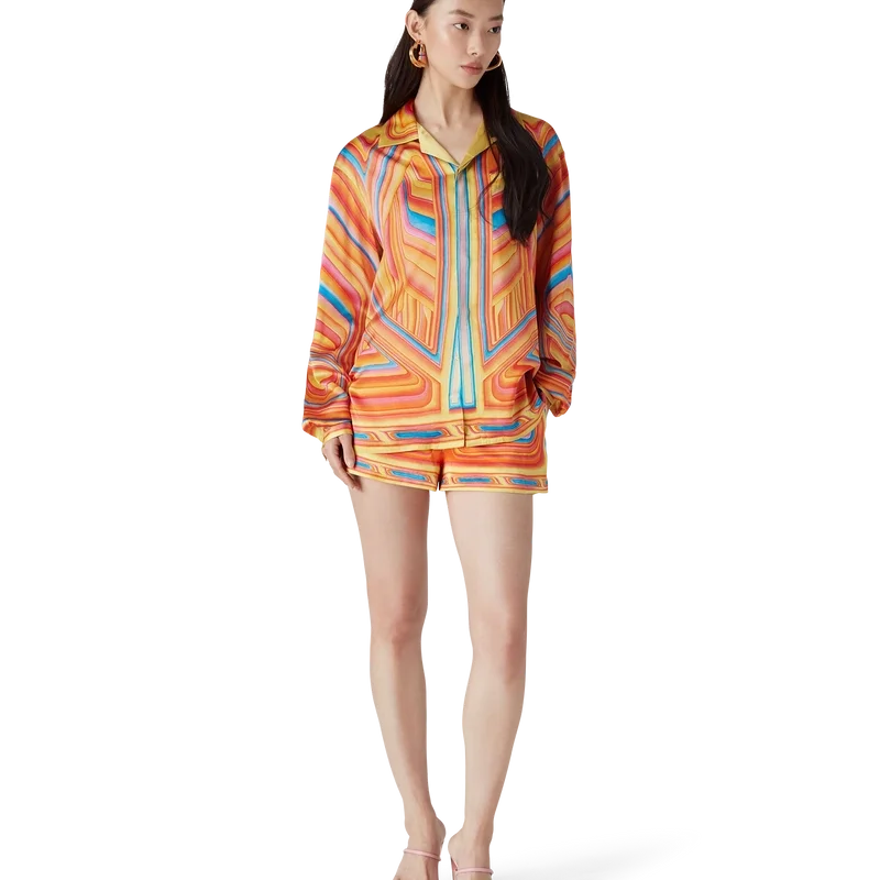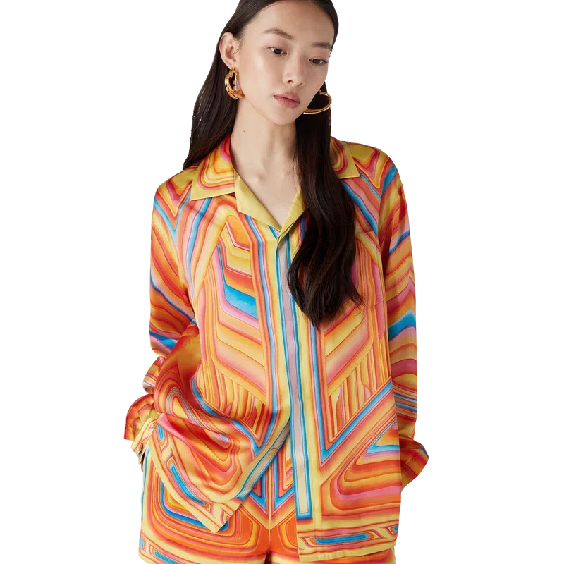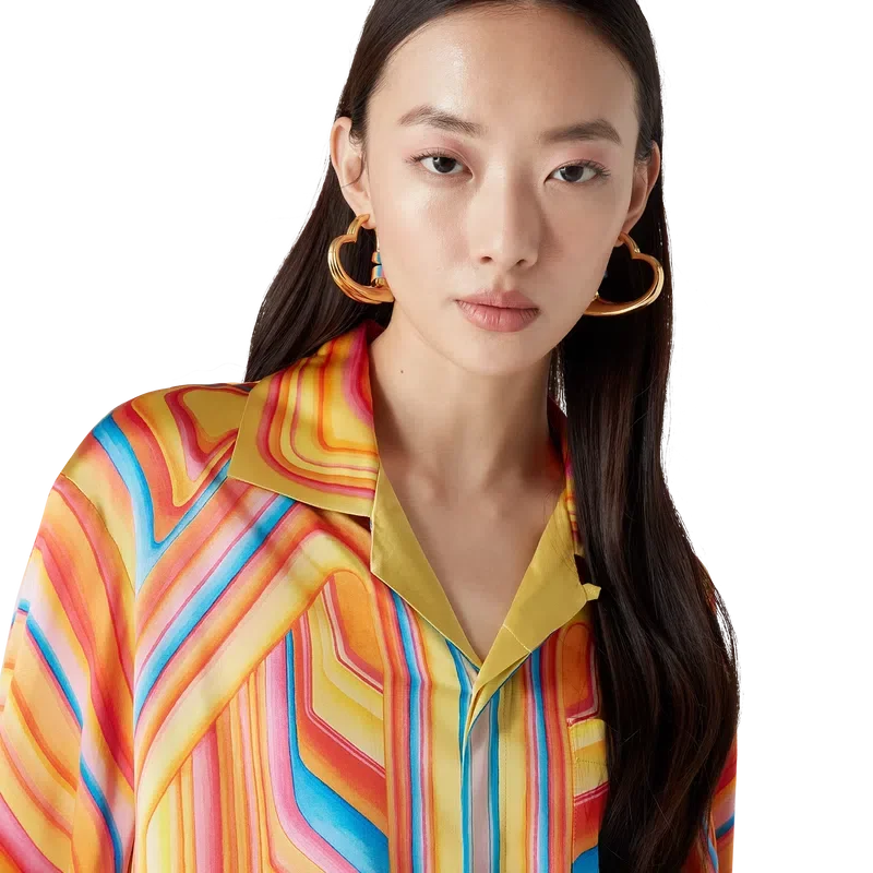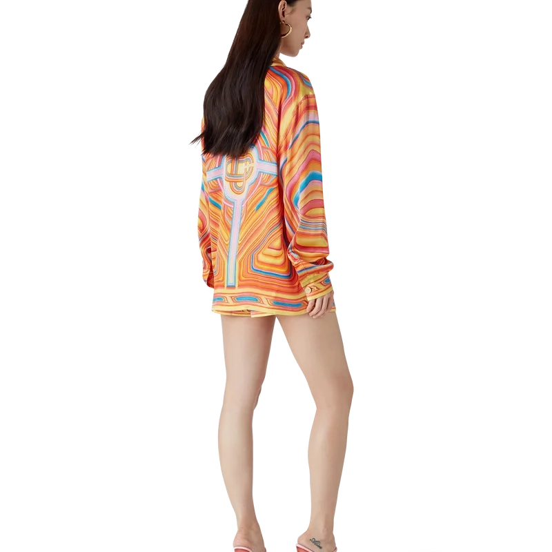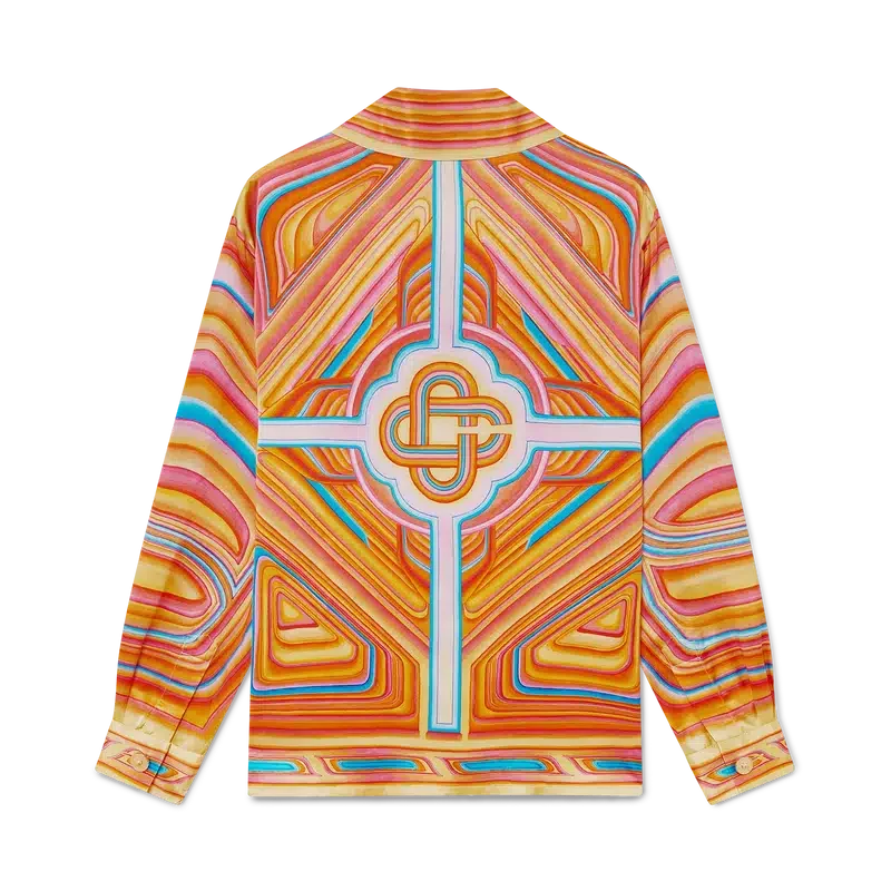 Cămașa din mătase Low Rider are un imprimeu pe toată suprafața, fiind confecționată din țesătură de satin de mătase, cu un design care face referire la culorile pop și tehnicile de pictură cu aerograf utilizate pe mașinile Low Rider, cu logo-ul Casablanca. Are guler cubanez, buzunar la piept, închidere ascunsă cu nasturi interconectați din corozo și un nasture emailat cu margine aurie pe fiecare manșetă.
