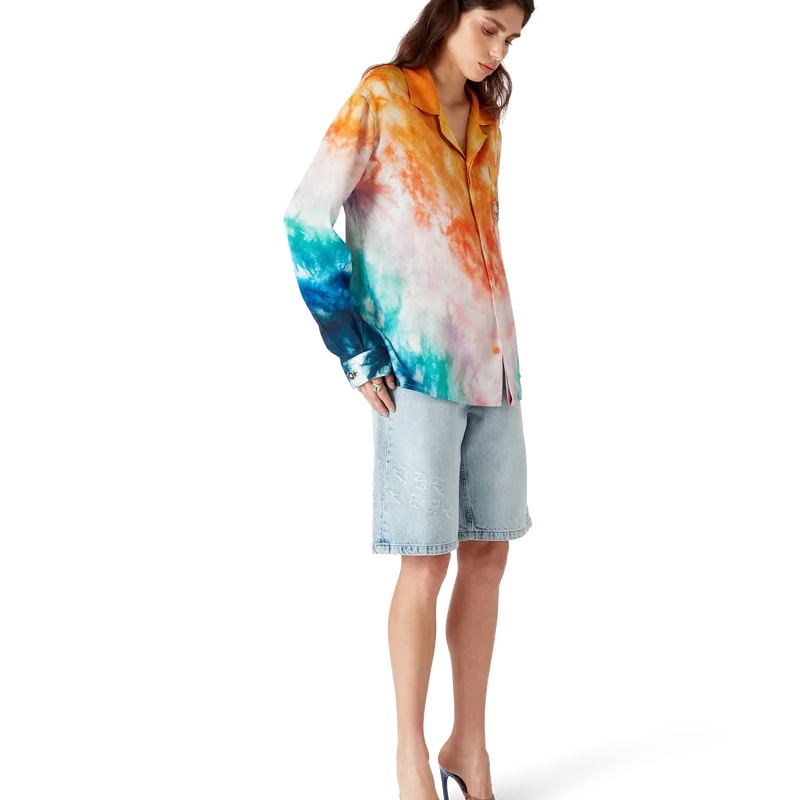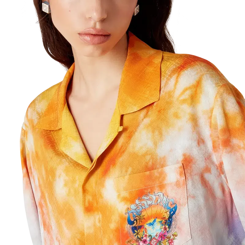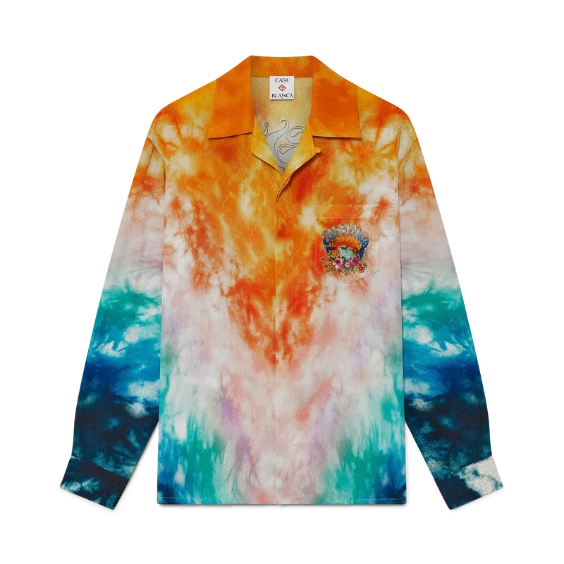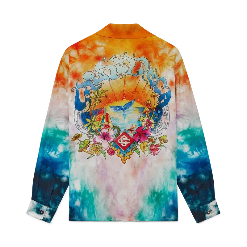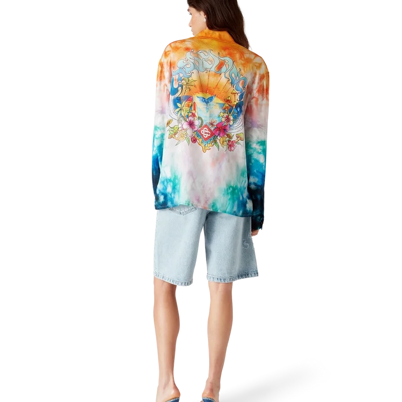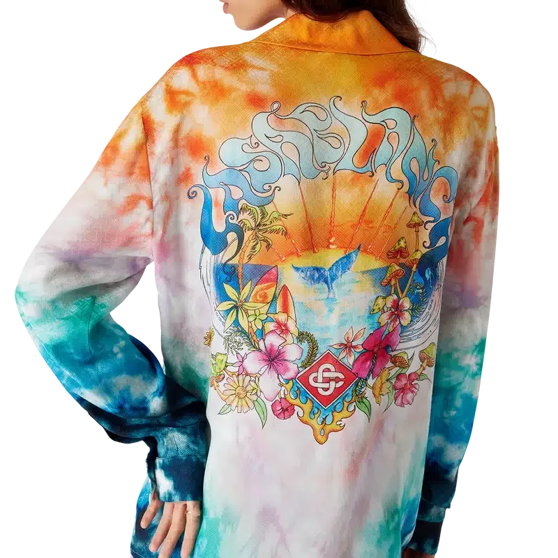 Cămașa din mătase cu mâneci lungi Surf Trip are un design imprimat, realizat din țesătură de mătase, cu motive de sezon inspirate de cultura vintage a surfului din Malibu, folosind tipografia din acea epocă, pe un fundal tie-dye care face referire la cultura hippy. Este completată cu guler cubanez, închidere cu nasturi ascunși, nasturi din corozo cu logo-ul Cc intercalat și nasturi emailati cu margine aurie la manșete.