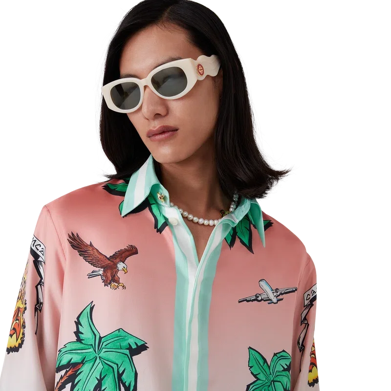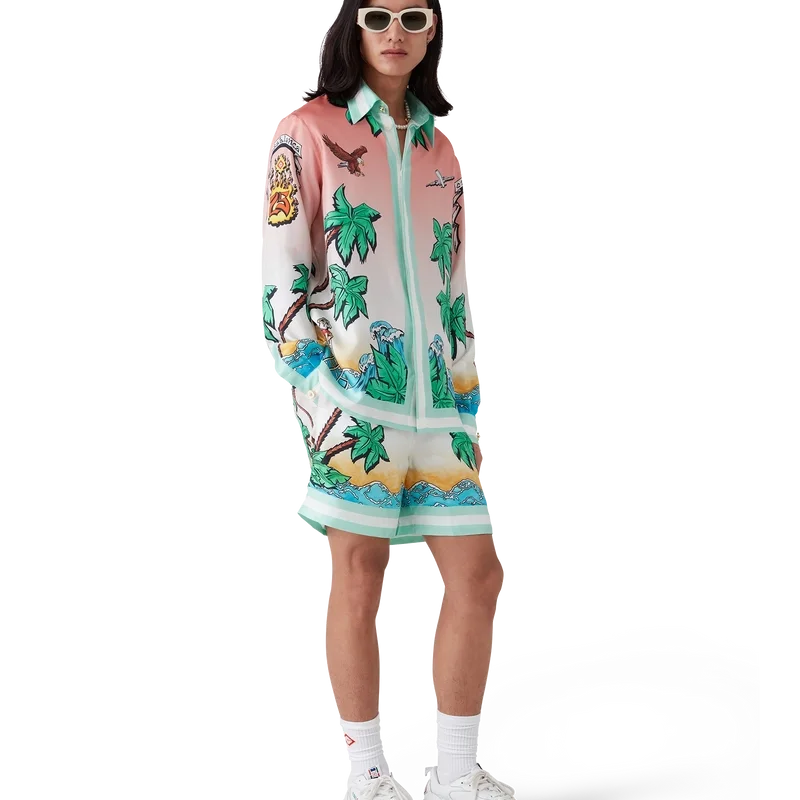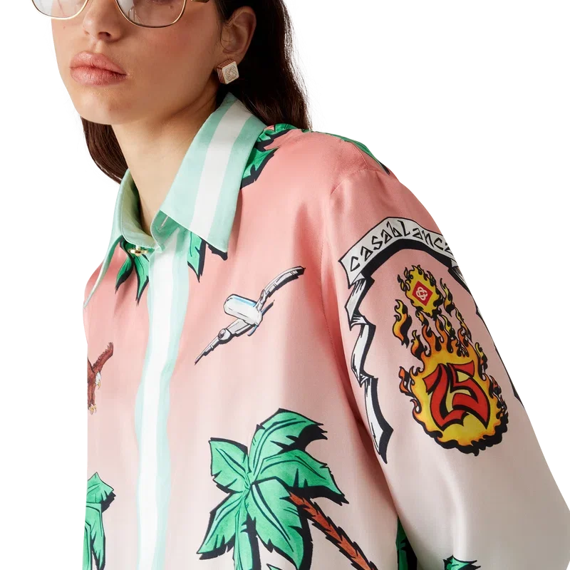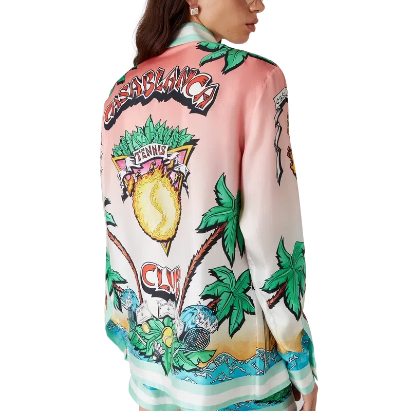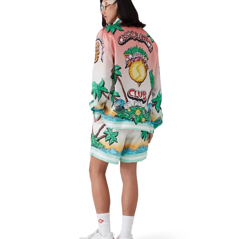 Cămașa din mătase Tennis Club are un imprimeu pe toată suprafața, cu o interpretare a imprimeului Tennis Club al casei de modă într-o temă de surf, în stilul unui schiț grafic desenat cu markere, confecționată din țesătură de mătase twill. Finisată cu guler cubanez, buzunar la piept, închidere cu nasturi ascunși din corozo cu logo CC intercalat și un nasture emailat cu margine aurie pe fiecare manșetă.