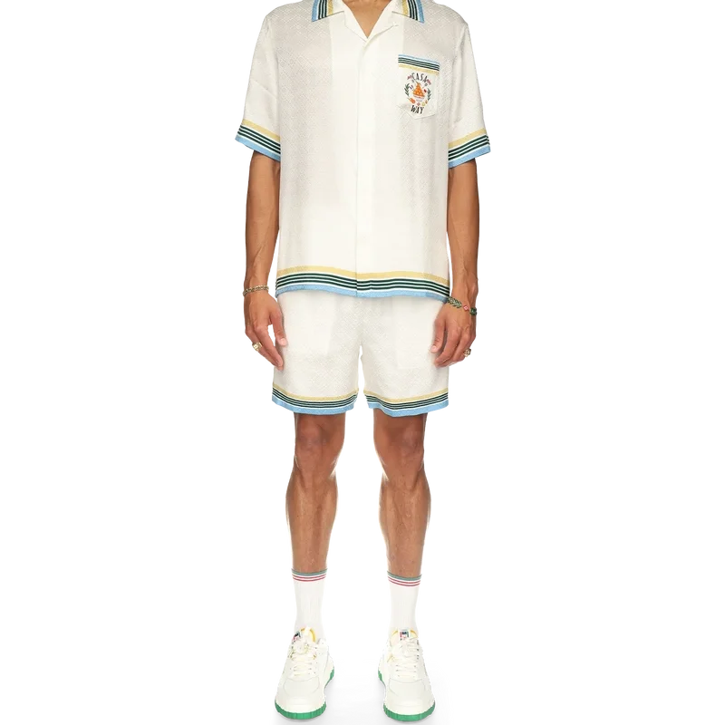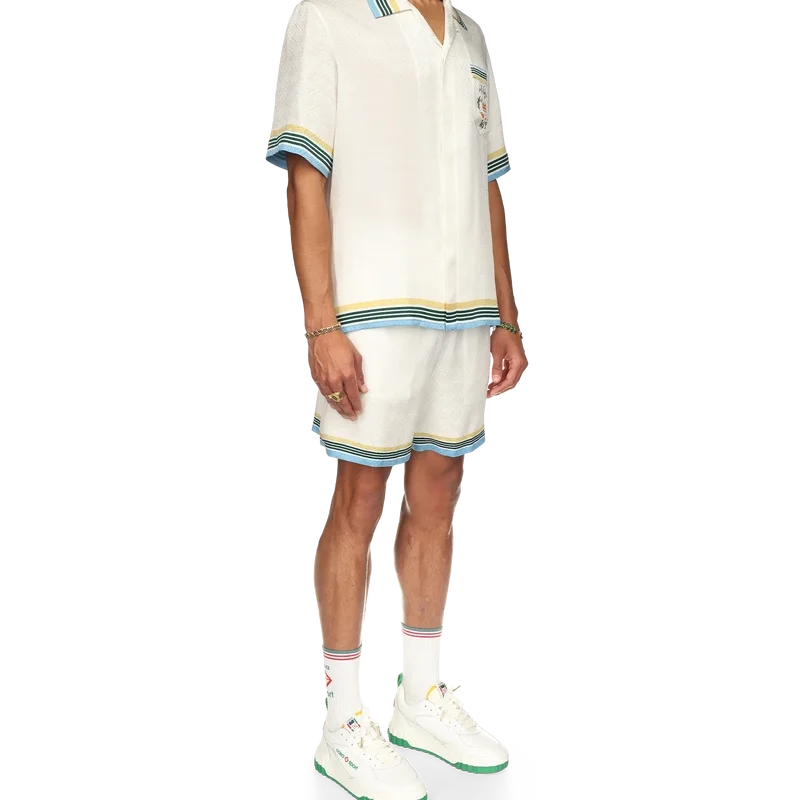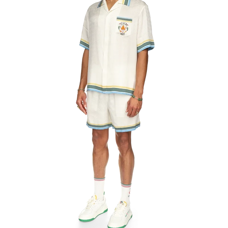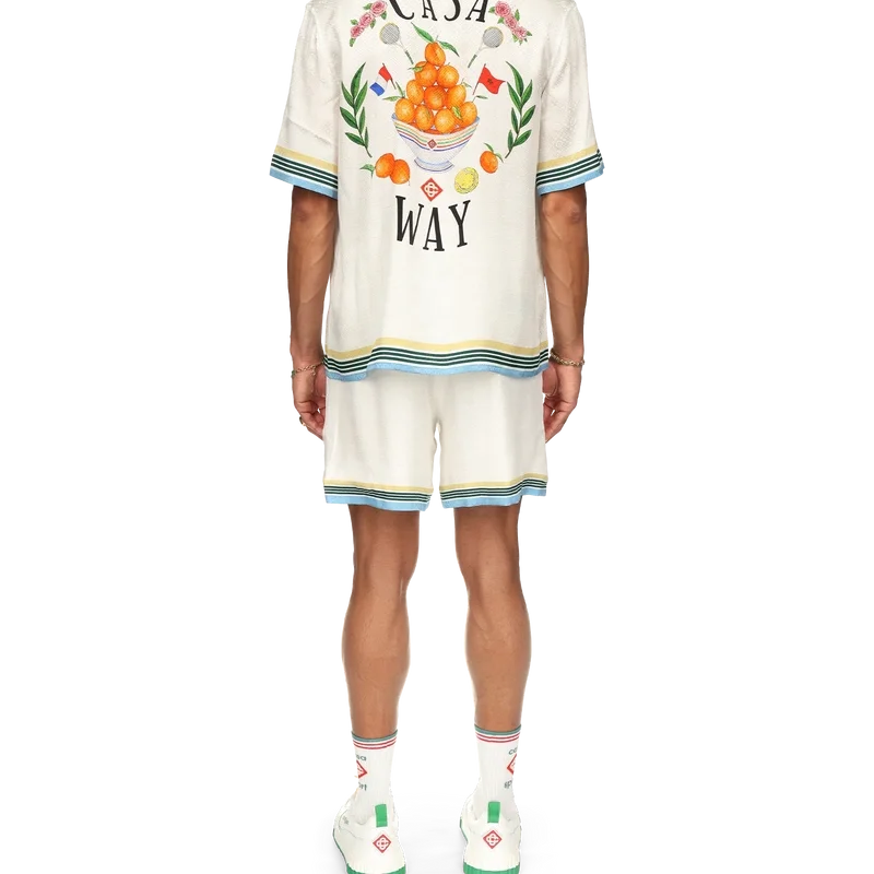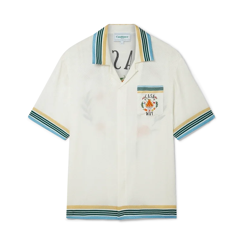 Cămășa din mătase Casa Way prezintă un imprimeu cu opera de artă iconografică a casei, piramida portocalie, cu rachete de tenis și detalii florale reinterpretate pentru acest sezon. Finisată cu o etichetă cu marca Casablanca și detalii contrastante pe guler, manșete, tiv și buzunarul de la piept – concepută pentru o croială clasică.