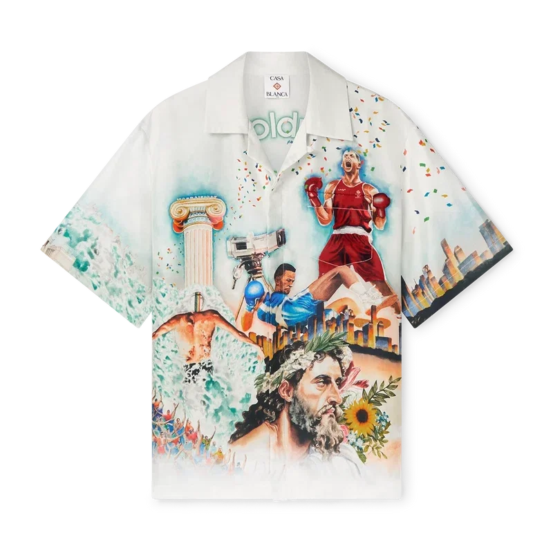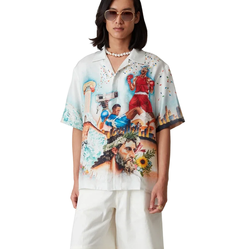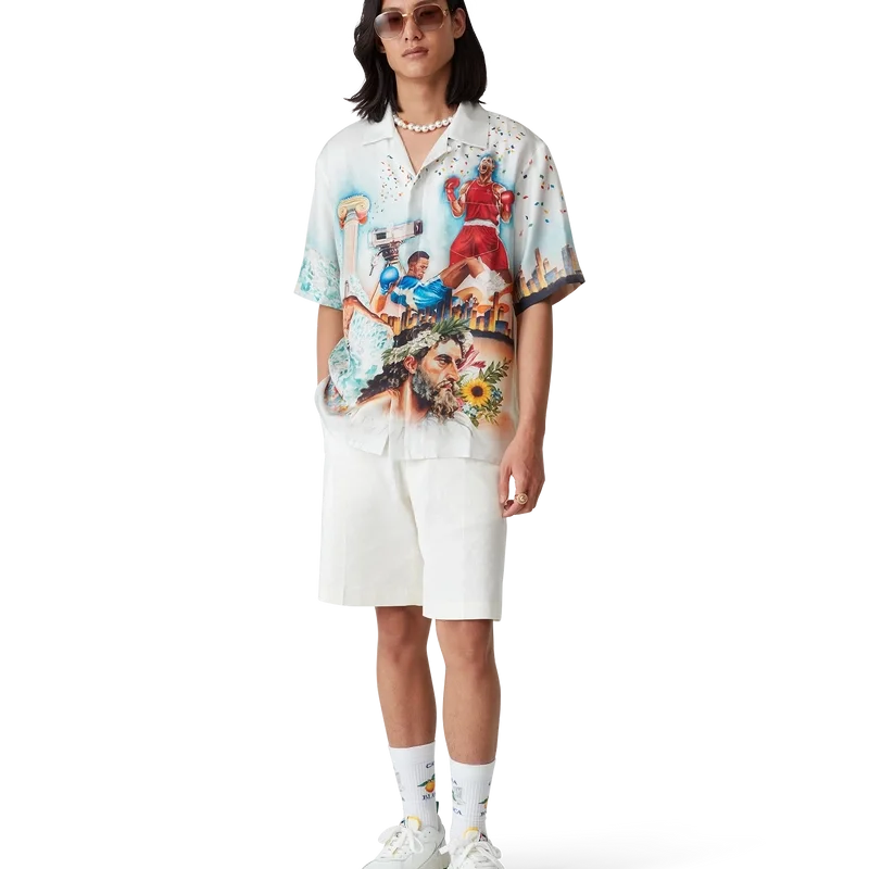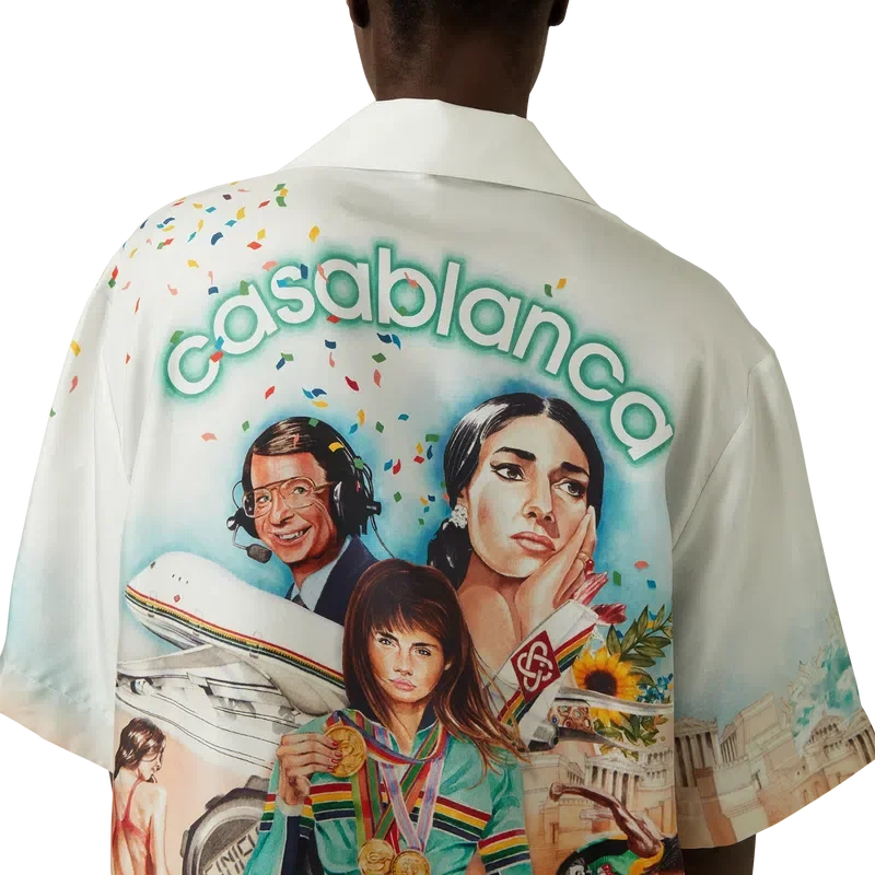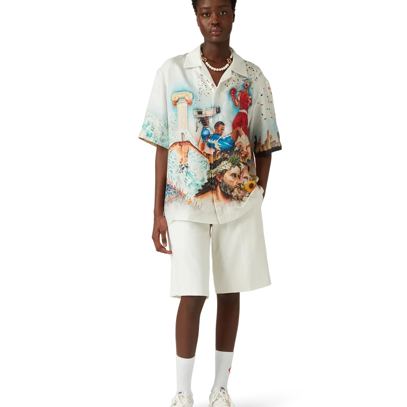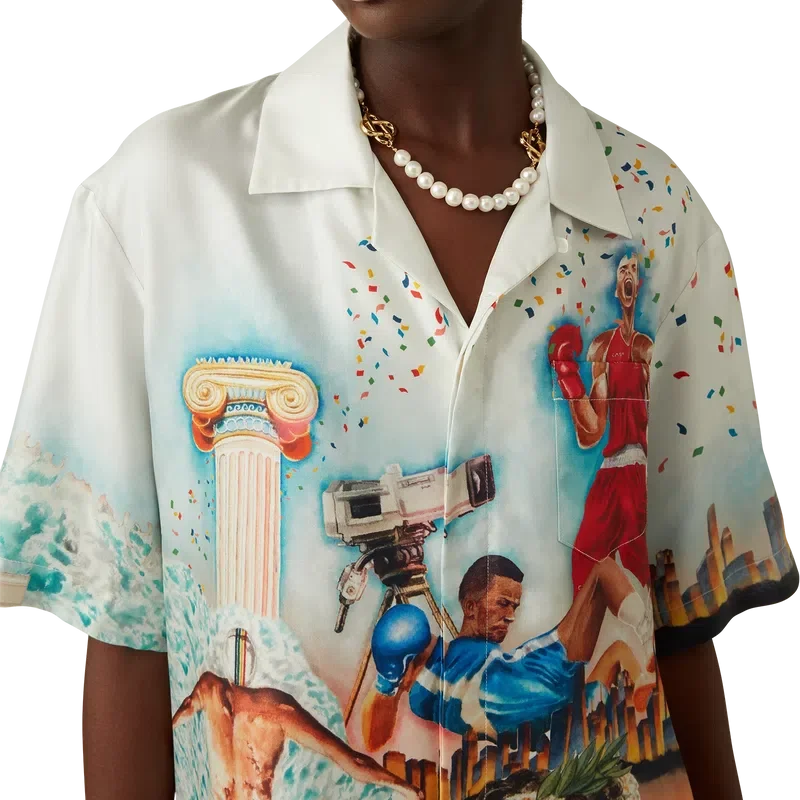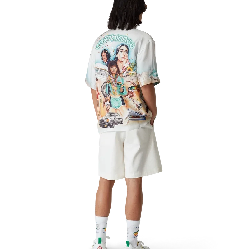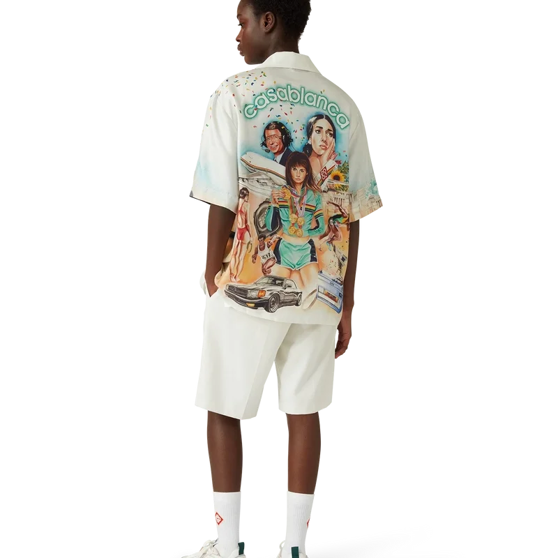 Cămașa din mătase Celebration Du Sport este un model cu mâneci scurte și imprimeu integral, confecționată dintr-o țesătură de mătase twill, cu un imprimeu de sezon inspirat de interpretarea casei de modă a unui afiș de film clasic, cu propriile noastre personaje în acea lume. Completată cu nasturi din corozo cu logo-ul Cc intercalat, închidere cu nasturi ascunși, un buzunar la piept și guler cubanez.