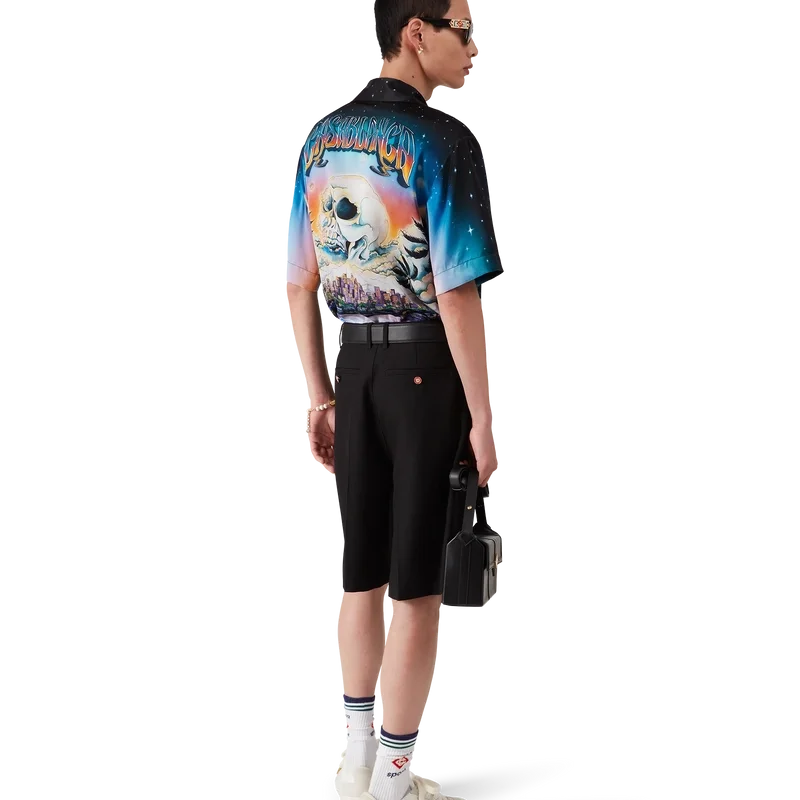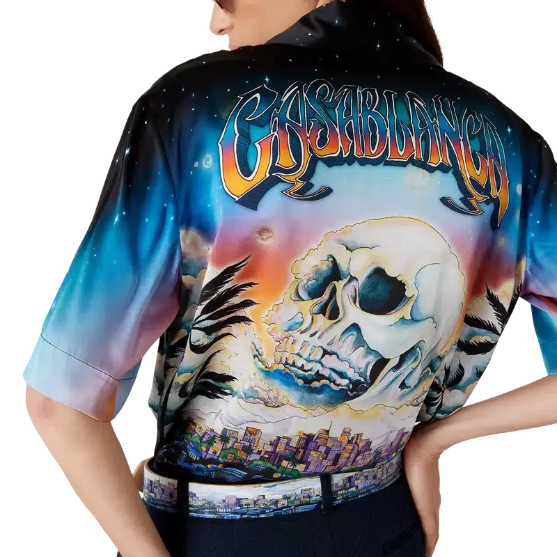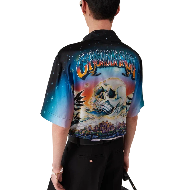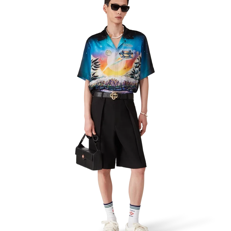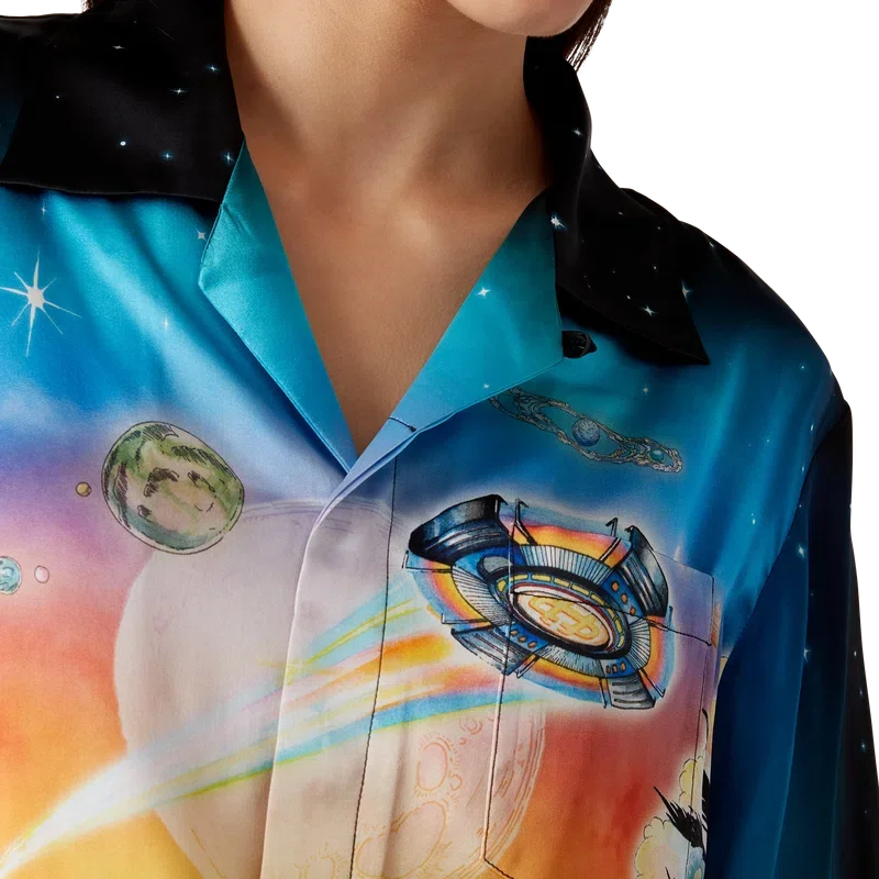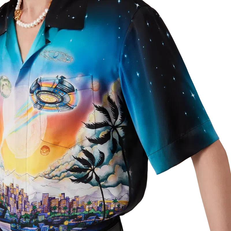 Cămășa din mătase La Pramonition este un model cu mâneci scurte, confecționată dintr-o țesătură de satin de mătase imprimată, prezentând grafica sezonului, inspirată de o viziune misterioasă a orizontului orașului La noaptea, cu elemente OZN care fac referire la inspirația sci-fi vintage. Completată cu guler cubanez, buzunar la piept, închidere cu nasturi ascunși din corozo cu Cc interconectat.