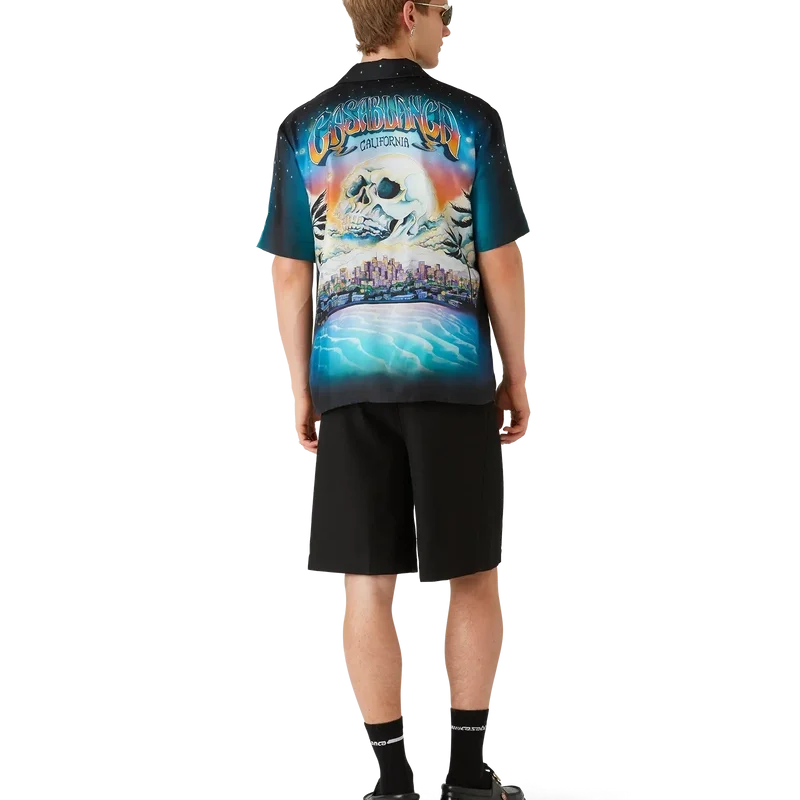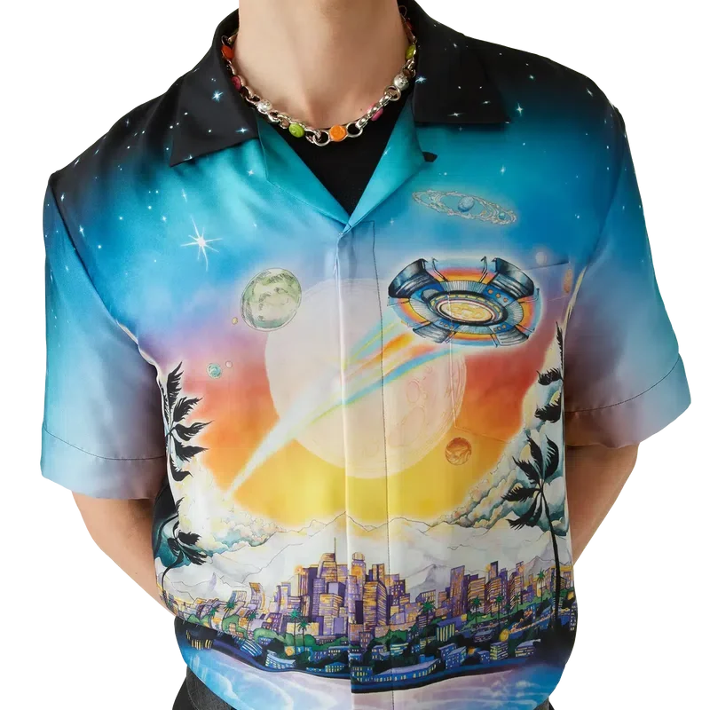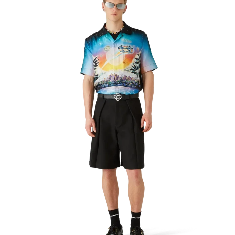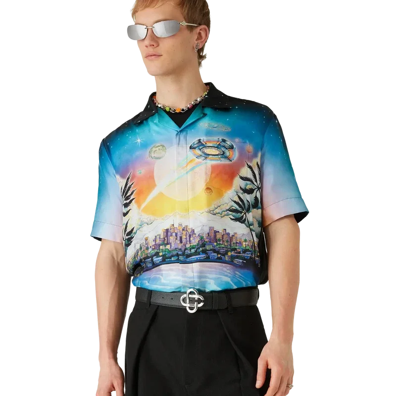 Cămășa din mătase cu mâneci scurte La Pramonition are un design imprimat rafinat, cu o grafică inspirată de o viziune misterioasă a orizontului orașului Los Angeles pe timp de noapte, cu elemente OZN care fac referire la inspirația sci-fi vintage. Este completată de un guler cubanez, un buzunar la piept și închidere cu nasturi ascunși din corozo cu inițialele CC.